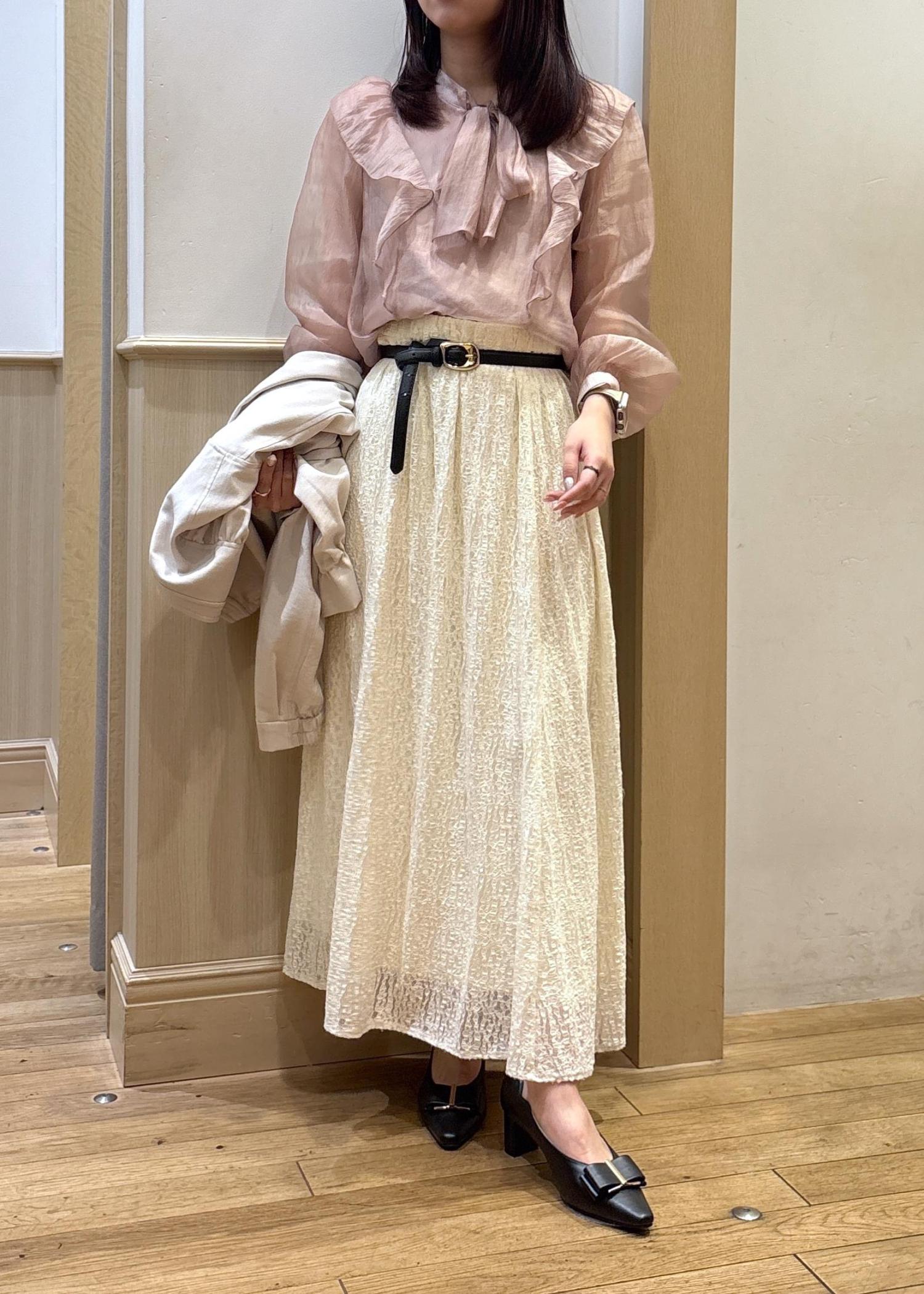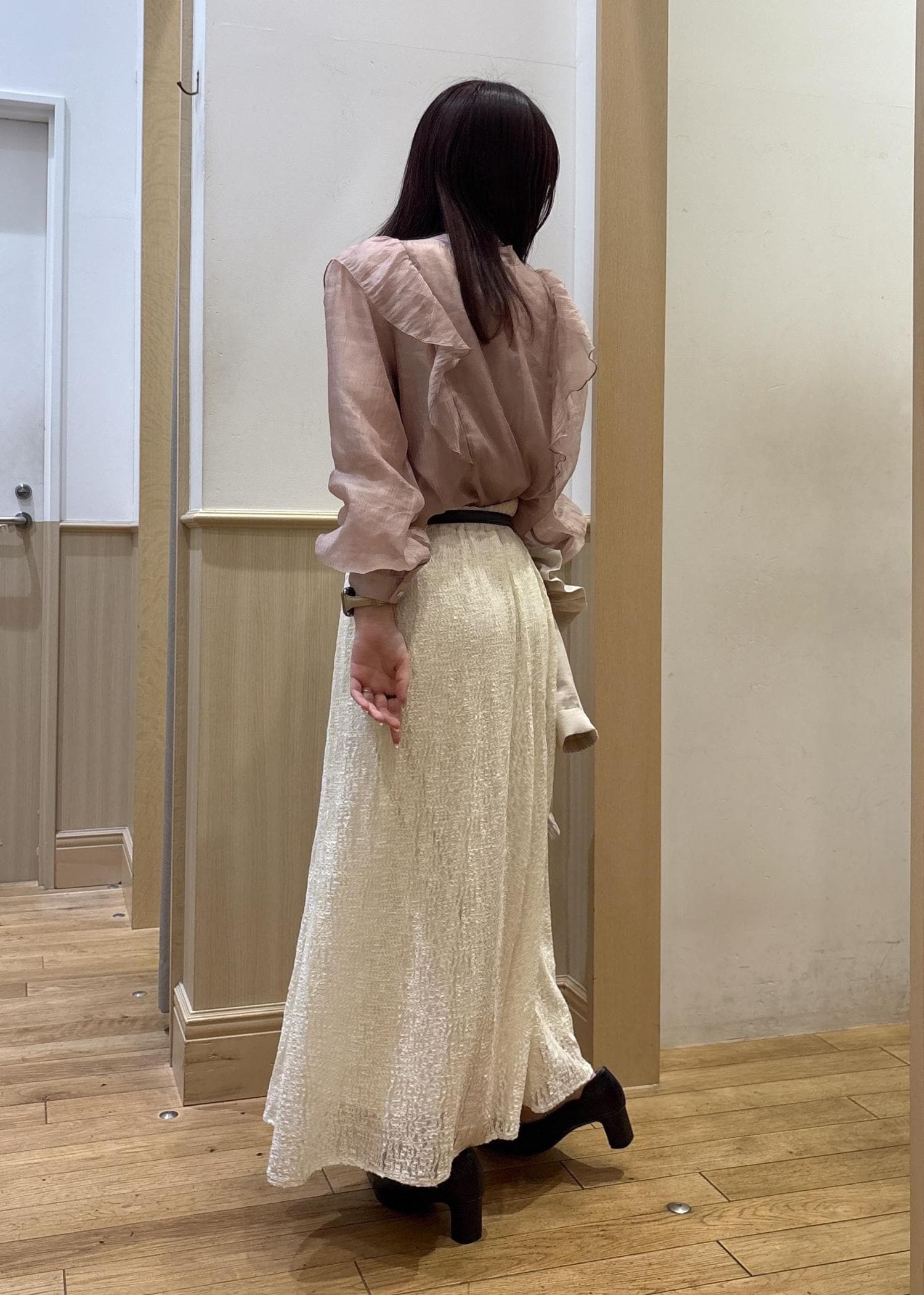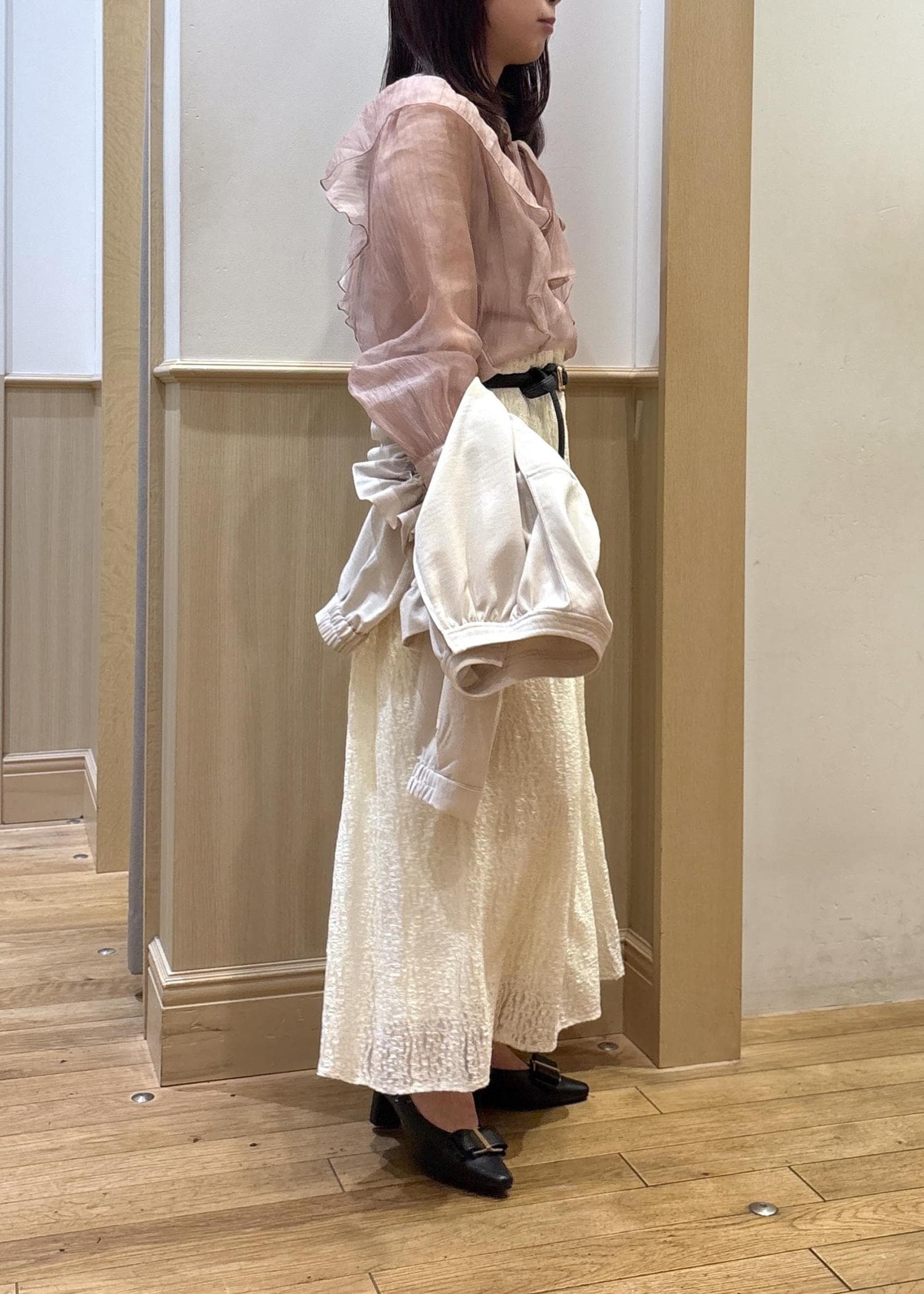 肩のラッフルが可愛いです。肩幅がしっかりあるタイプですが、生地が柔らかく、腕にシアー感があるため、膨張することなくすっきり見えもしてくれます。