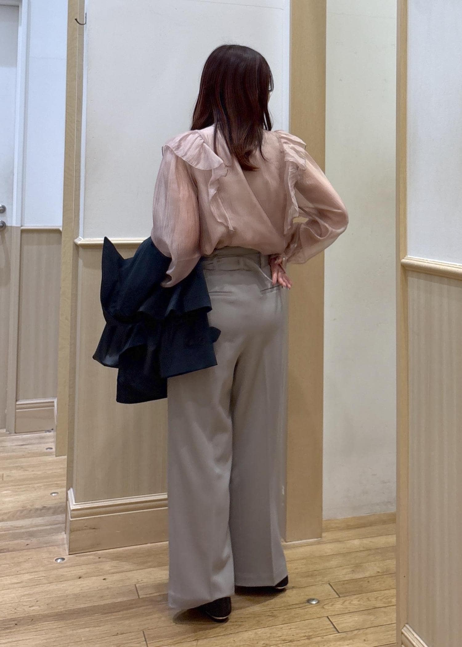 肩のラッフルが可愛いです。肩幅がしっかりあるタイプですが、生地が柔らかく、腕にシアー感があるため、膨張することなくすっきり見えもしてくれます。