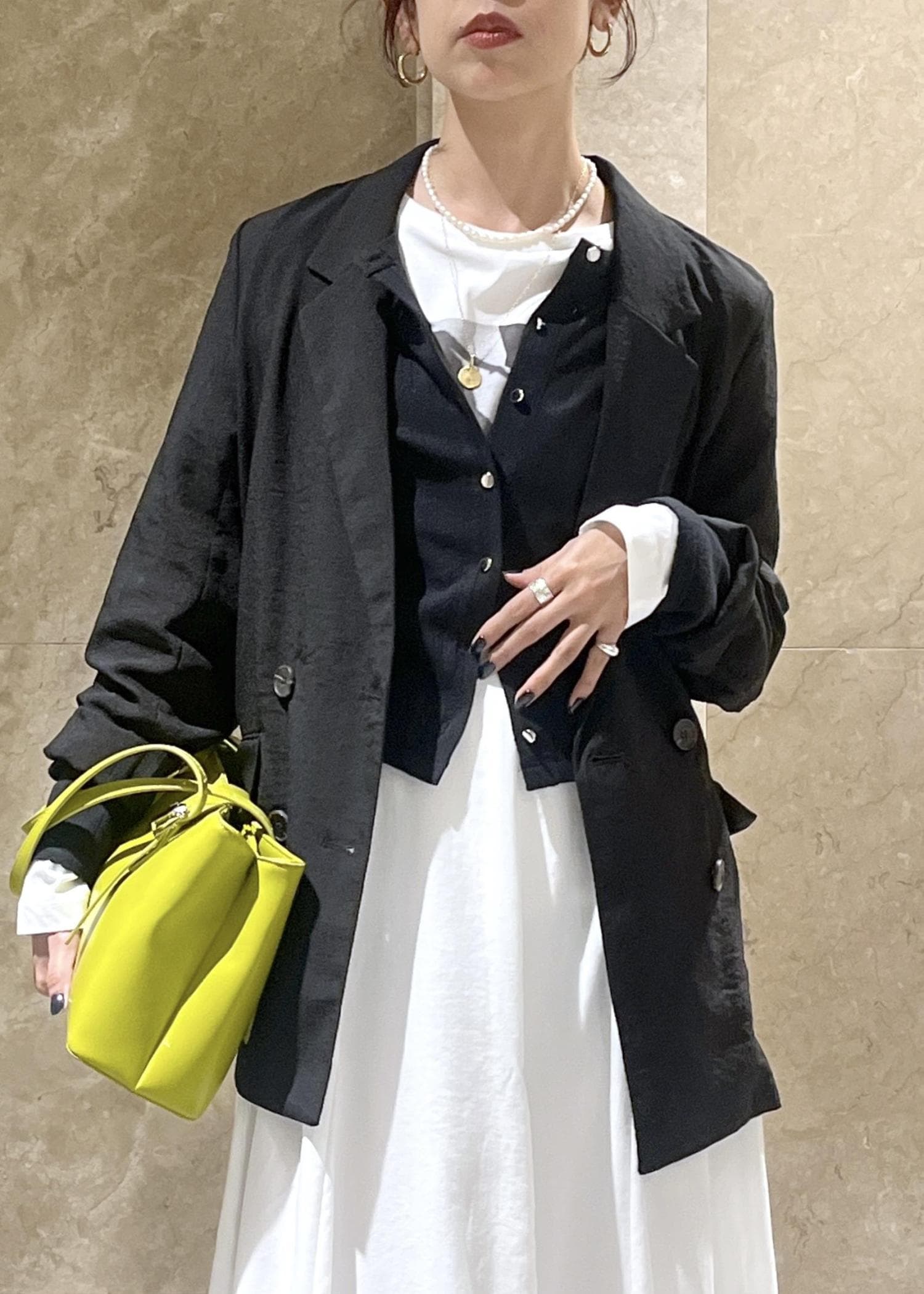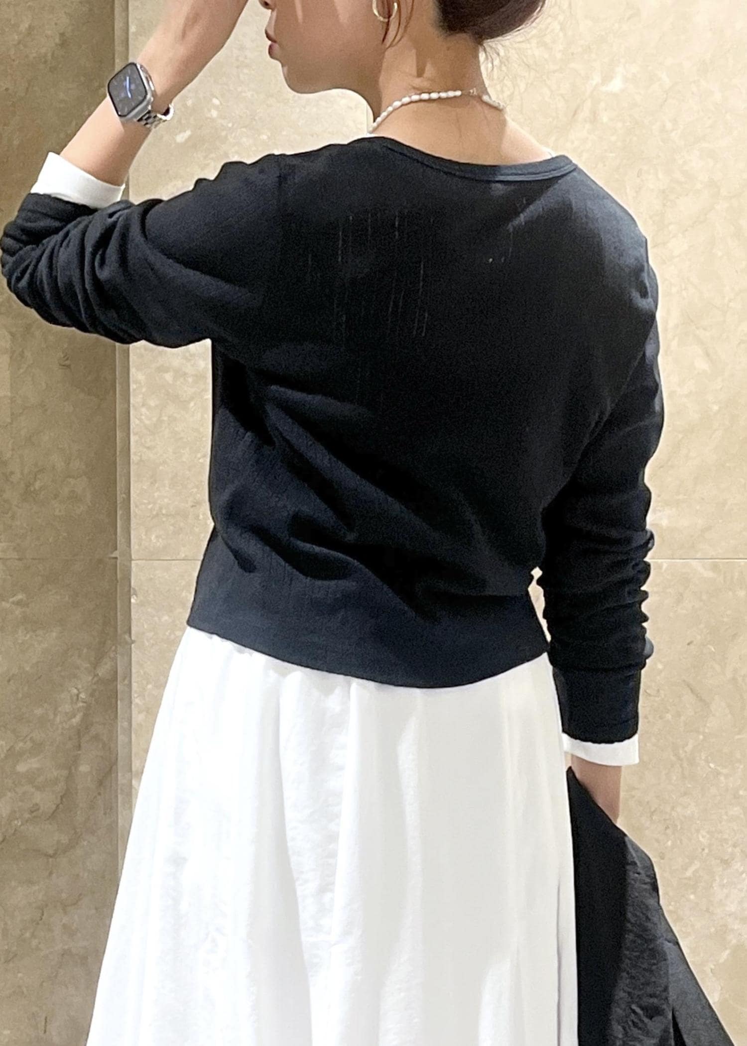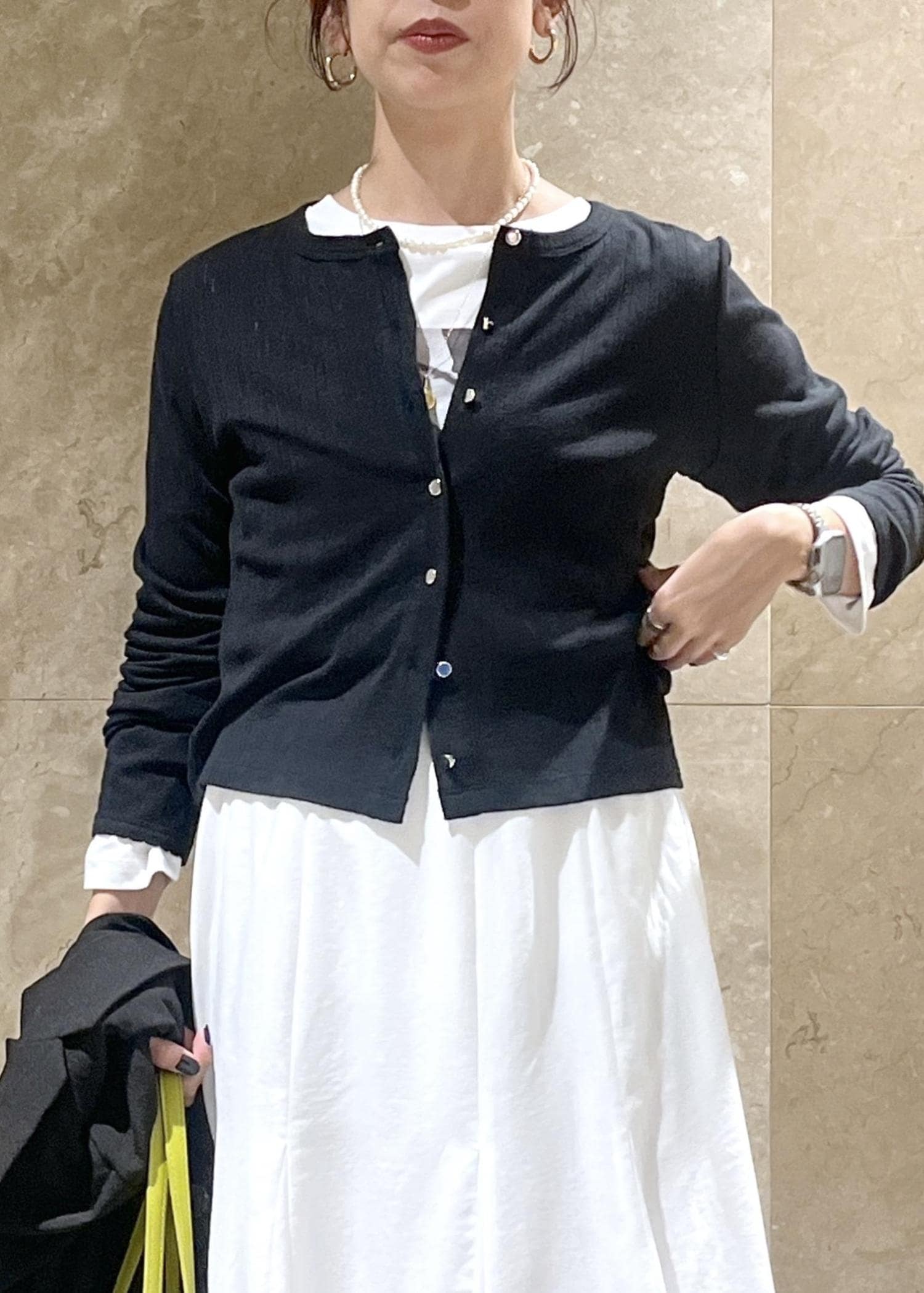 シンプルに一枚で着るのはもちろん、軽めの羽織としても重宝間違いなし◎持ち歩きにも嵩張らず、ニット素材のカーディガンより、手軽にお手入れができるのも嬉しい。 -