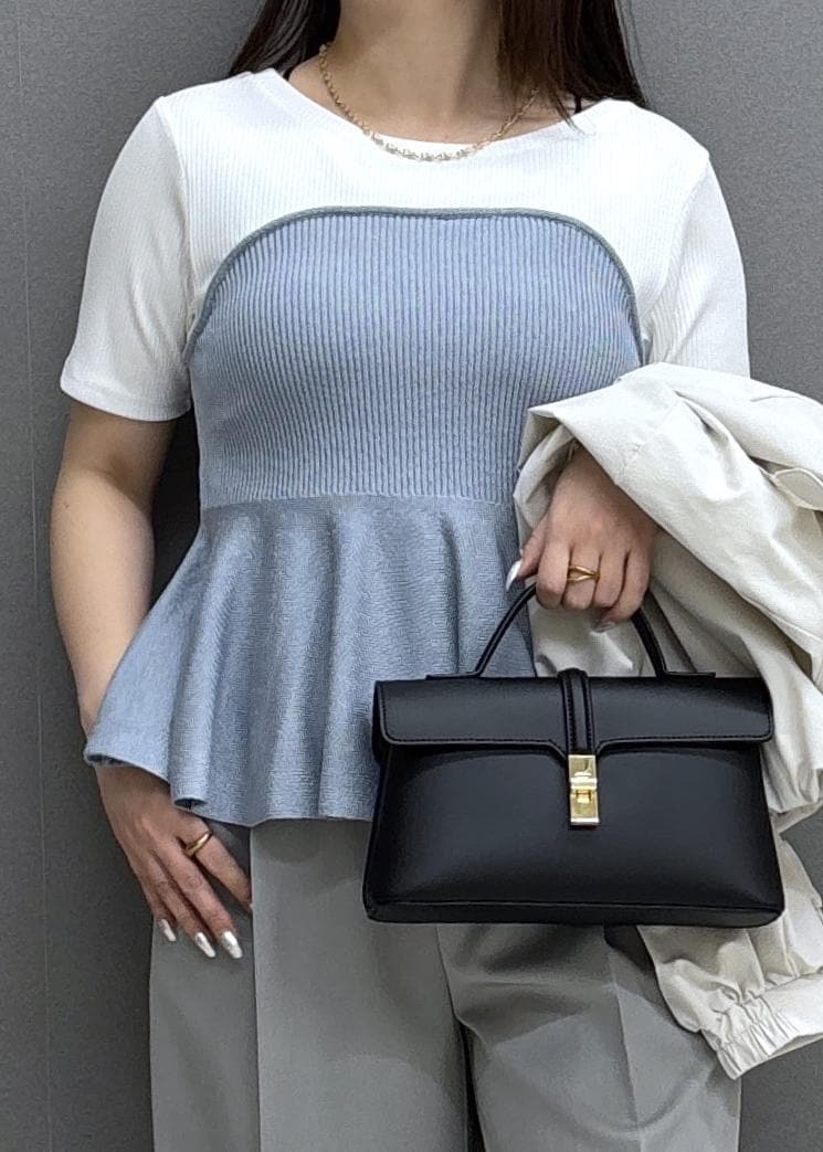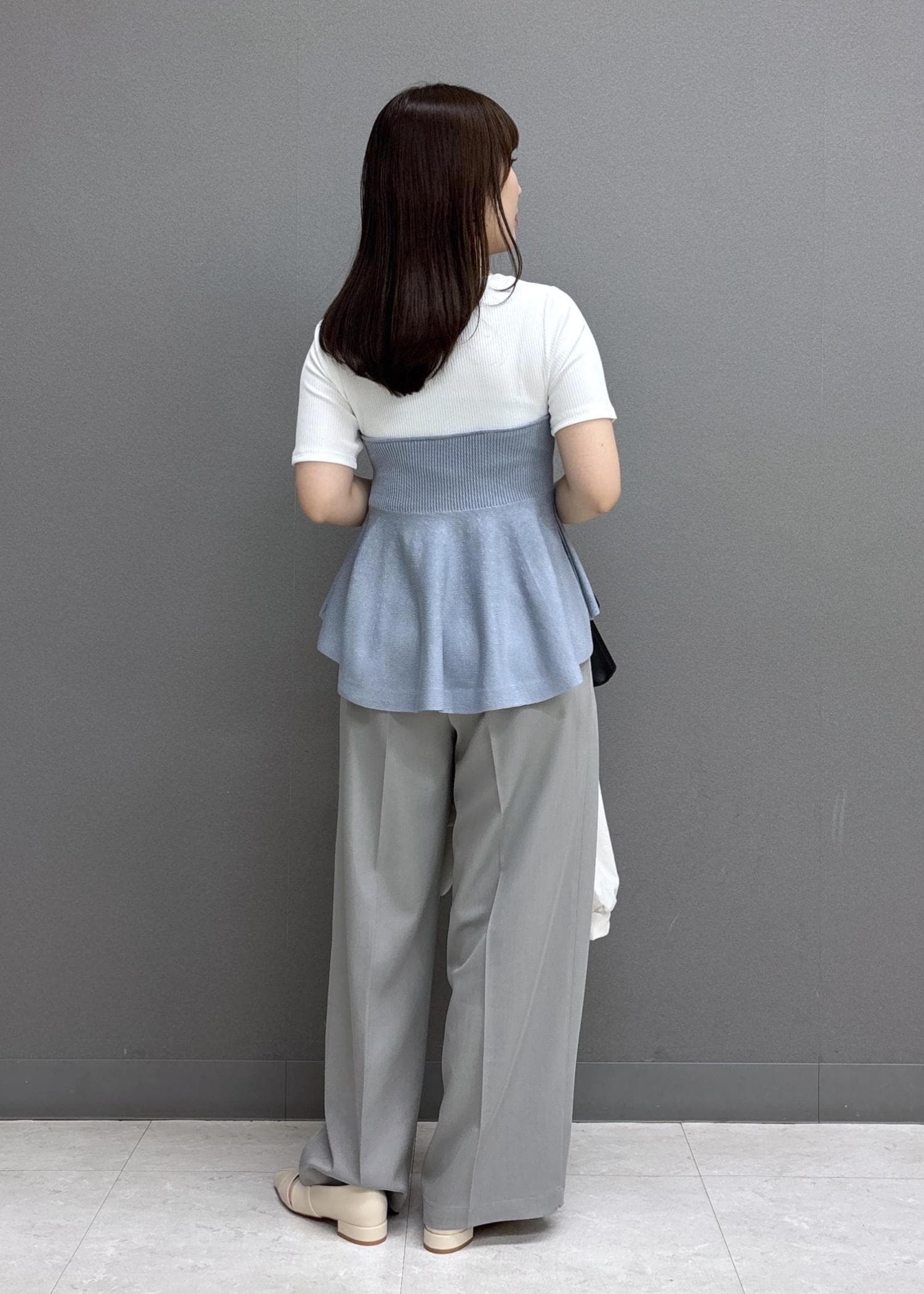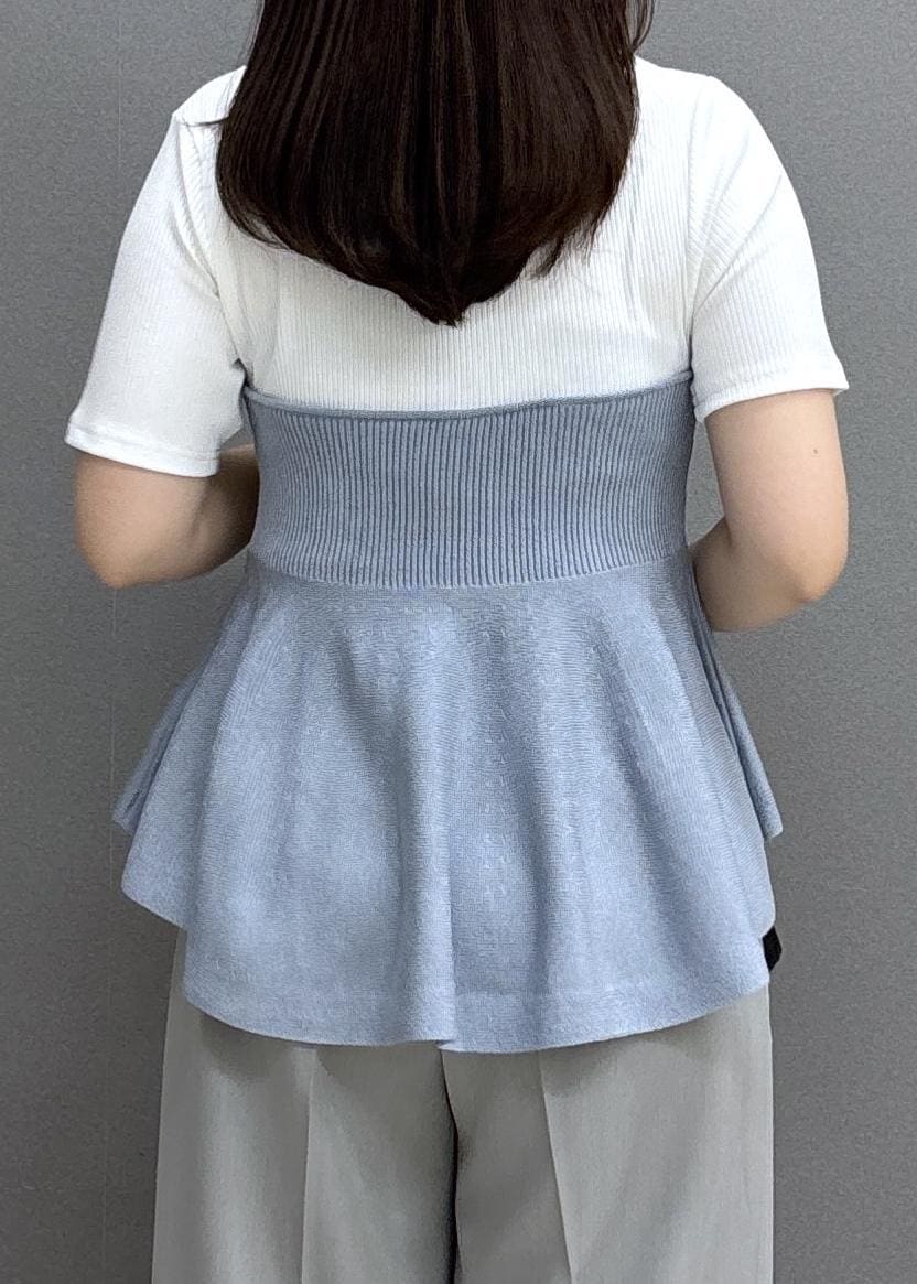 VISペプラムサマーニットドッキングカットソー/イージーケアサックス / F¥5,929レビュー160㎝だとヒップにかかる着丈で、前がやや短めです!薄手のリブニットで伸縮性があり、ストレスフリーな着心地◎程よくフィット感はありますが、着痩せして見えました!