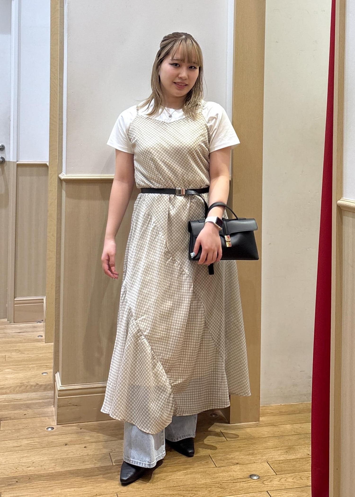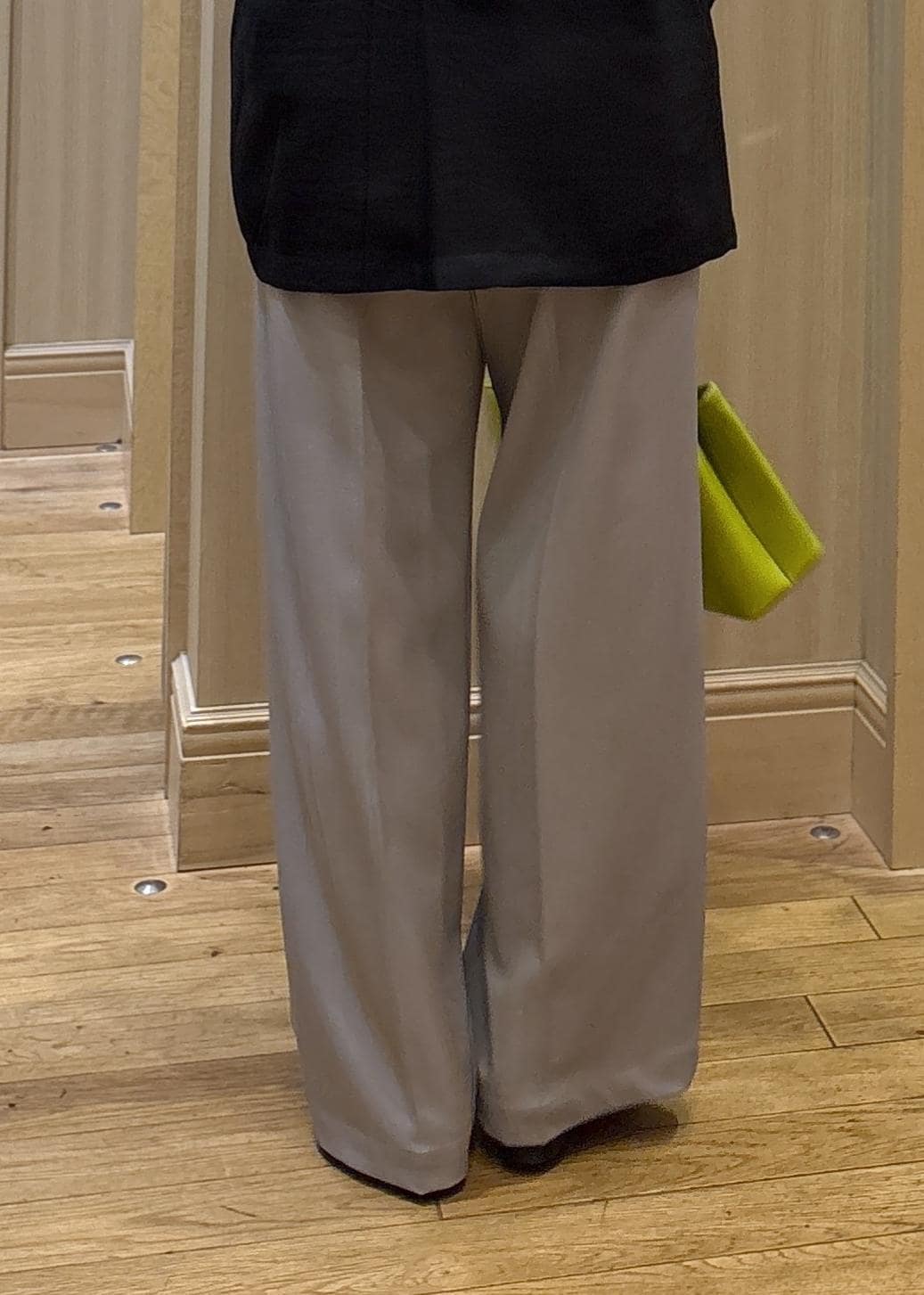 Mだとフラットな靴を履いて、ギリギリ床に着くか着かないかくらいの丈感でした。