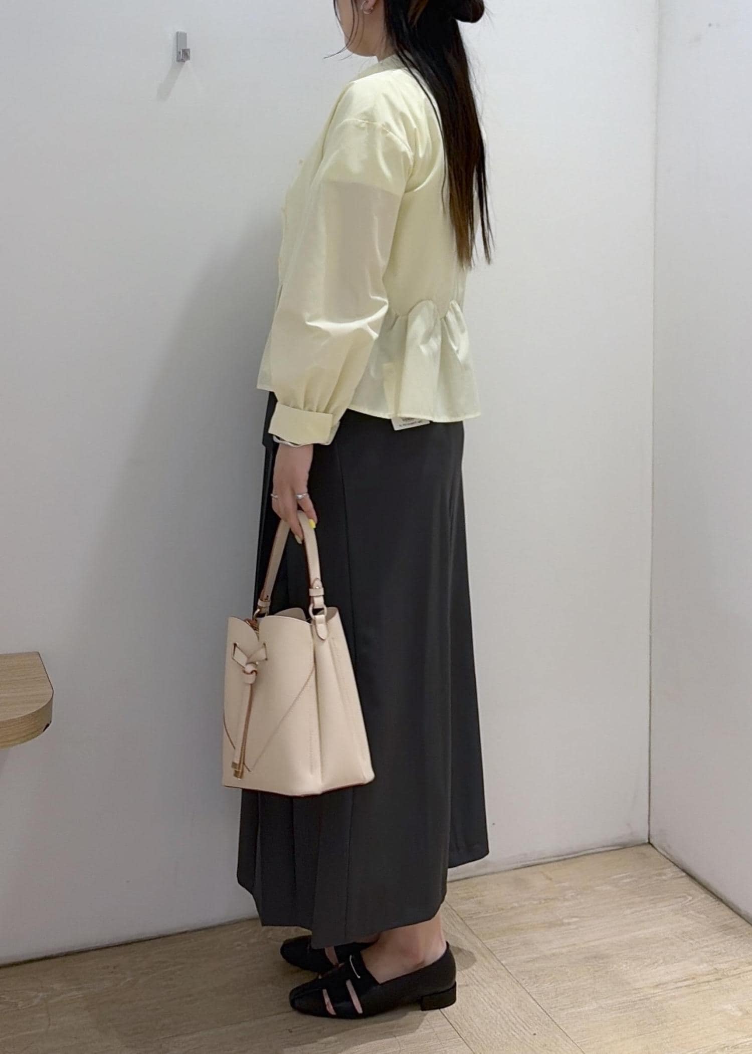 私は骨格ストレートなので、閉じて着用するときはボタンを1個外すとスッキリ見えやすいです。 -