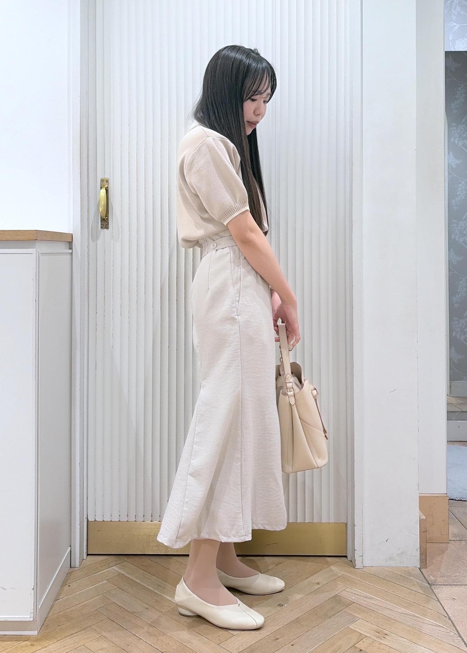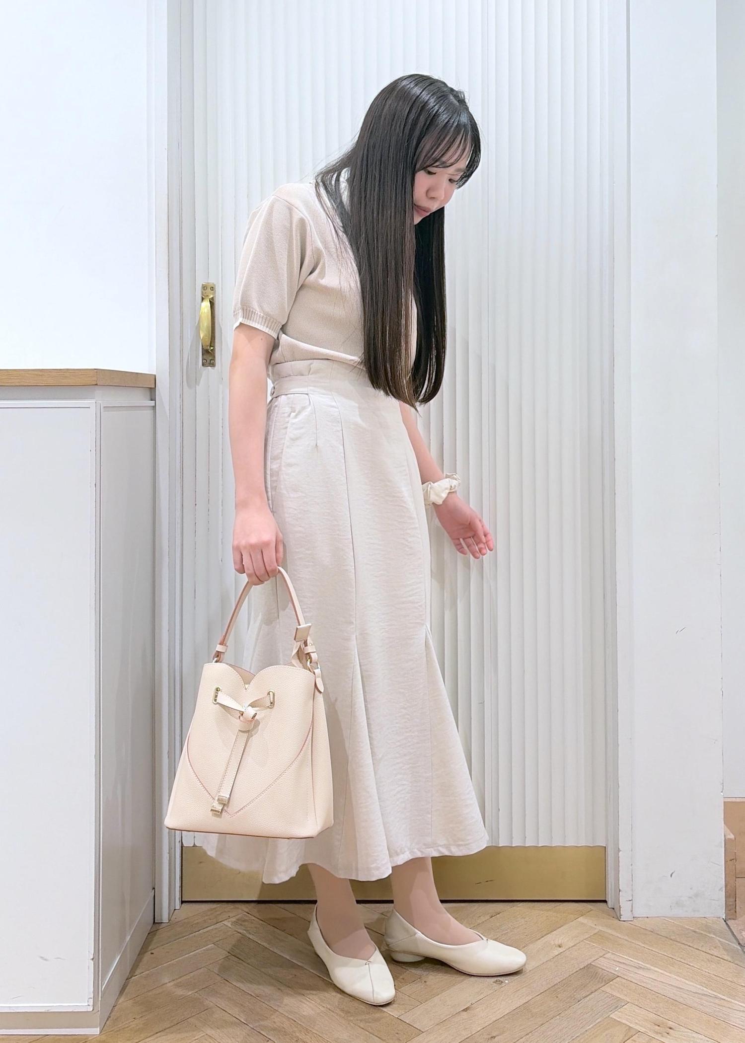 全体的な色味とトップスが柔らかい印象なので、ボトムスと足元をすっきりとした印象にしました(^^)