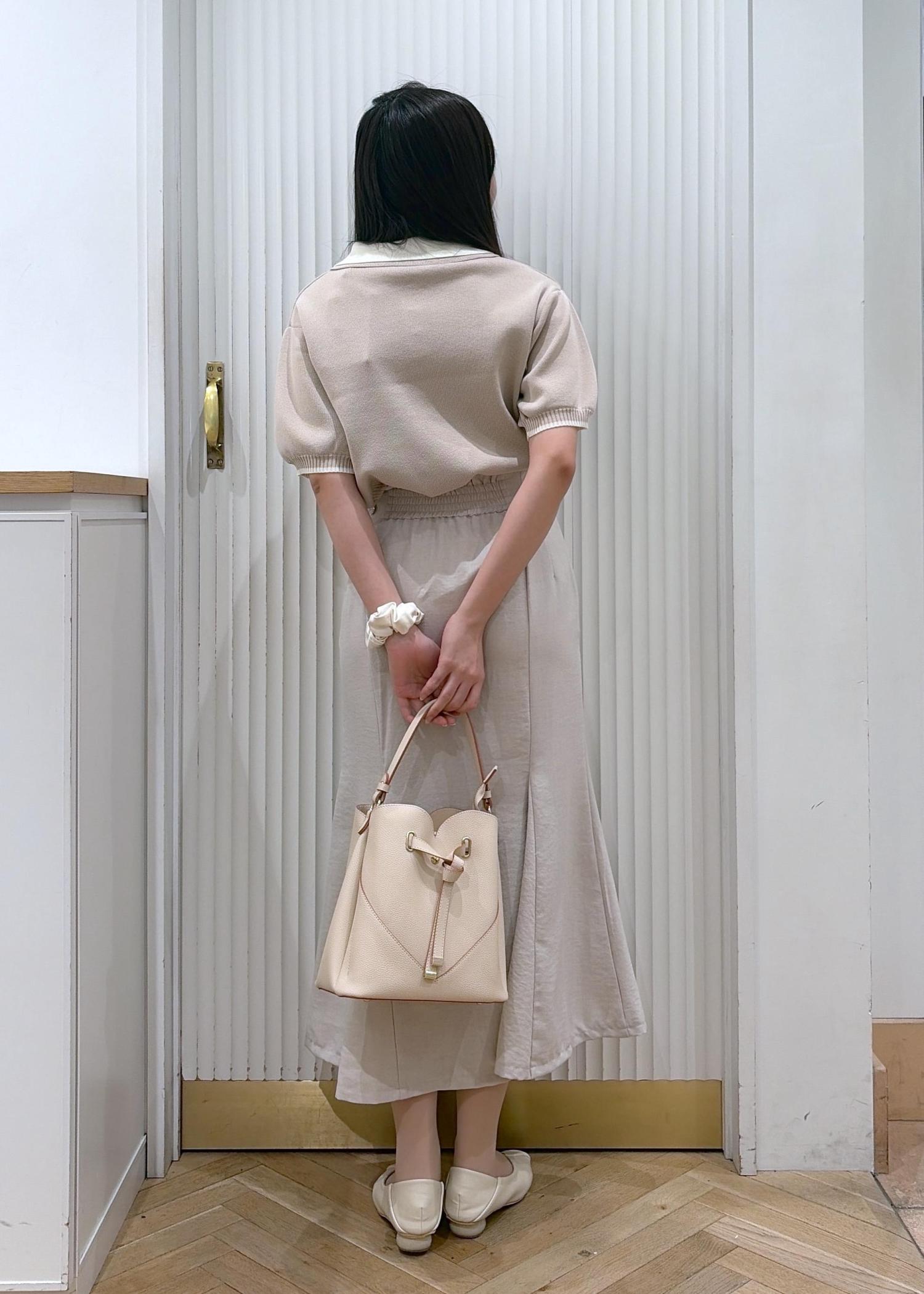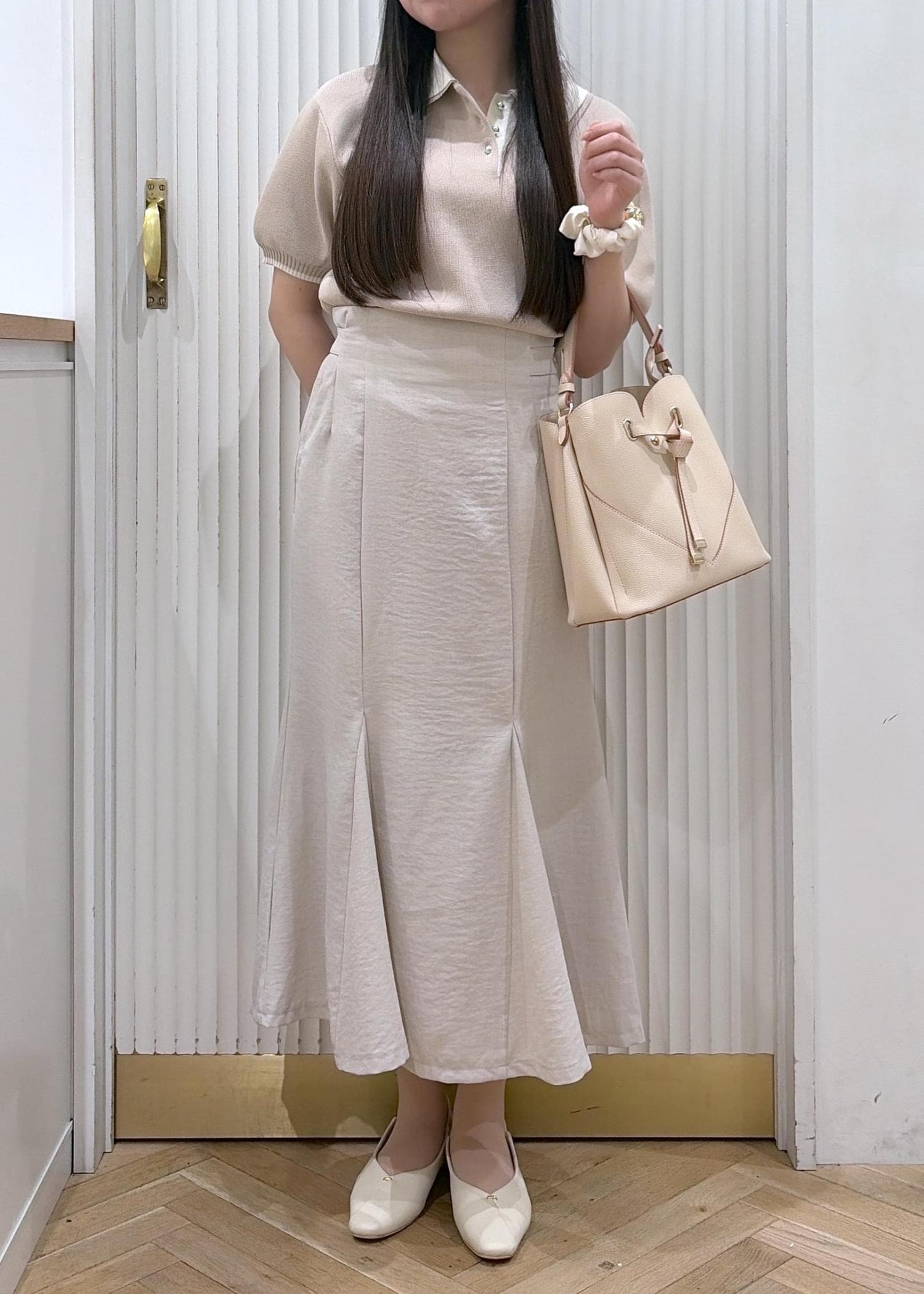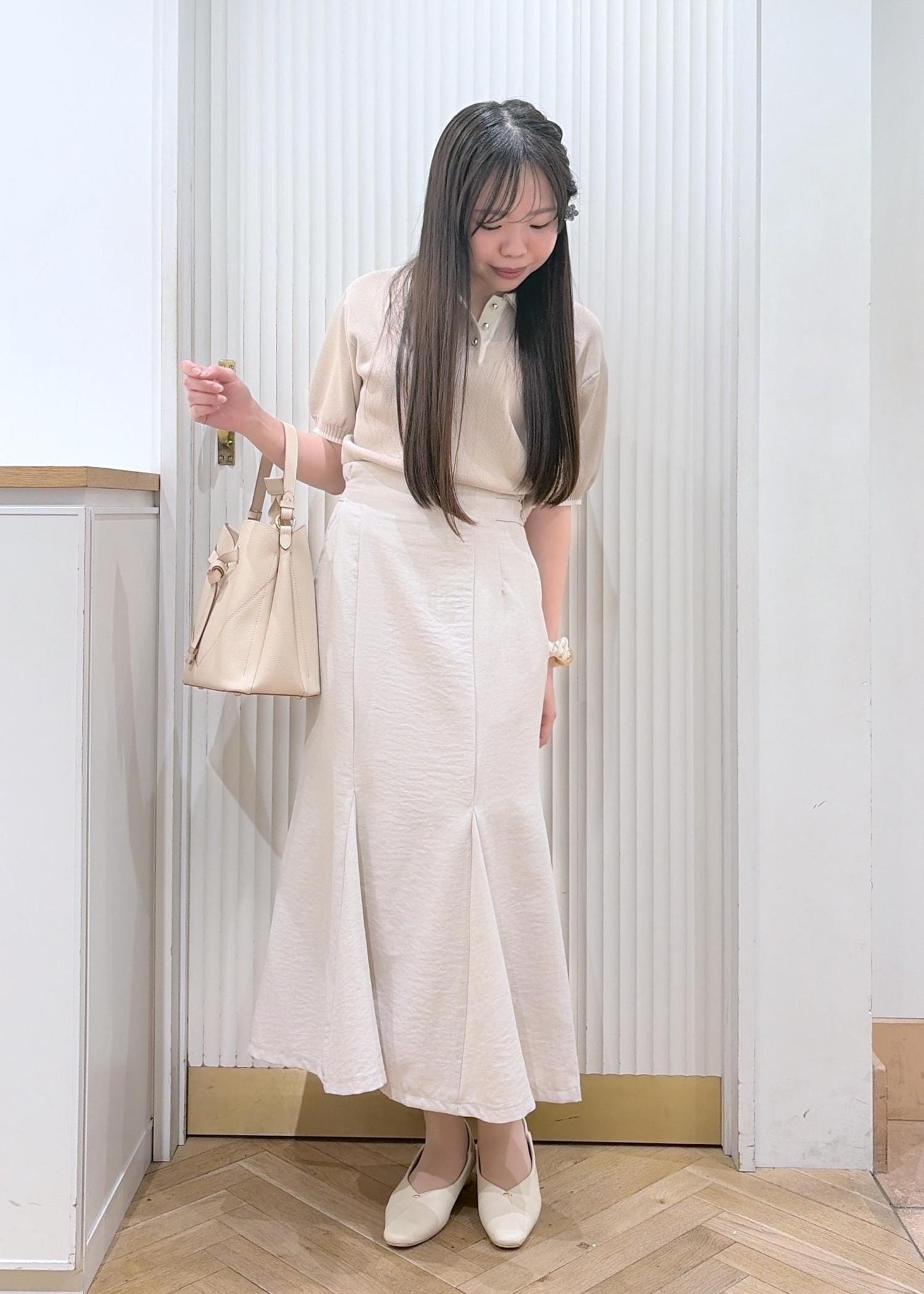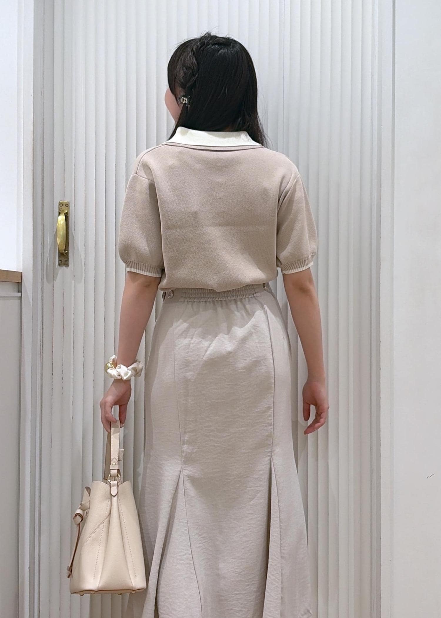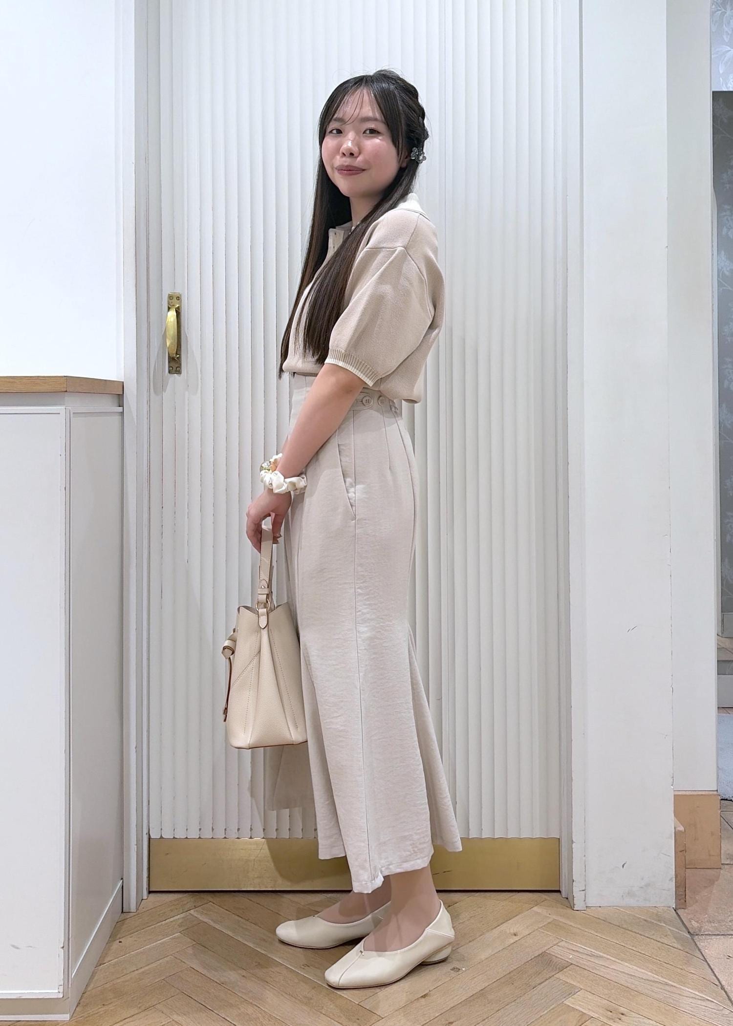ダブルカラー半袖ポロニットの肌馴染みの良いピンクベージュカラーを生かして、ナチュラルなトーンでまとめてみました♪