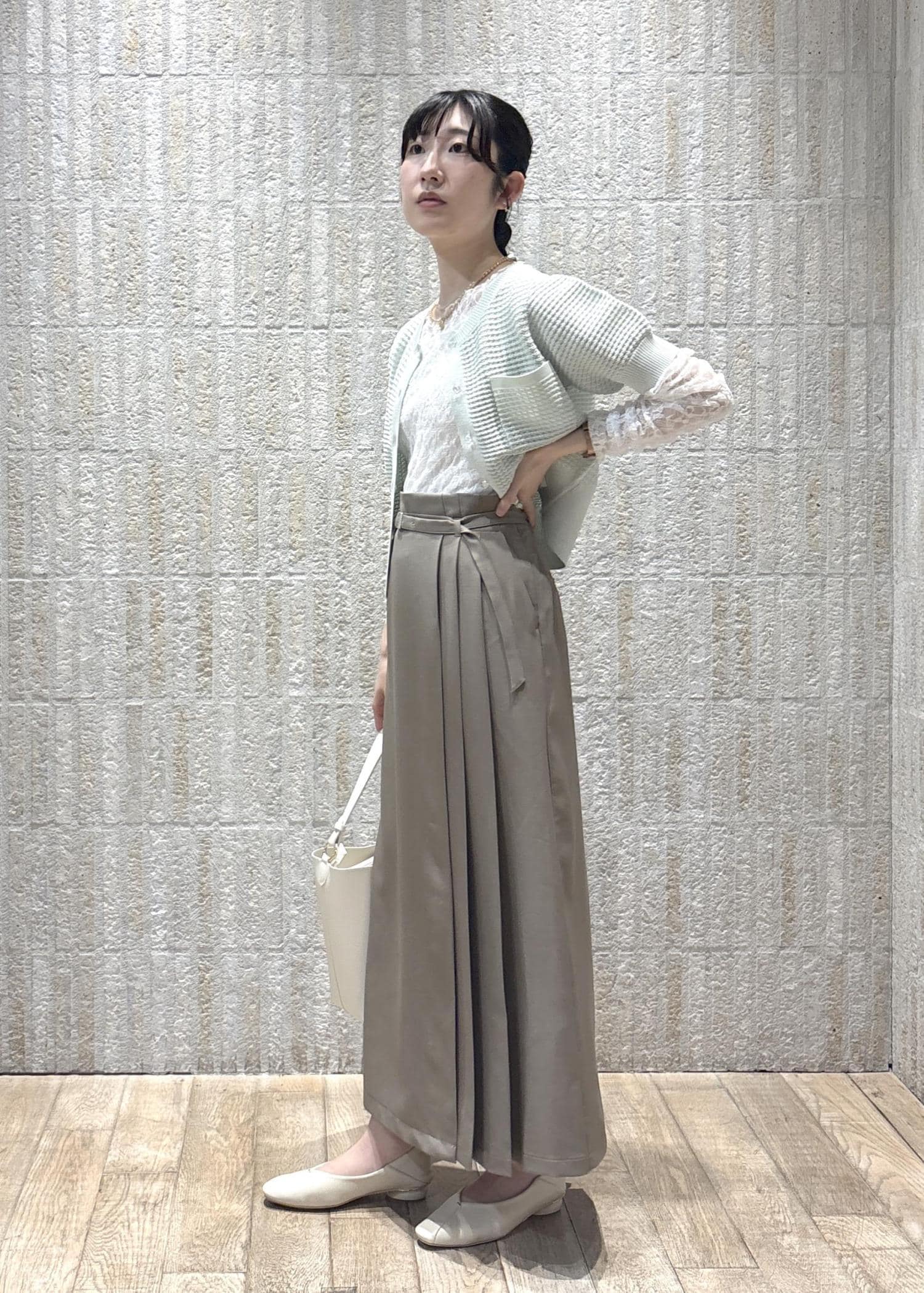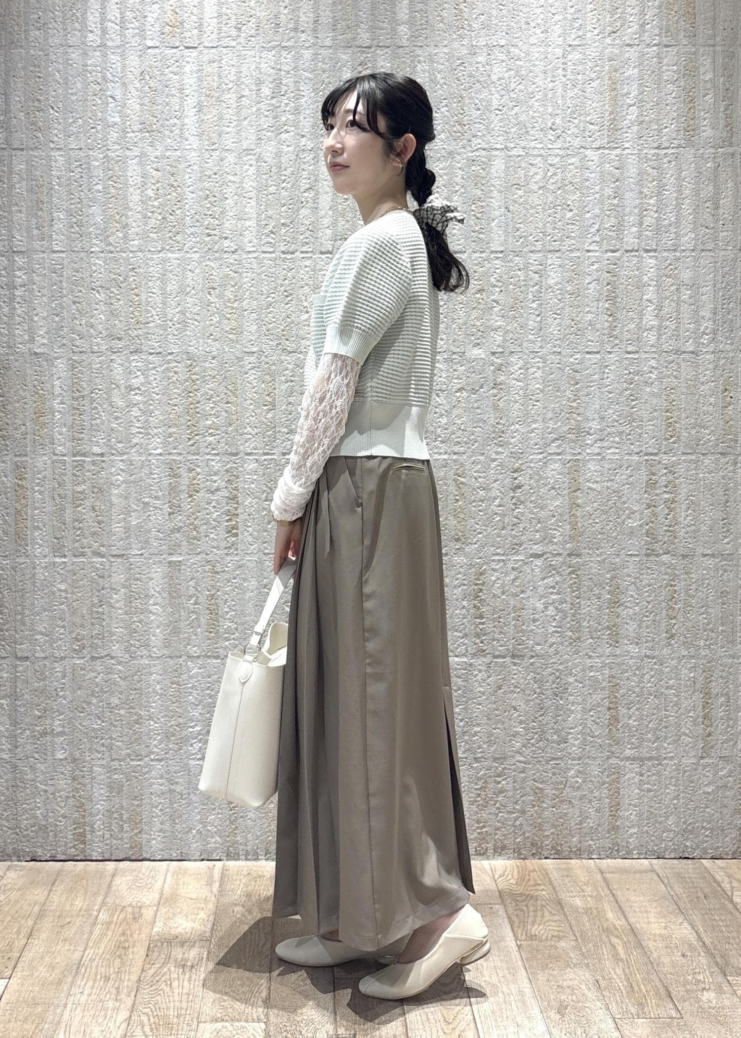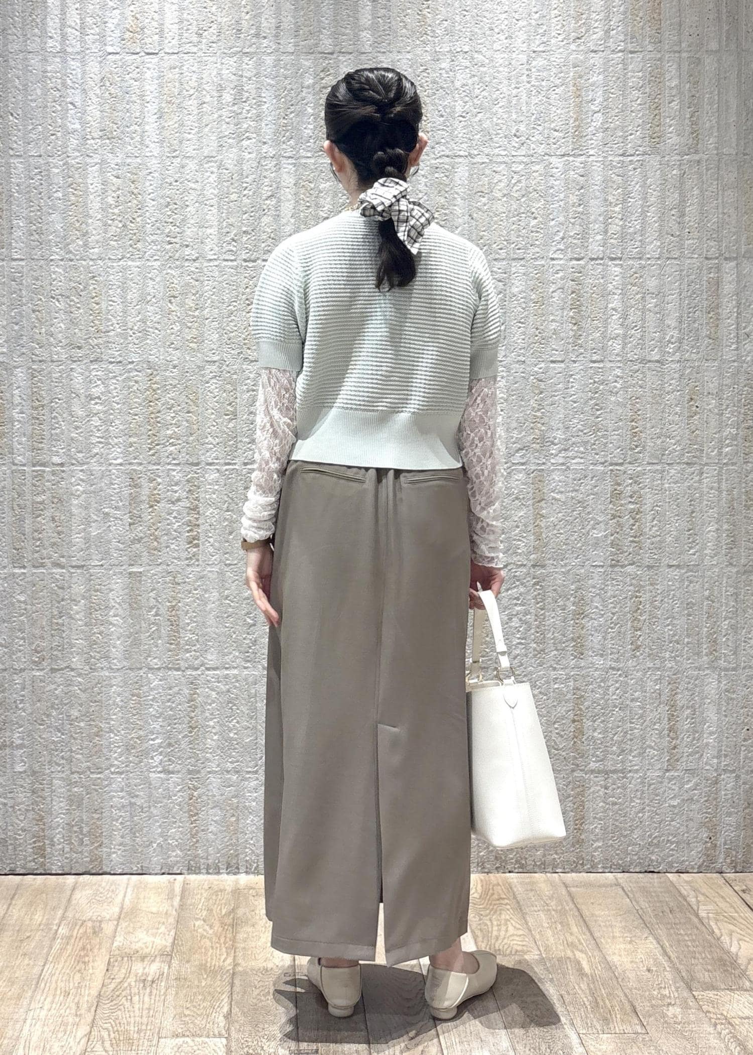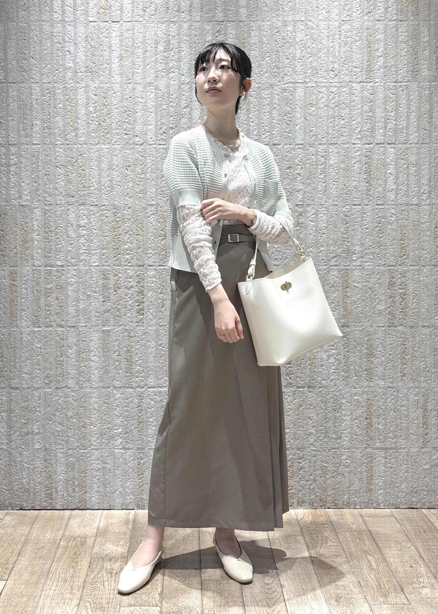 全体を淡い色味でまとめつつ、秋口まで着用できるブラウンのスカートを合わせています。Iラインのシルエットがとても綺麗で、すっきりとした印象に仕上がります。