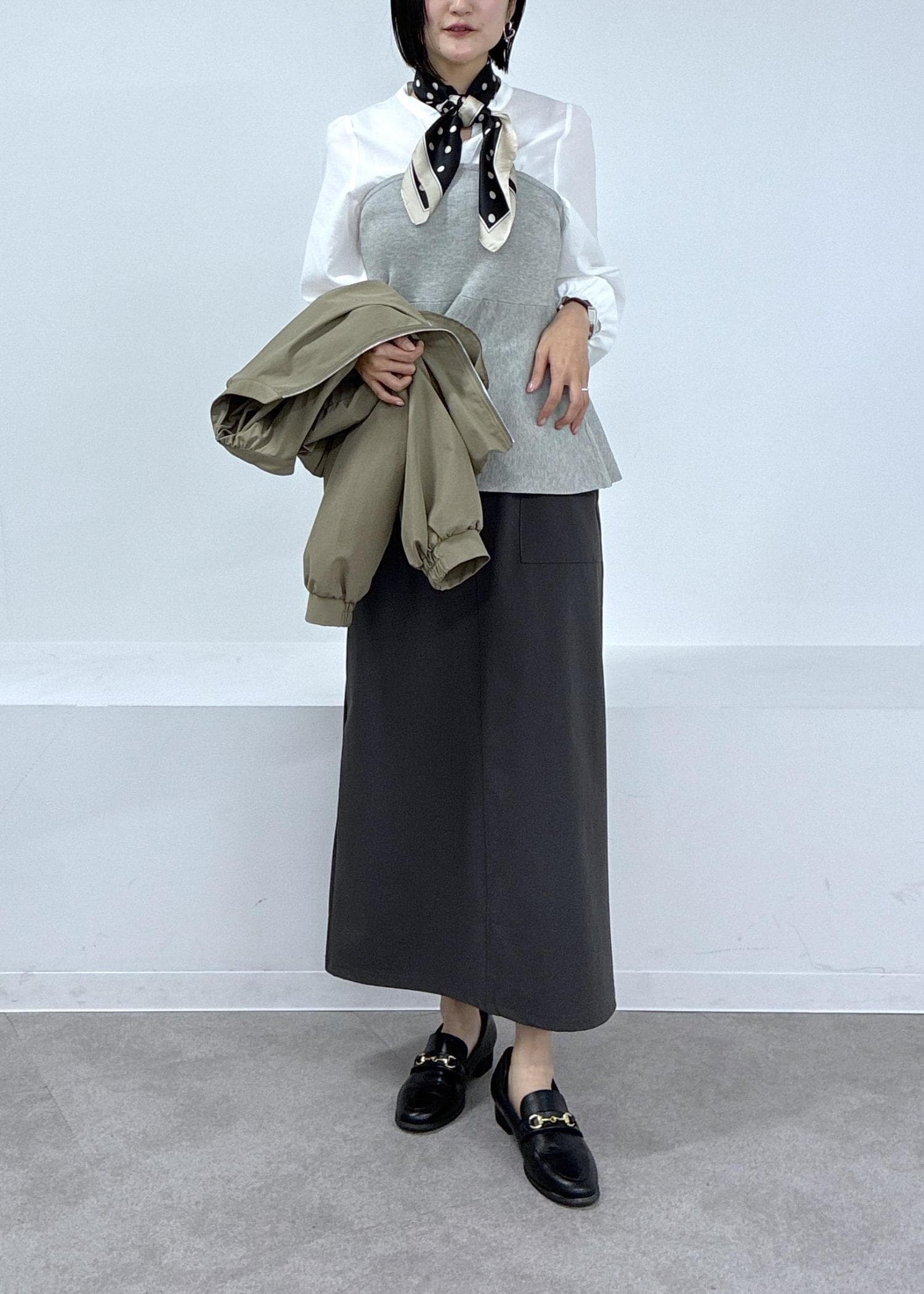 コンパクトなブルゾンにフレアシルエットのトップスを合わせて、女性らしい柔らかさをプラス!ドット柄のスカーフは顔まわりを華やかに見せてくれるので嬉しいです♡