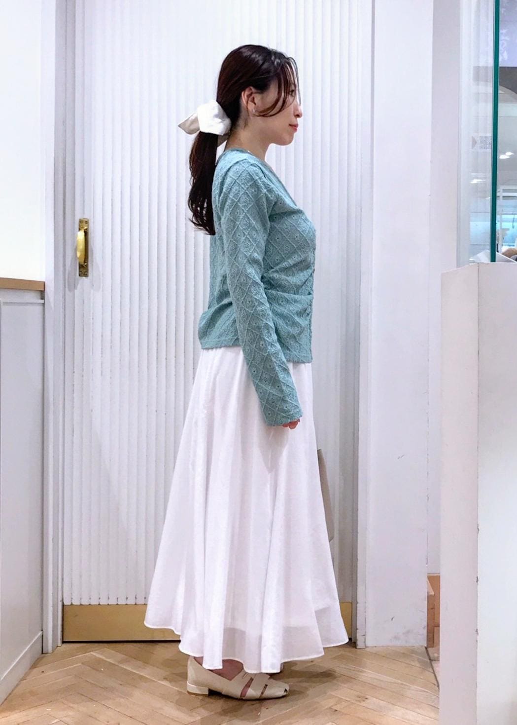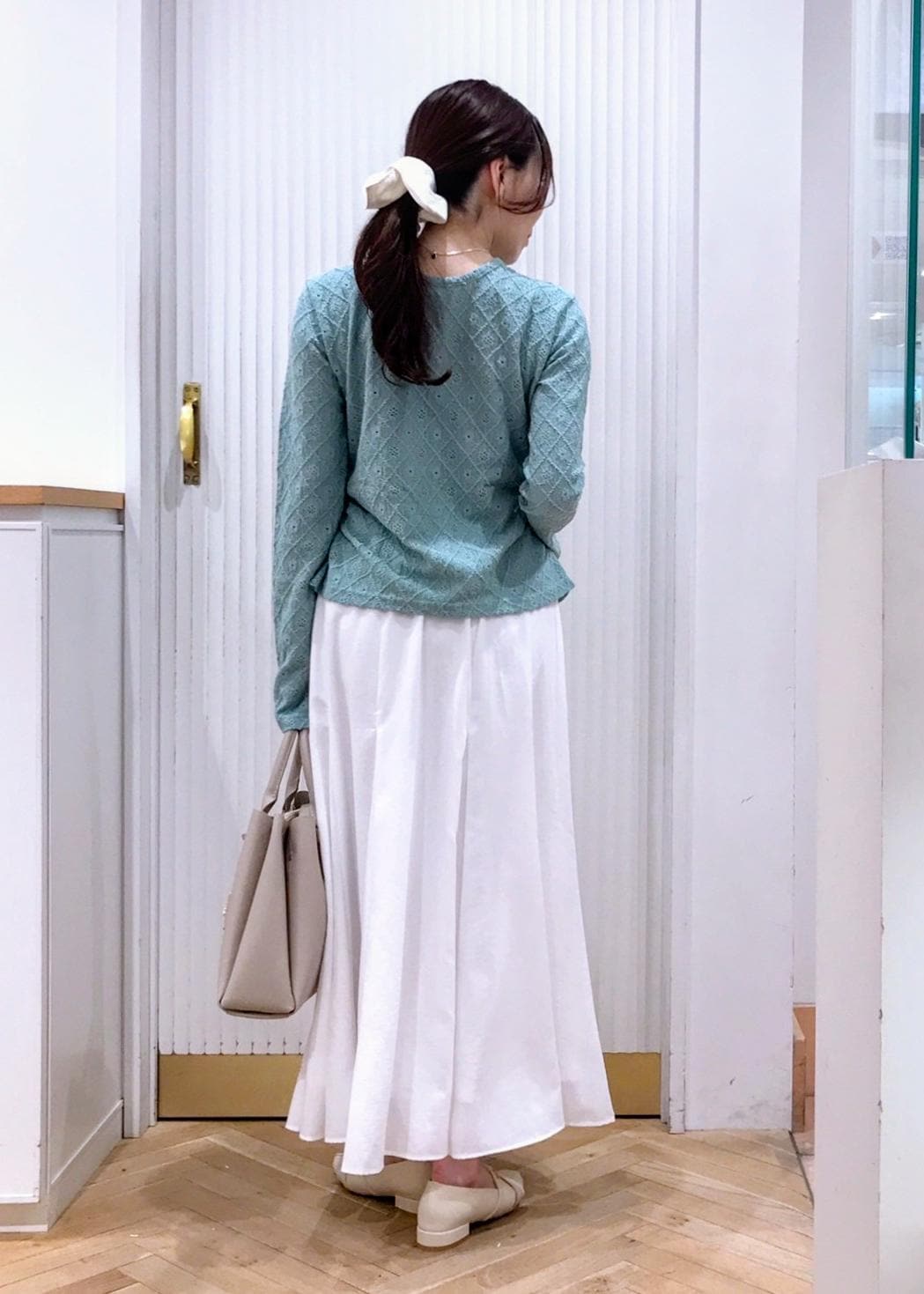 春らしい鮮やかなグリーンのカーディガンを主役に、ピュアホワイトのロングスカートを合わせて甘くなりすぎない大人のフェミニンスタイルに。バッグやアクセサリーも白で統一した、華やかでお出かけにもぴったりなコーディネートです。