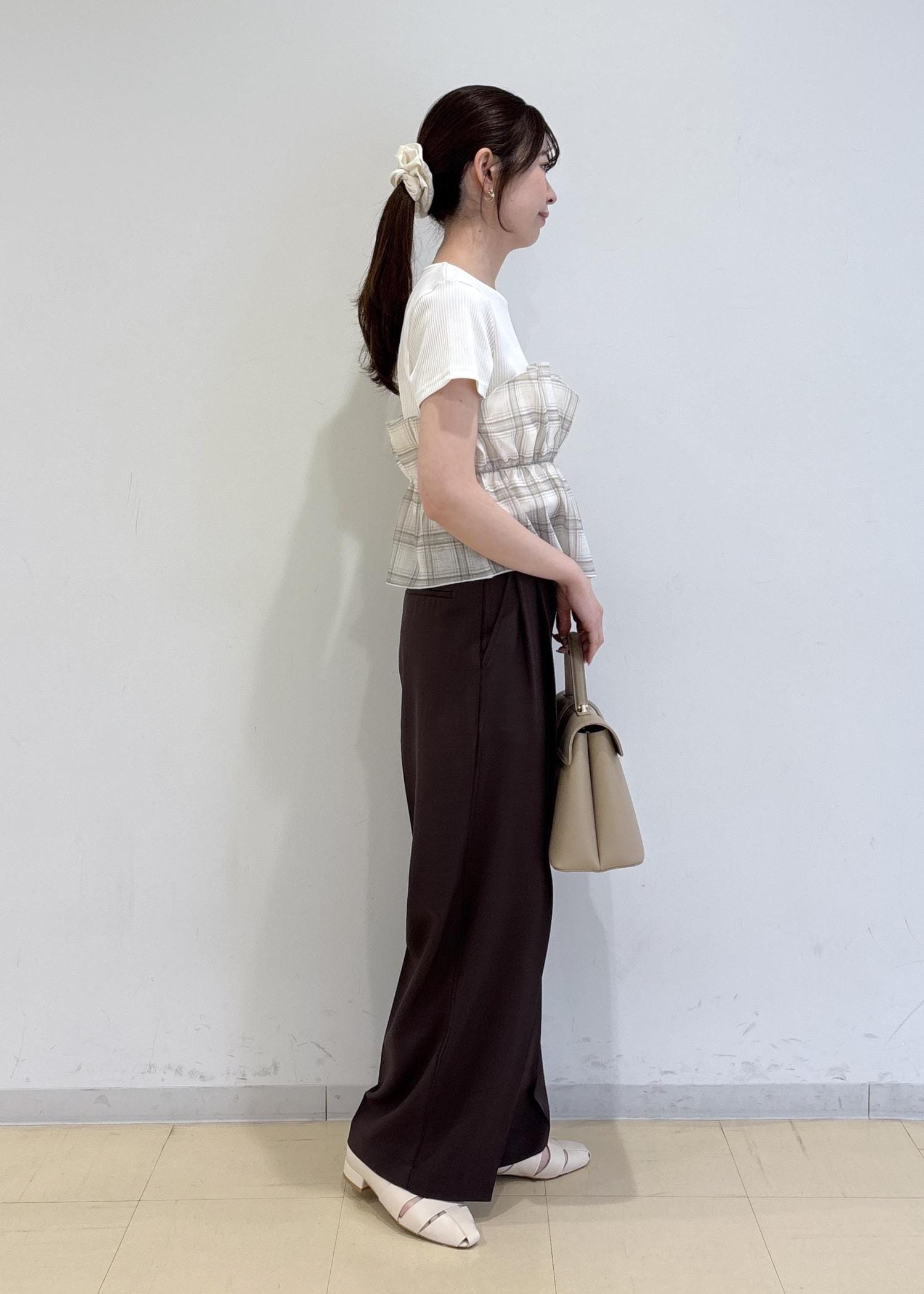 トップスは1枚で着映えが叶うビスチェドッキングプルオーバー。チェック柄がカットソーと同系色なのでフェミニンな印象で着れます♪