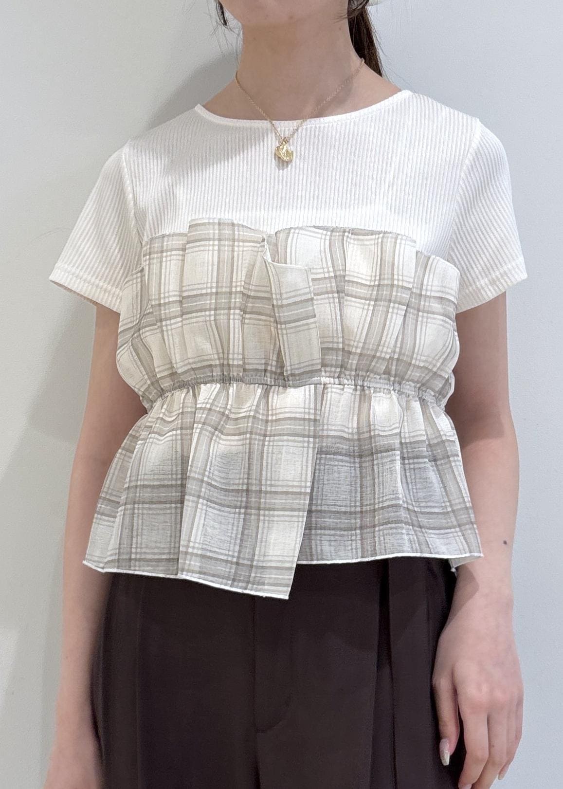 VISチェック&無地ビスチェドッキング半袖プルオーバー/イージーケアキナリ系 / F¥5,489レビュービスチェがついたデザインで1枚で着映えが叶います!