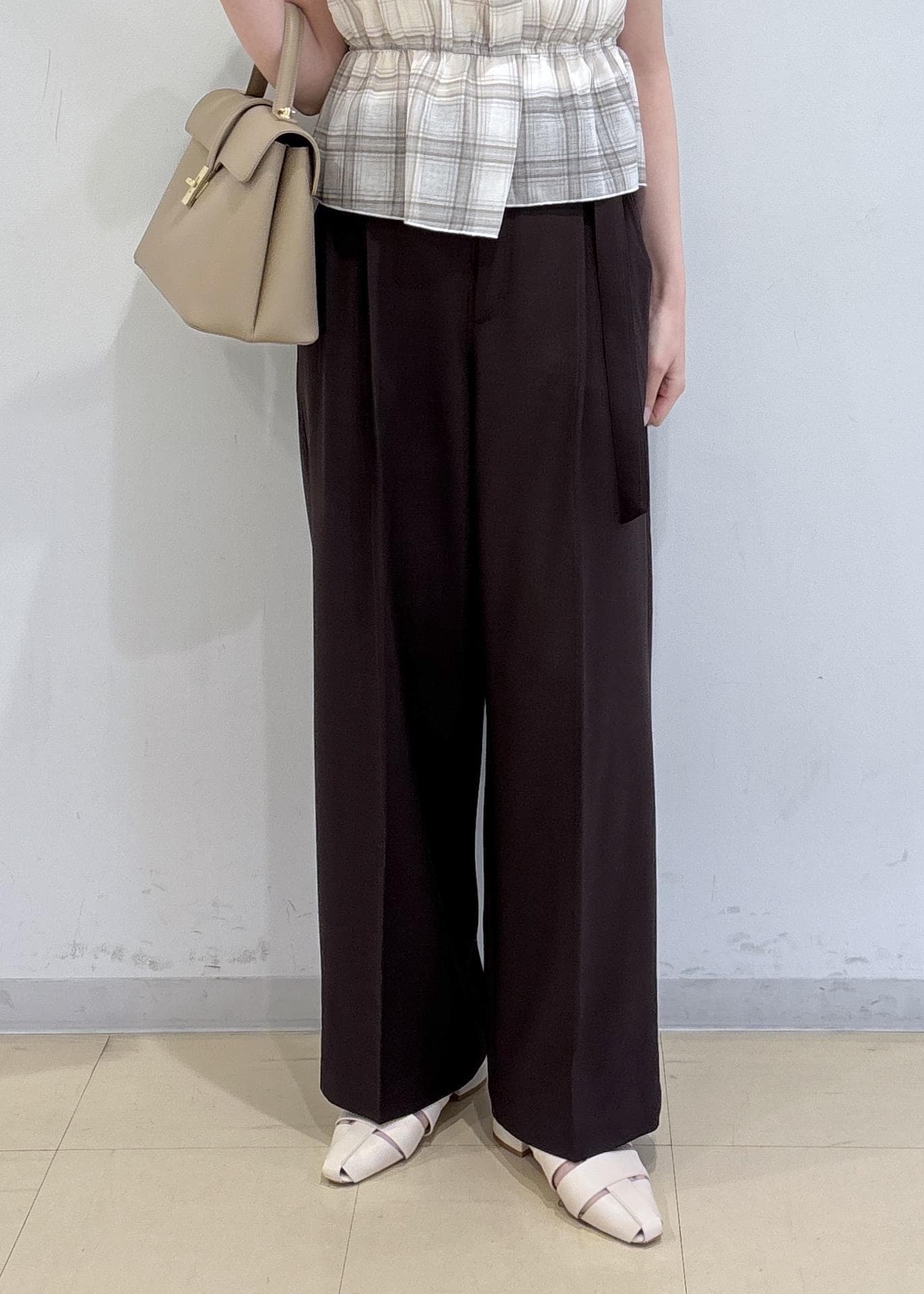ダークブラウンのパンツはオシャレ見えするカラー!ハイウエストでスタイルアップも叶います。お仕事使いにもオススメです!