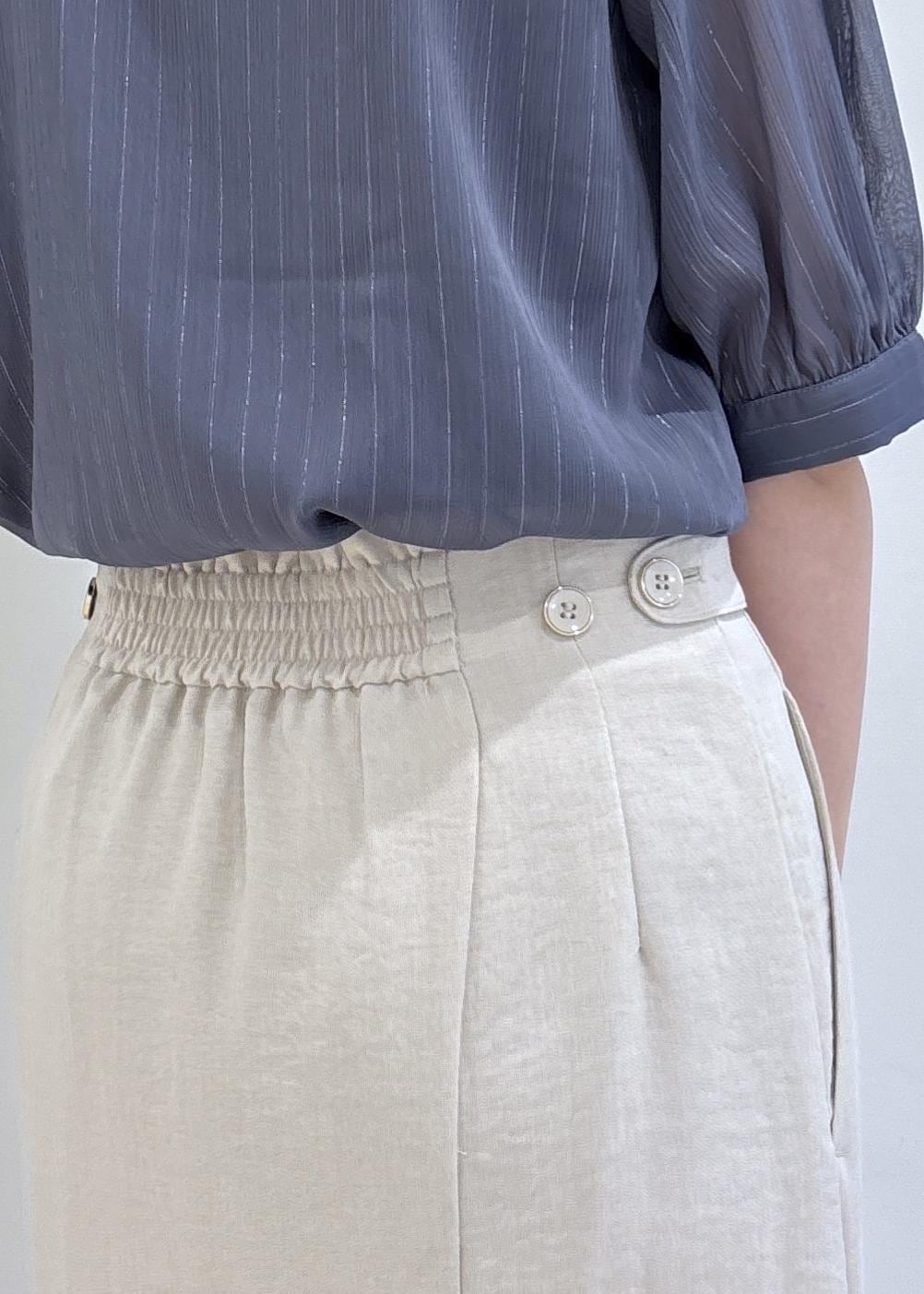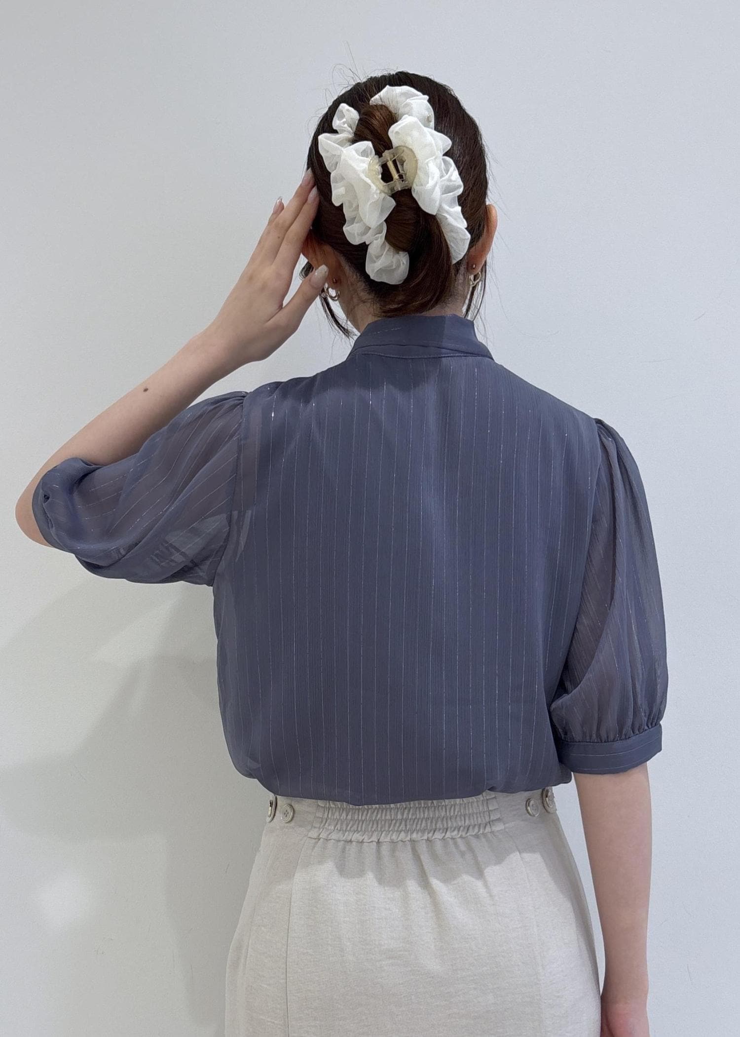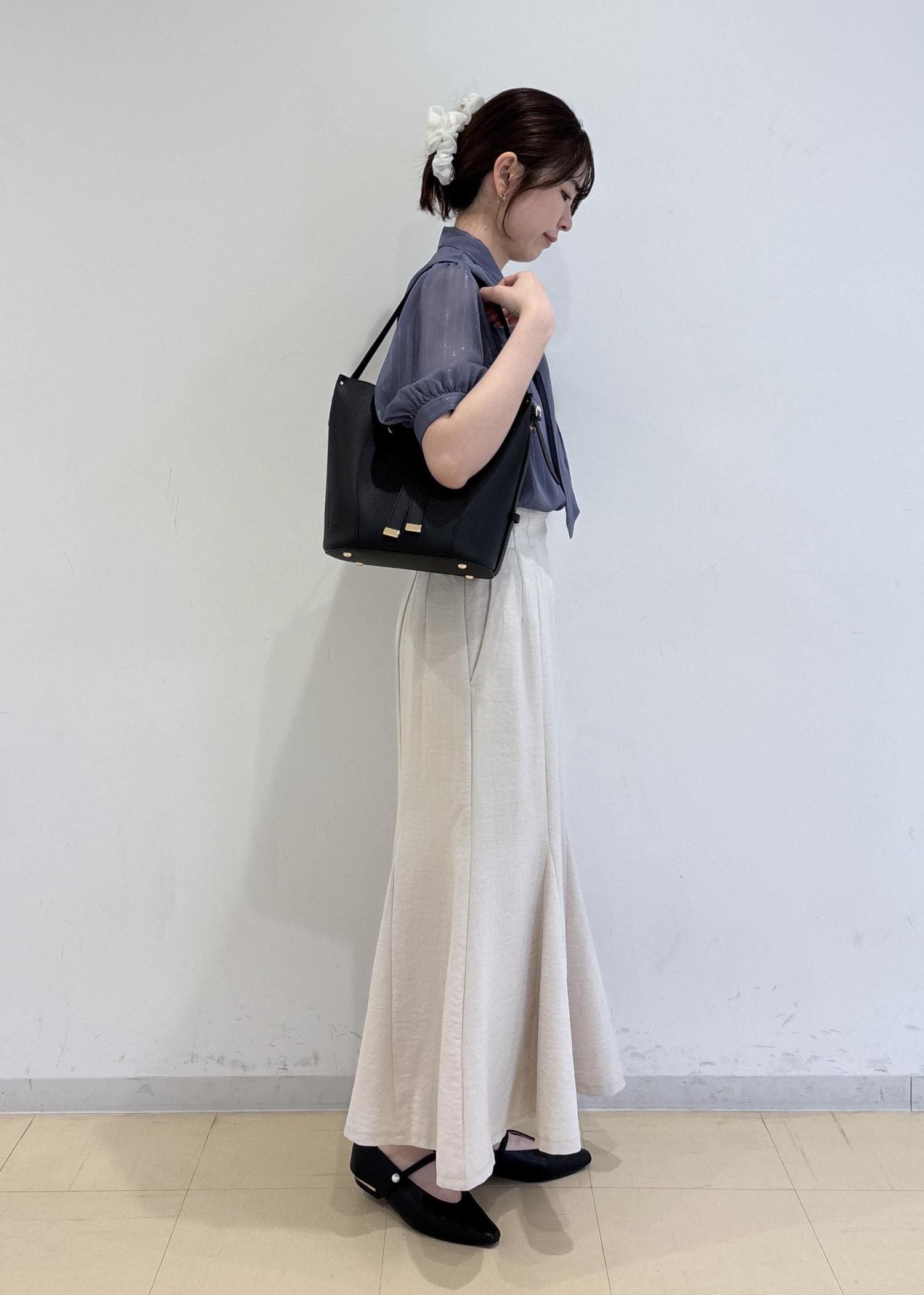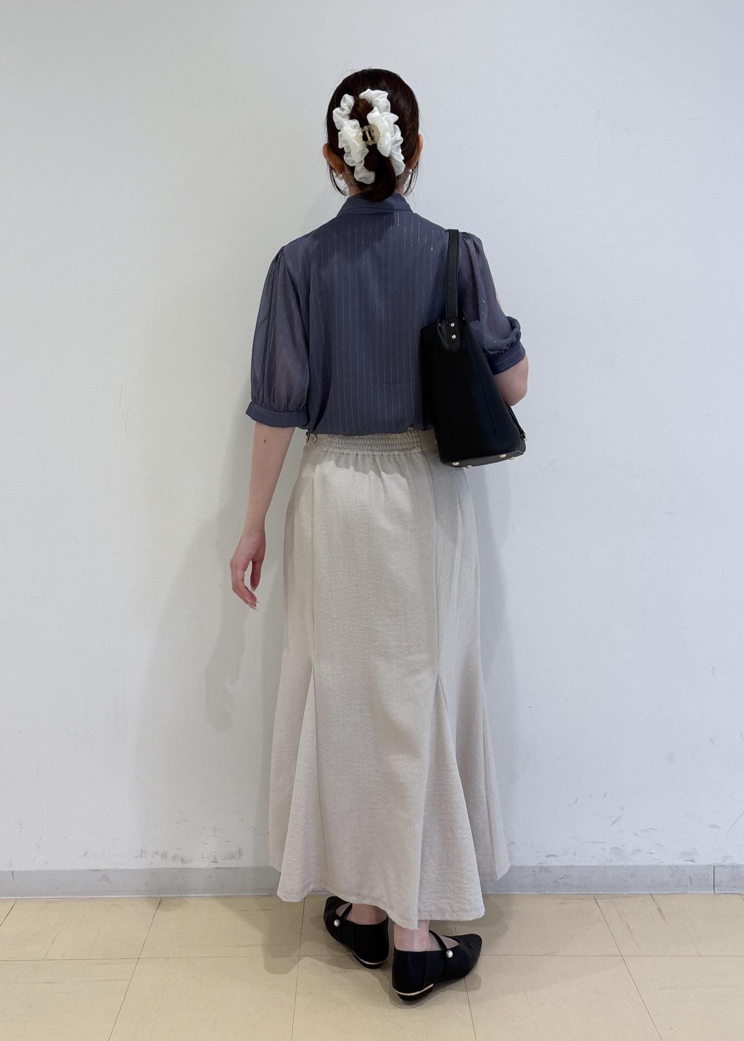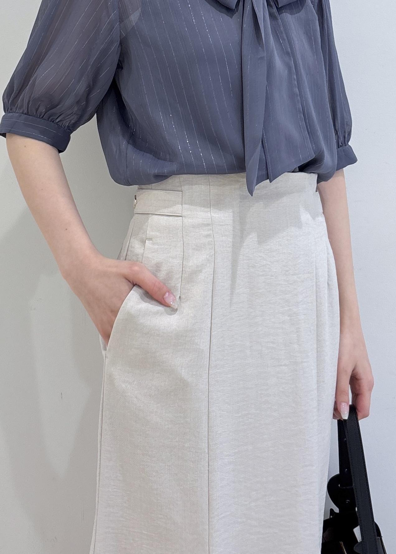 ブラウスはサラッとしたシアー素材でラメ感もあるので華やか見えする1枚です。スカートはキナリカラーで明るさをプラスしつつ、バッグやパンプスはブラックでコーディネートを引き締めました。