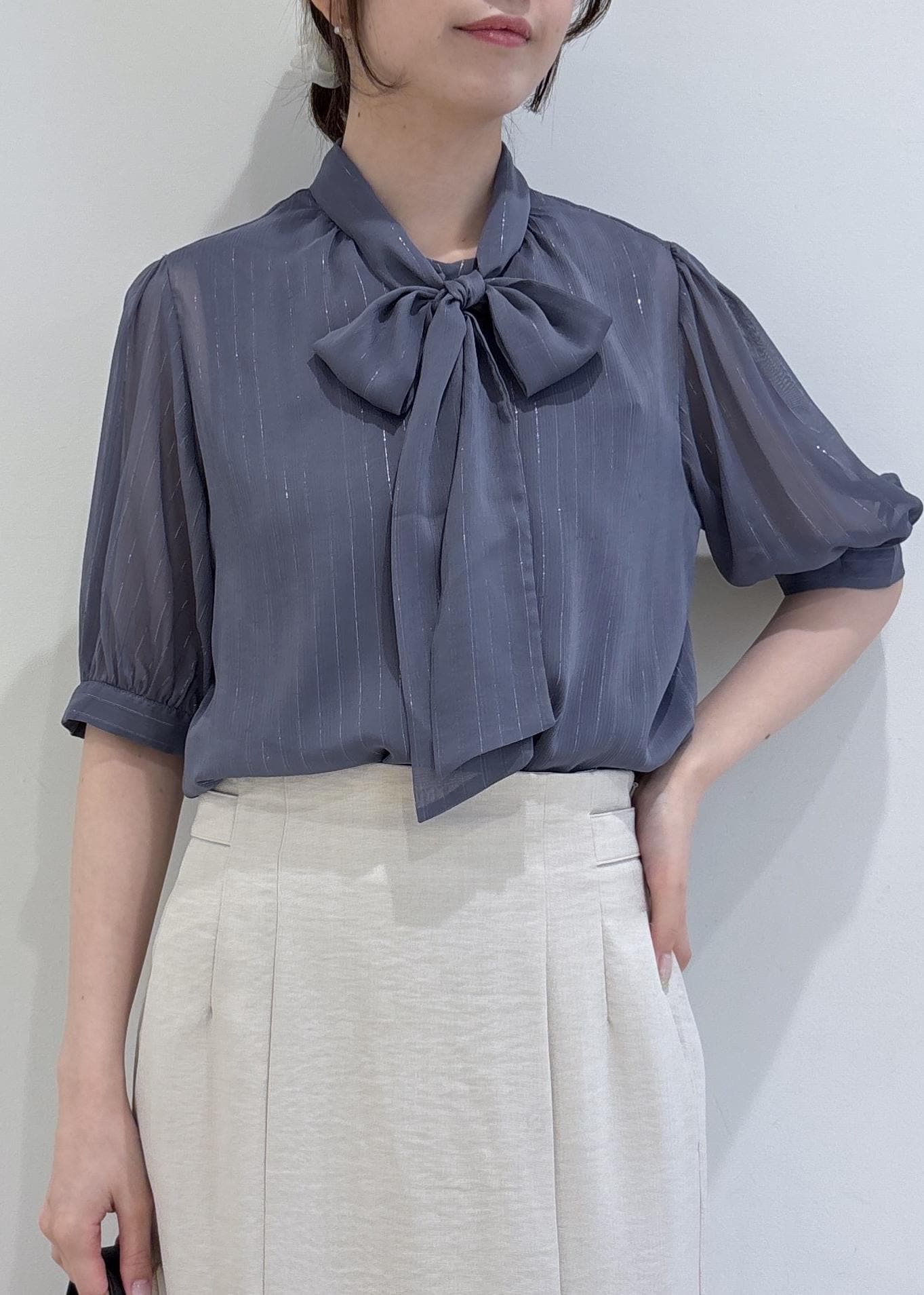 VISラメ楊柳ボウタイブラウスグレー系 / F¥5,929レビューシアー素材×ラメストライプが華やかなブラウスです。ボウタイも程よいボリューム感でワンポイントになります。