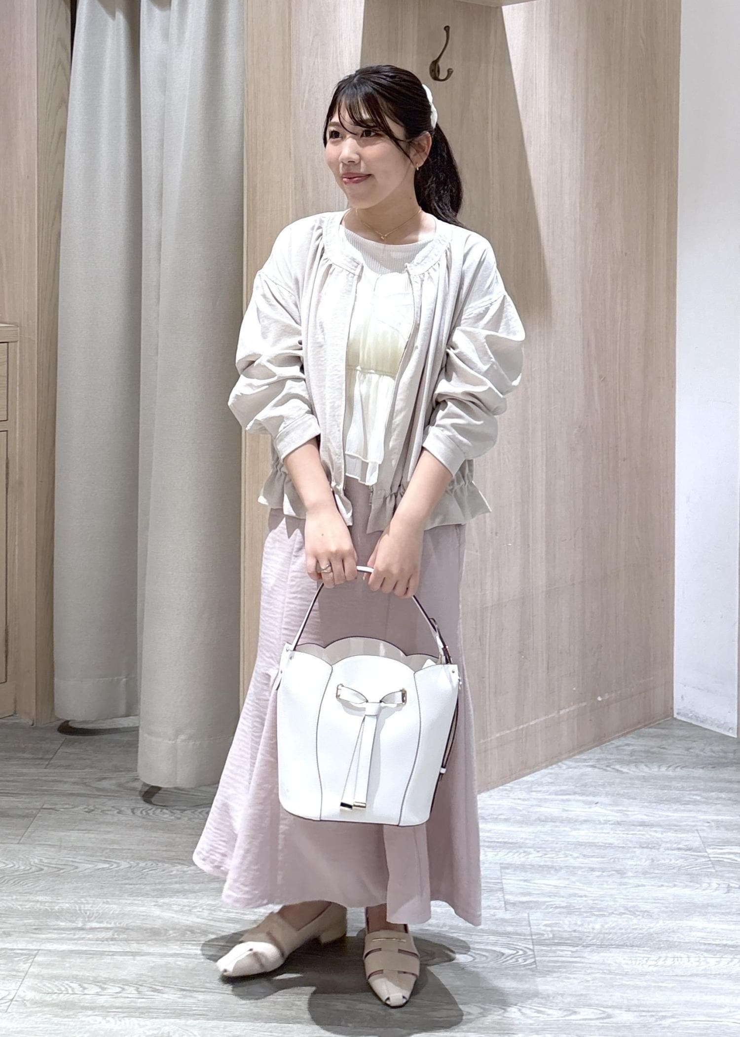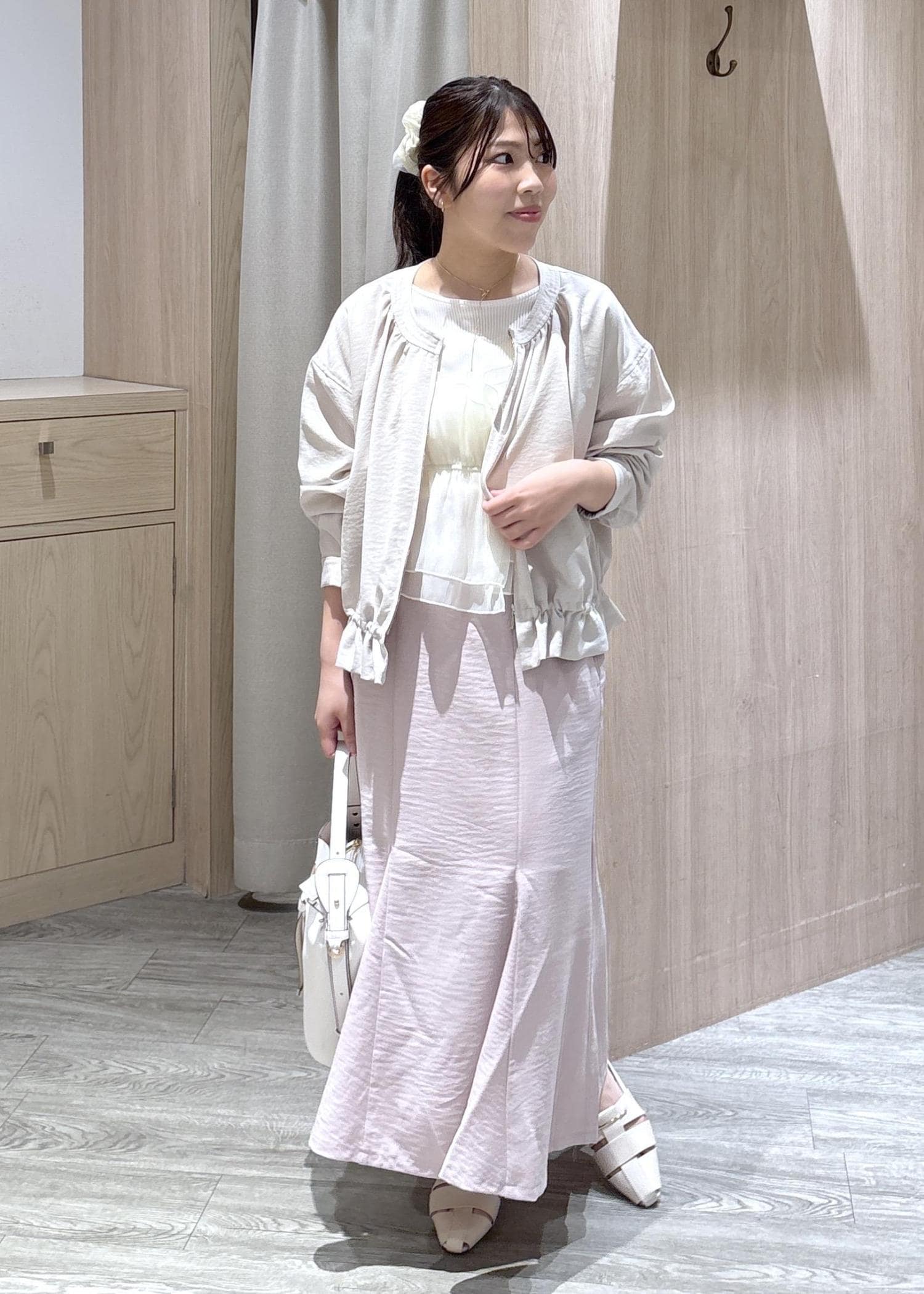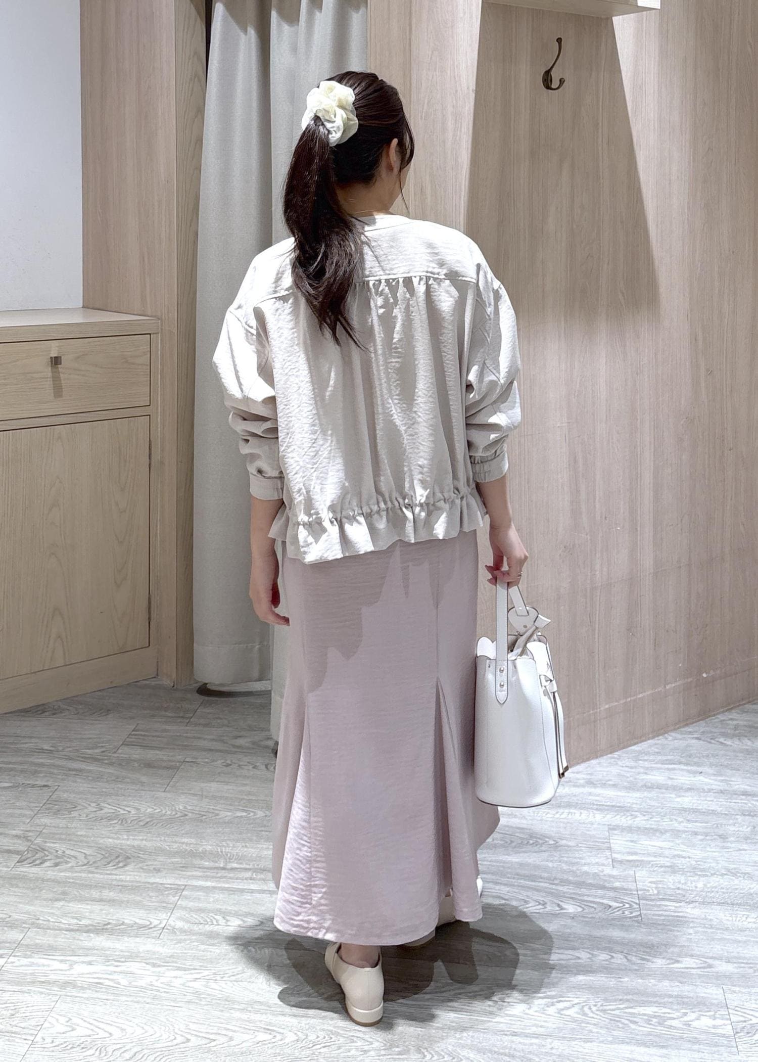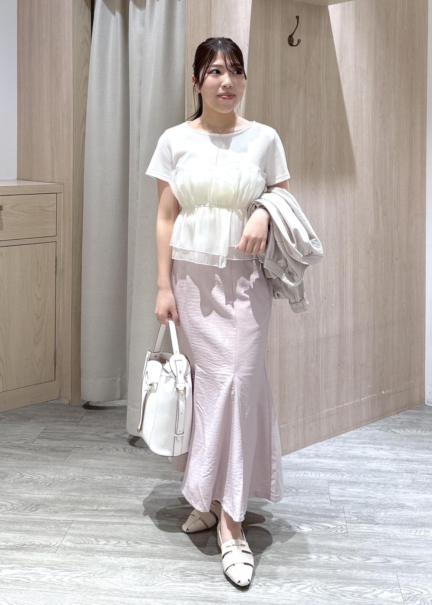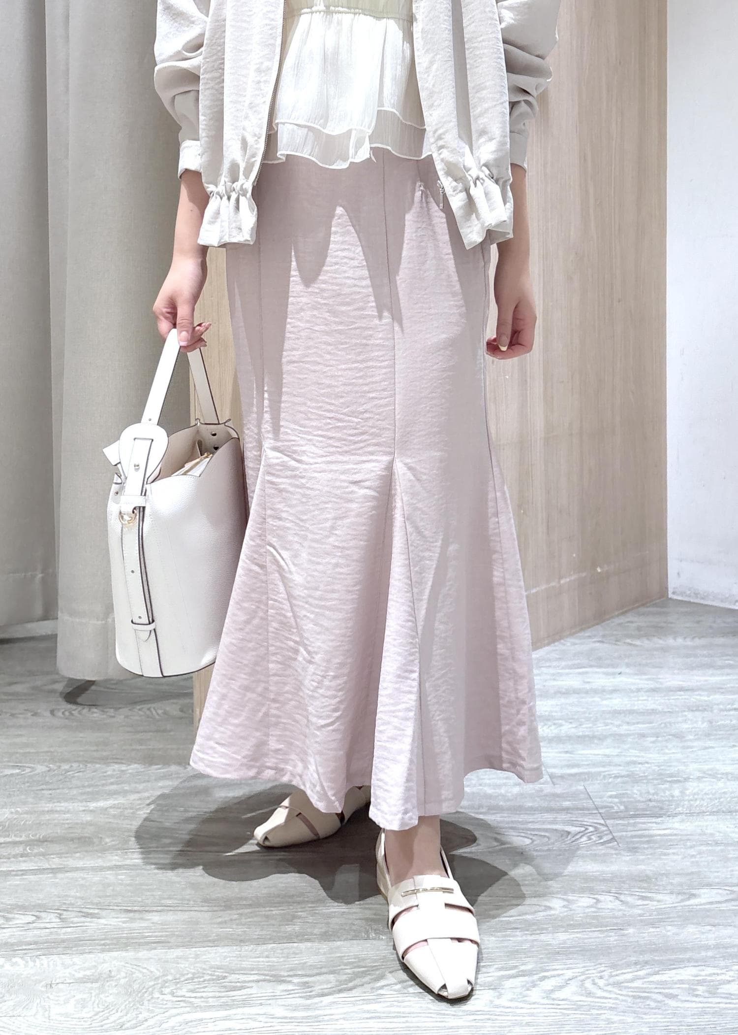 VIS美easyリネンライクマーメイドスカート/イージーケア・接触冷感・セットアップ対応ピンク / S¥5,489レビュー丈は足首が見えるくらいの長さです。ウエストはボタンで調節できるため、合わせやすくなっていますよ。シワも寄りにくいため長時間のデスクワークにも最適です。