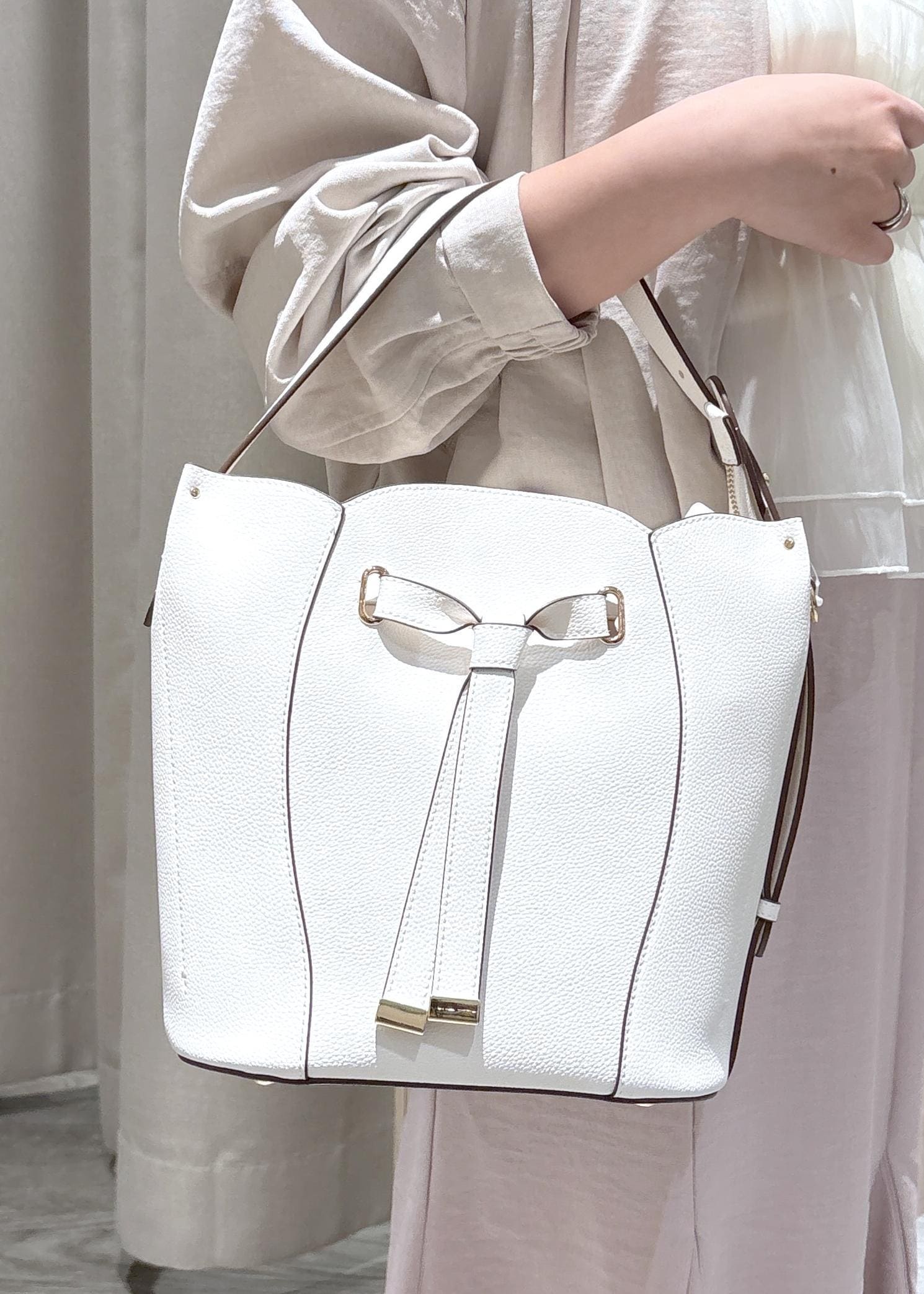 VISフラワーカットショルダーバッグ/2WAYオフホワイト / F¥7,909レビュー少し大きめのデザインで長財布を横にして難なく入れることができます。マチもしっかりあるため、500mlのペットボトルや厚めの手帳や本も楽々入りますよ!