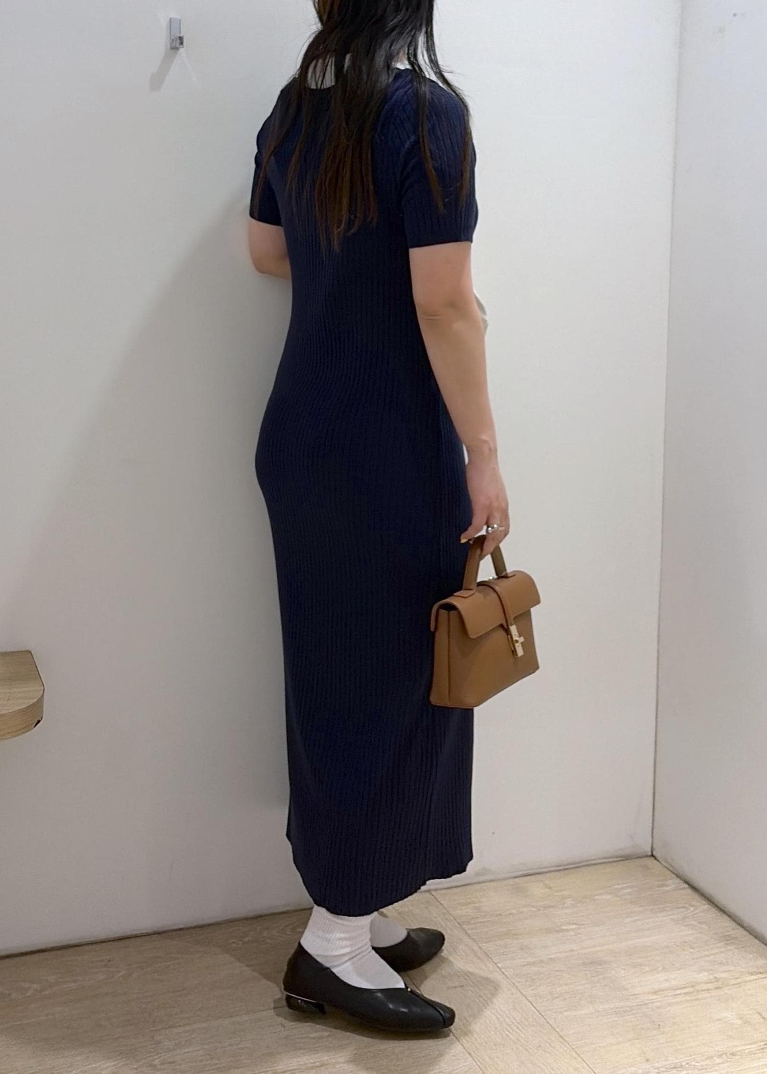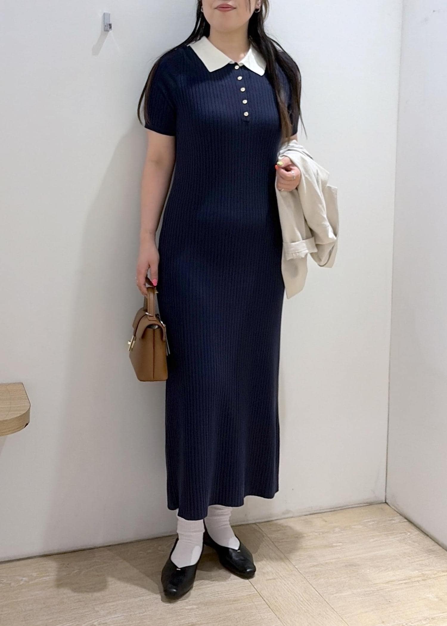 VISポロ襟ニットワンピースネイビー / F¥7,689レビュー骨格ストレートなので、二の腕や腰回りなどのシルエットを少し拾うなと感じました。
