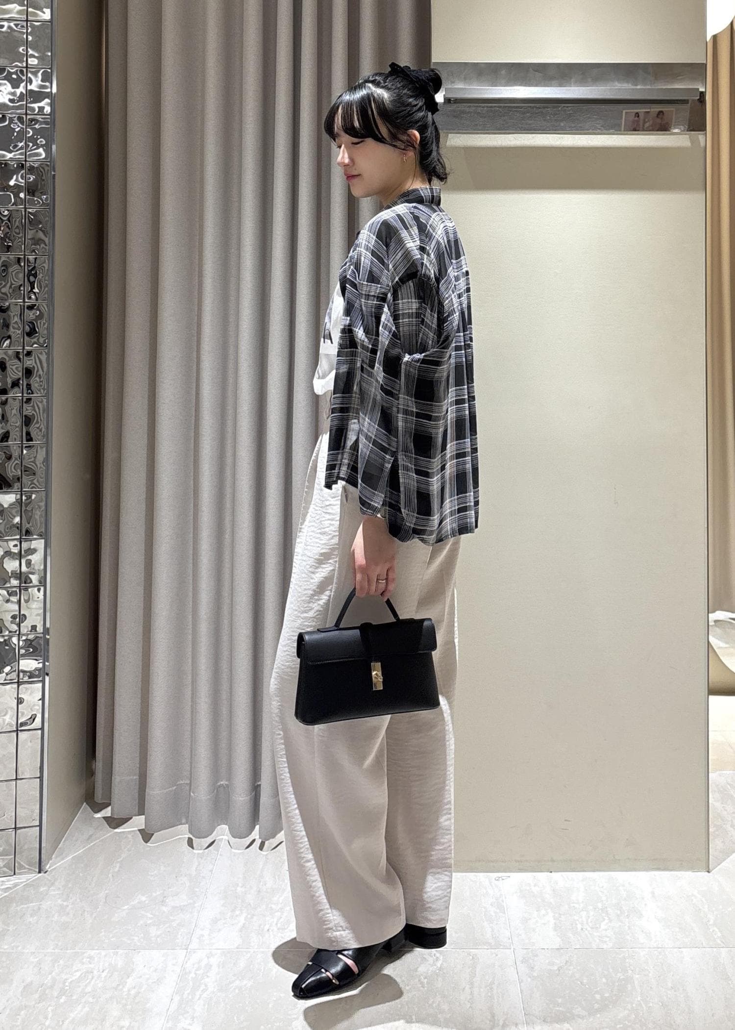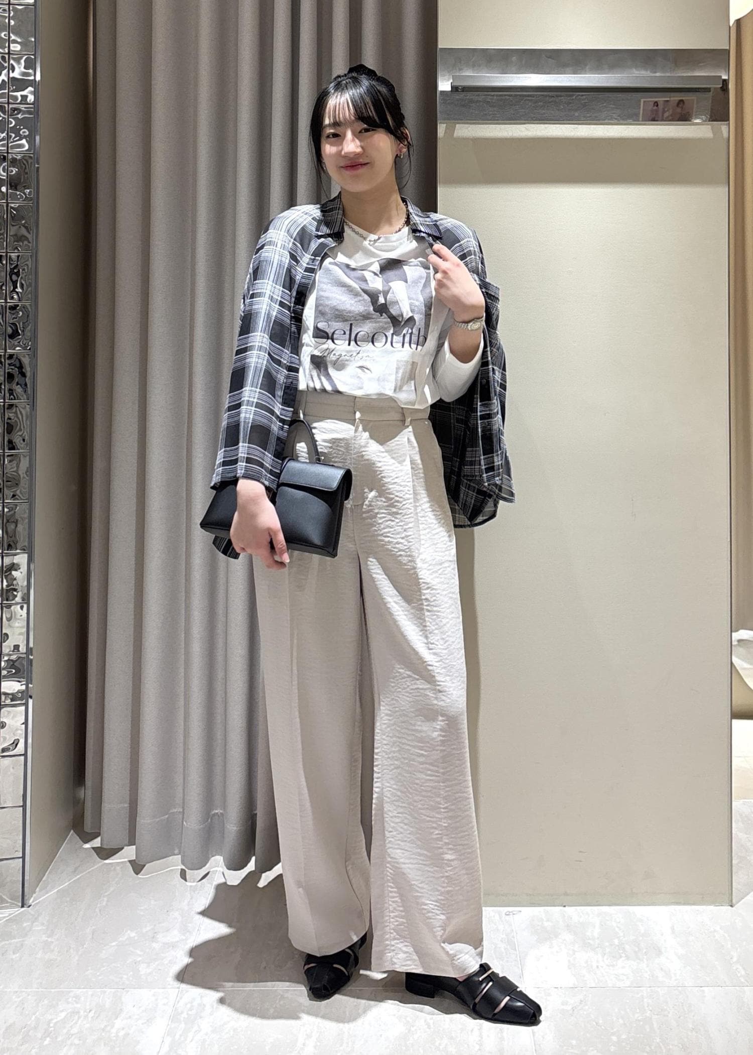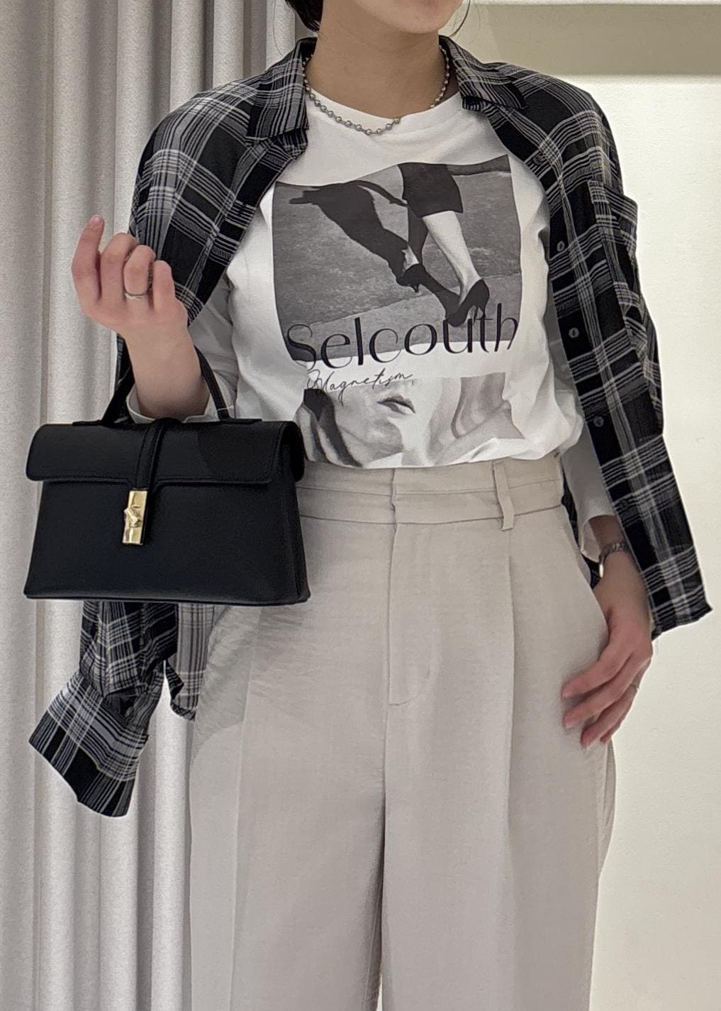 シアー素材ですが、チェック柄で透け感ありすぎず一枚でも着やすいです!