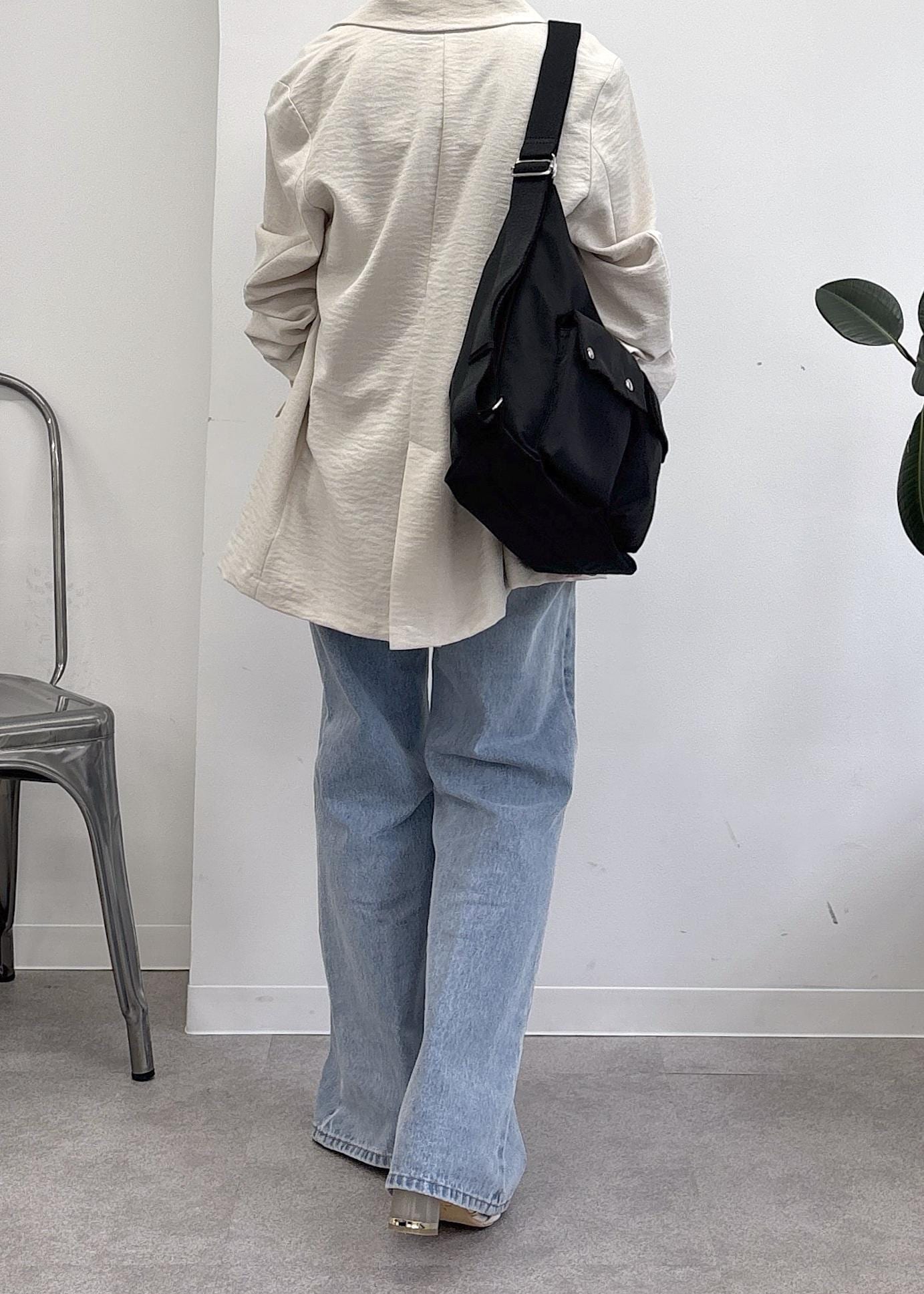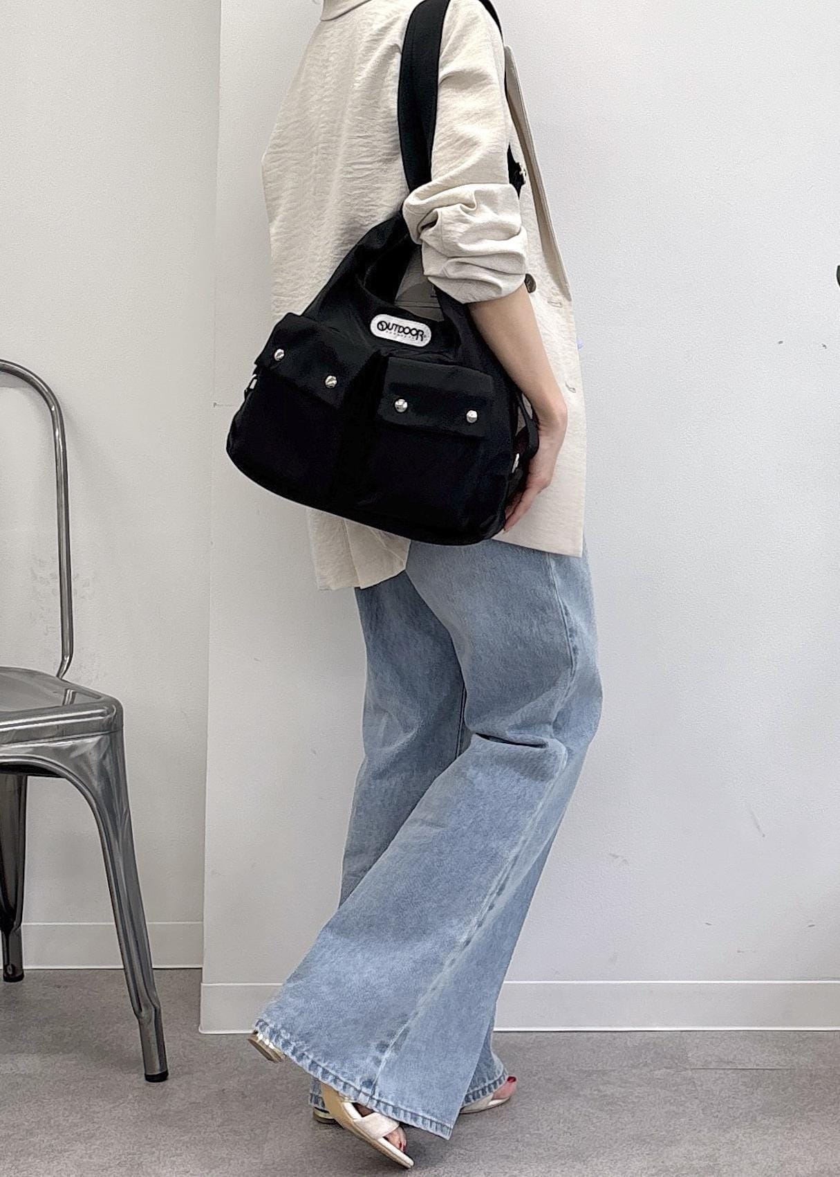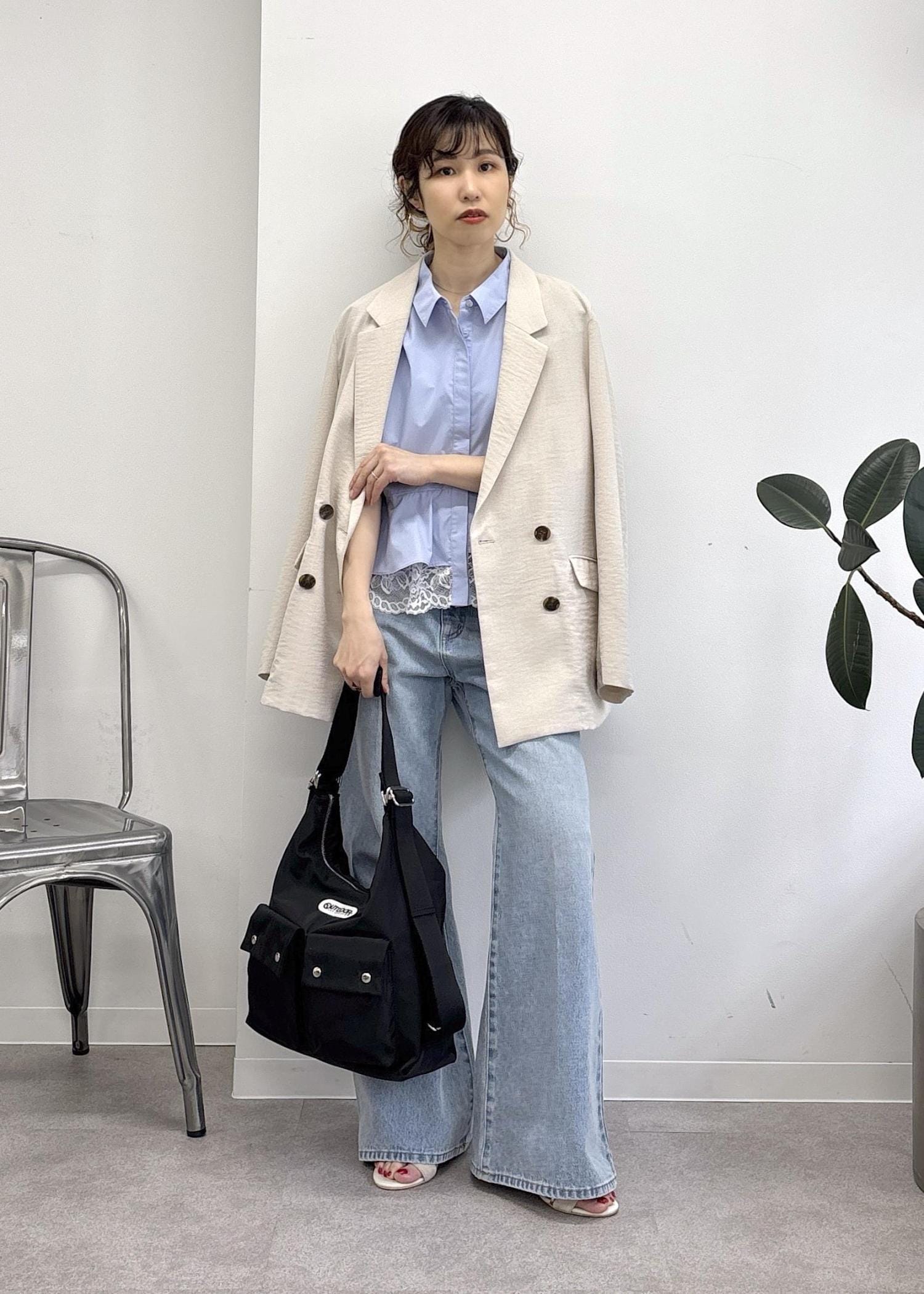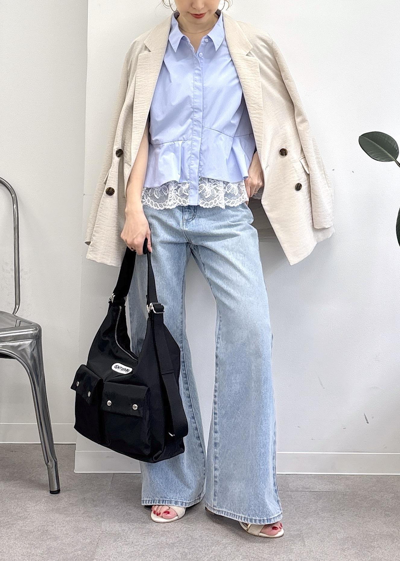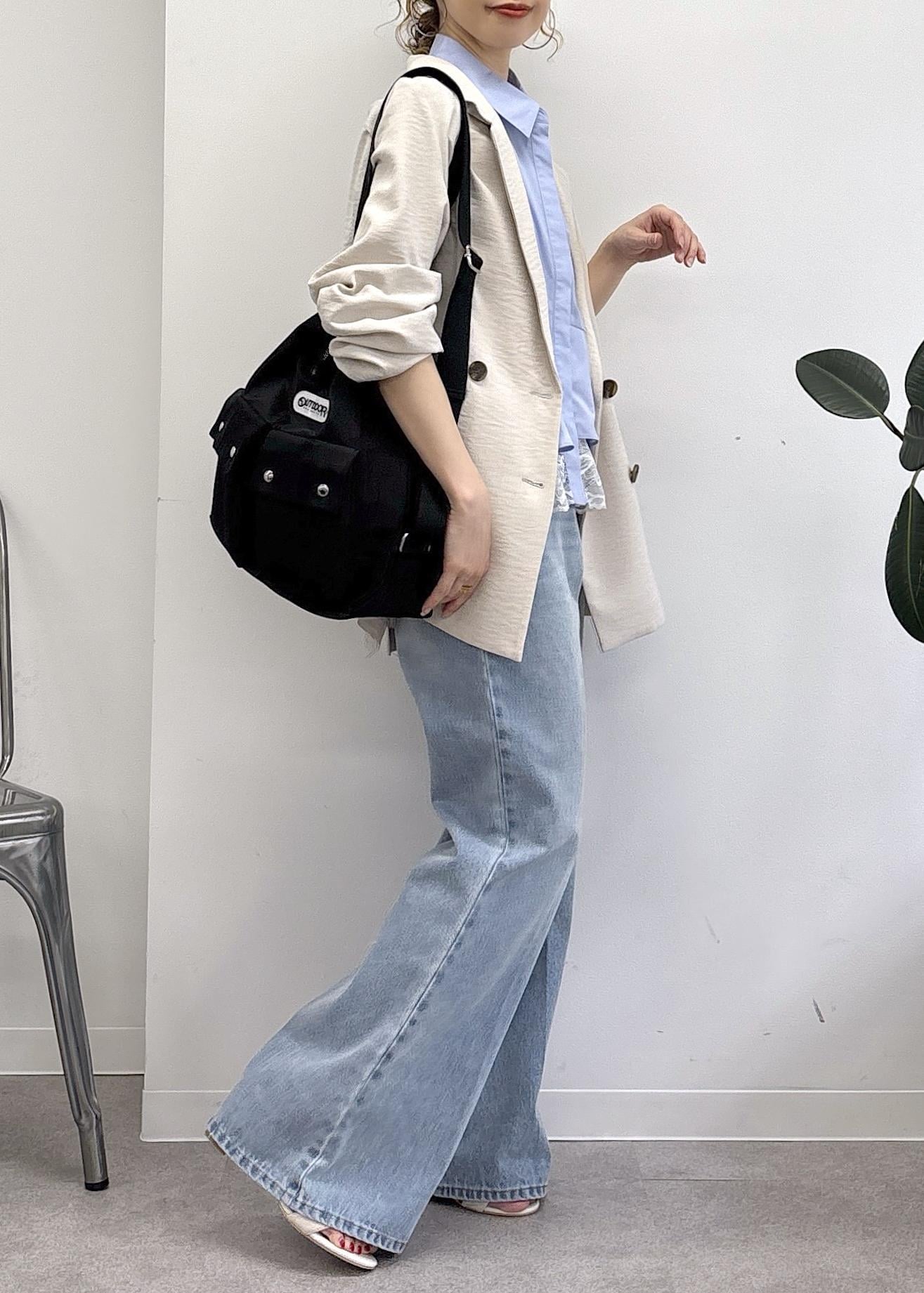 大好評OUTDOOR PRODUCTS × VIS別注バック♪マルチWAYで肩掛けからリュックタイプまで様々な合わせを楽しめる優秀バックをポイントに、ペプラムシャツとフレアデニム、ジャケットで大人カジュアルにまとめました◎カジュアルだけど、女性らしさがテーマ。