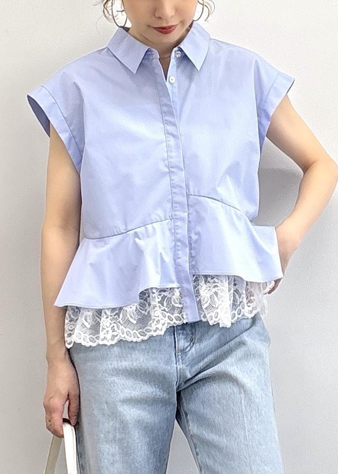予約VIS裾レース切替 襟付きフレンチスリーブブラウス/接触冷感・イージーケアサックス / F¥5,929レビューレースヘムが今年らしい大人可愛いシャツ♪ドッキング仕様、レースがアクセントでトレンド感◎さらっとした着心地で締め付け感を感じない、けれど切り替えでスタイルup見えするデザインが夏着映えします。全体的に程よくゆとりがあり、着丈は腰くらいの長さでした。