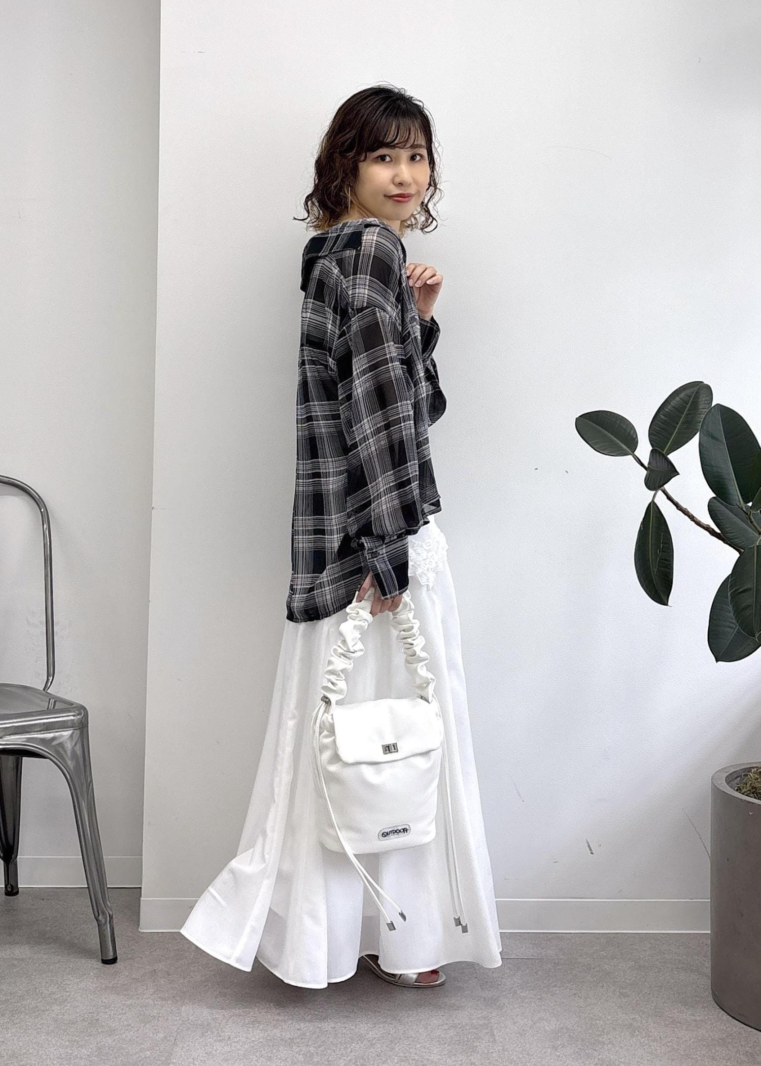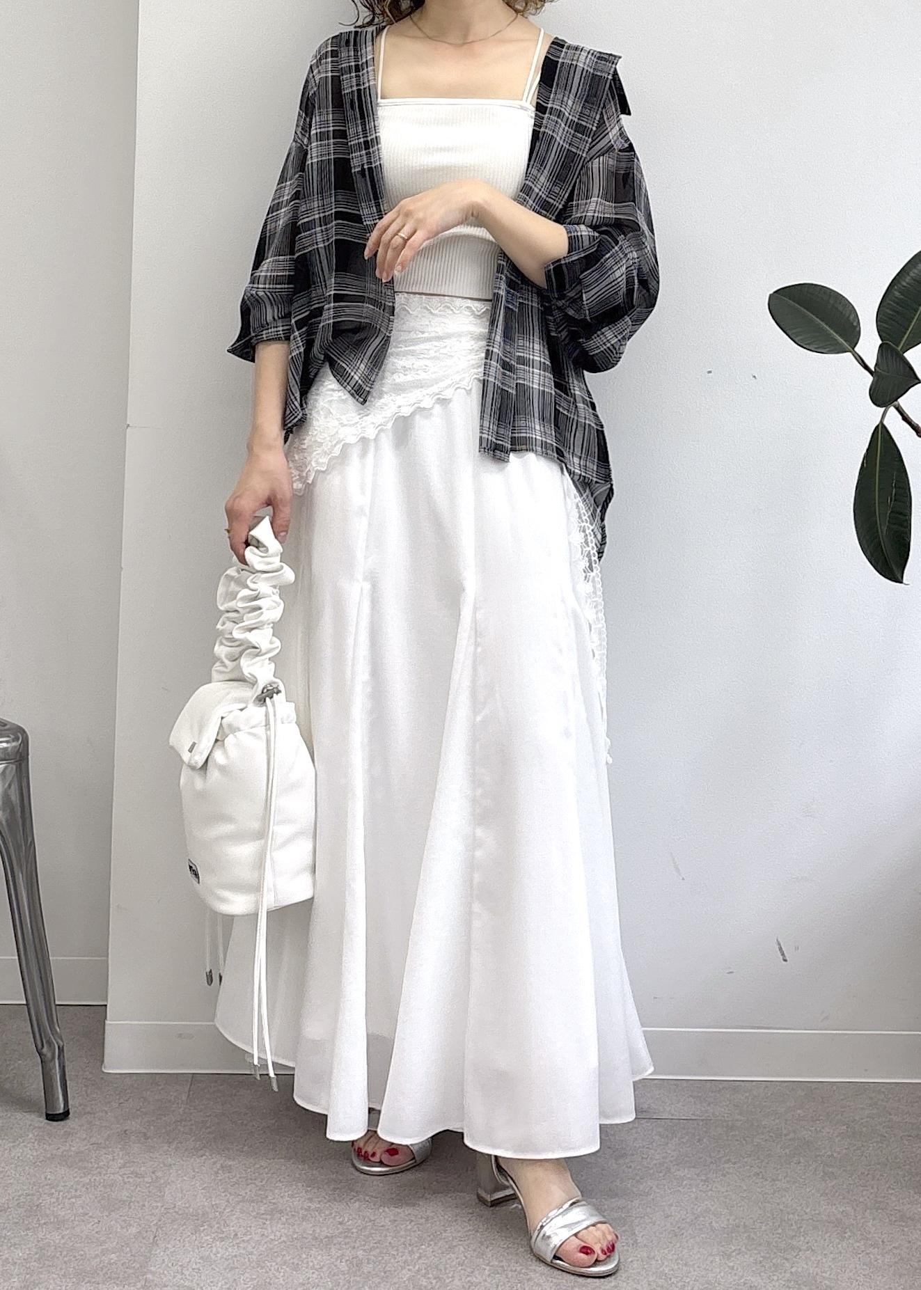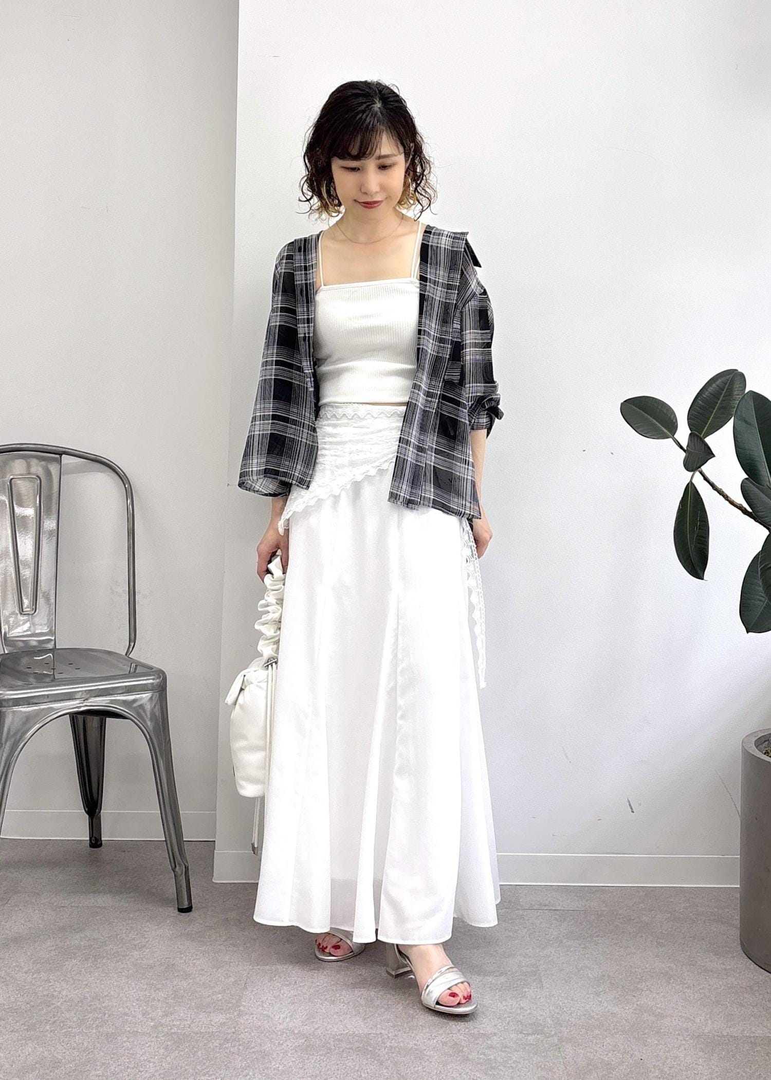 軽くてさらっと羽織れるチェックシャツは今から夏の冷房対策まで長く着回せる優秀アイテム♪今回はホワイトのインナーとフレアスカートで大人カジュアルにまとめました◎今年らしく腰にレーススカーフをさりげなくポイントにしました。春夏のお出かけコーデにぴったりです。