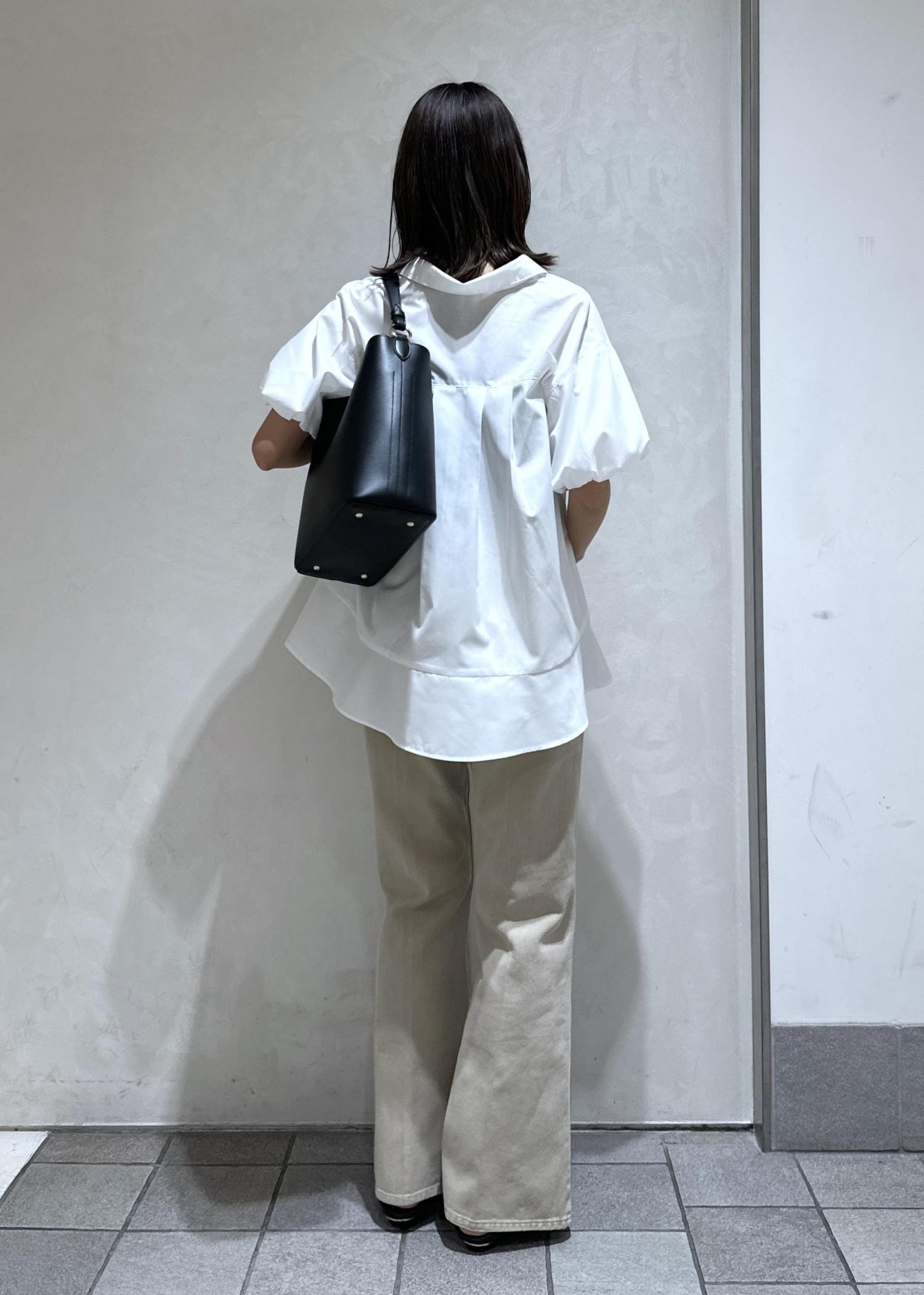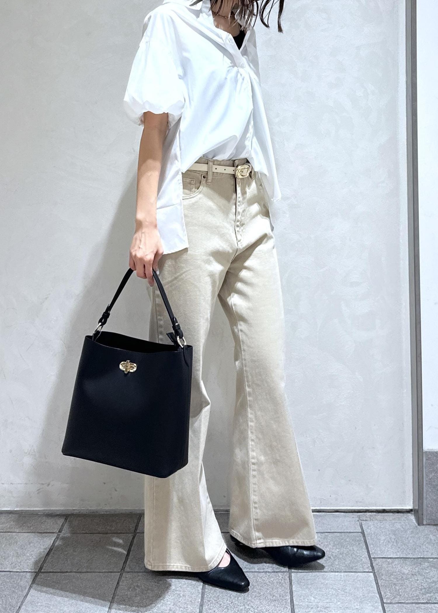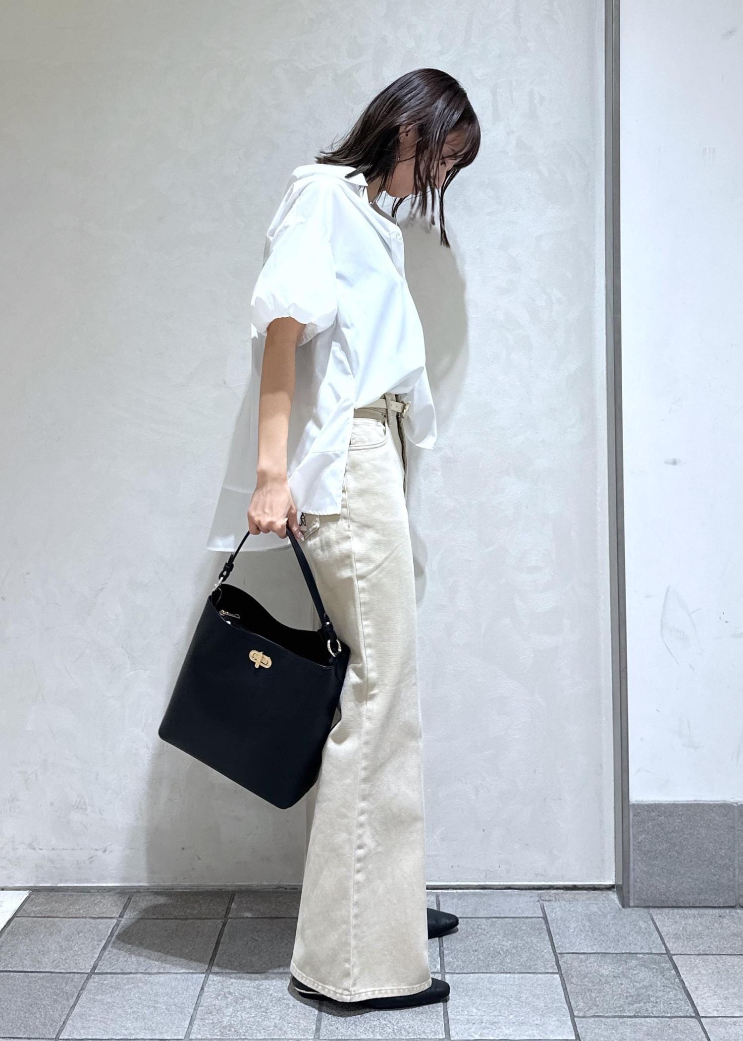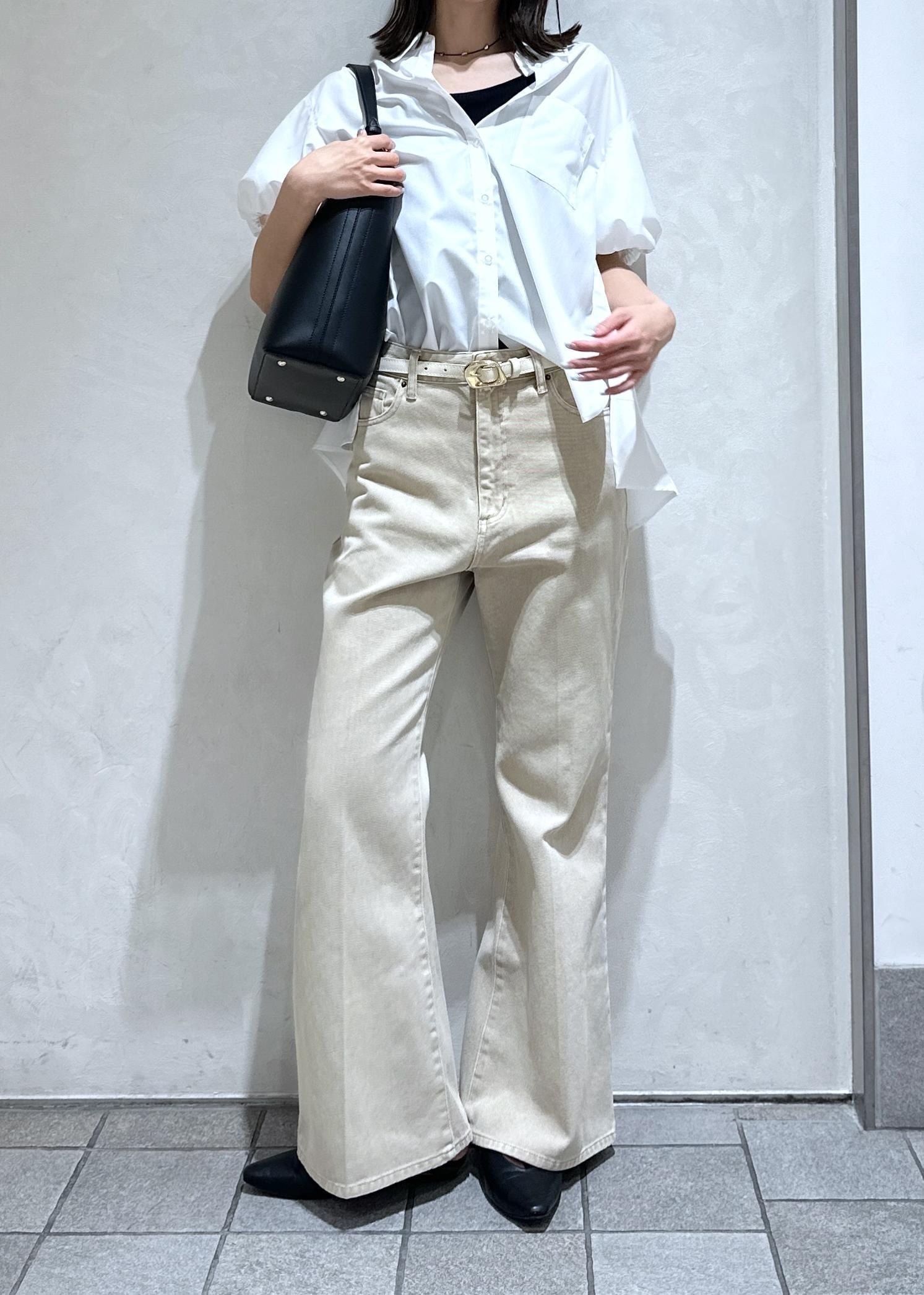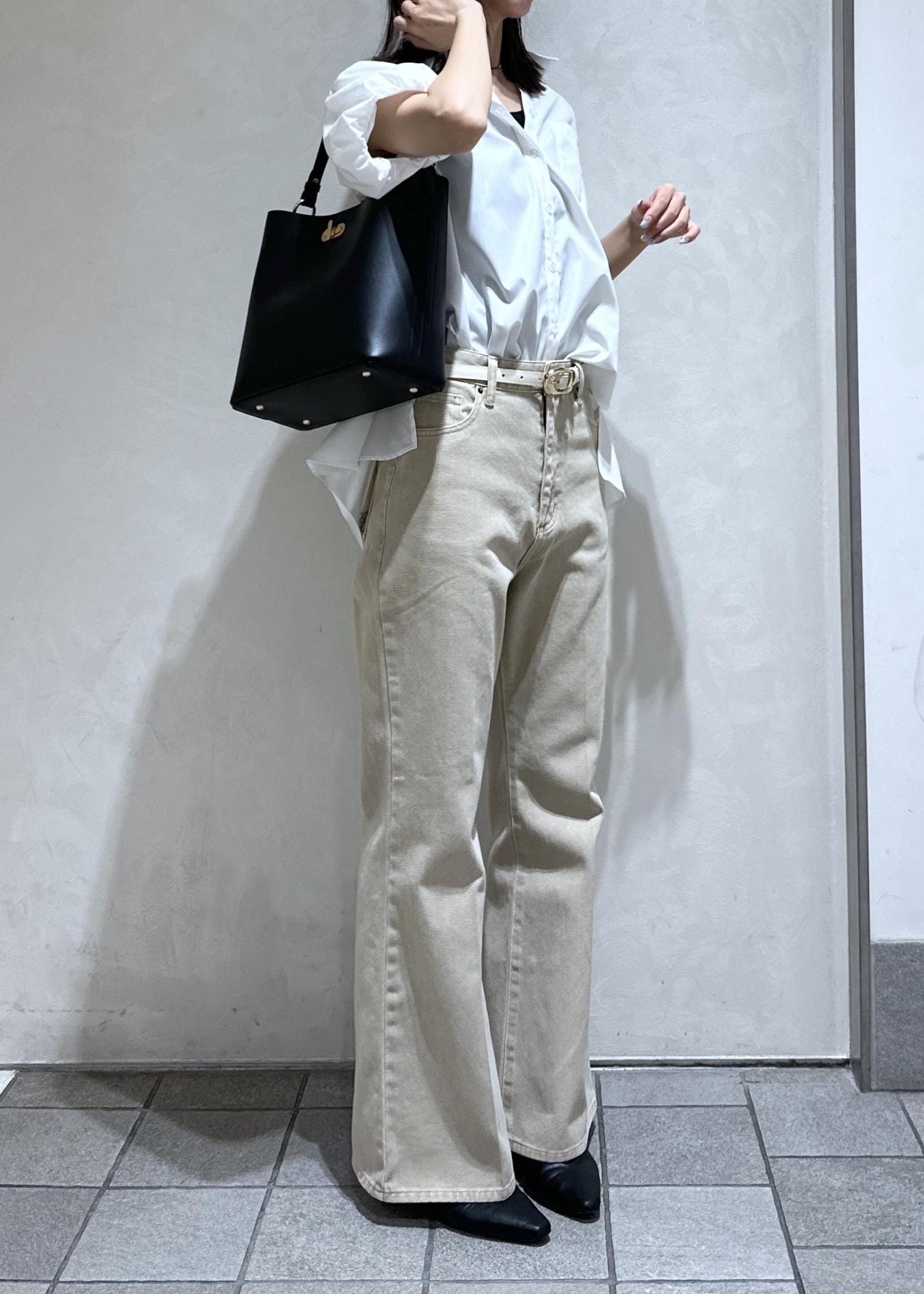 白シャツとベージュのデニムでやさしい印象に。