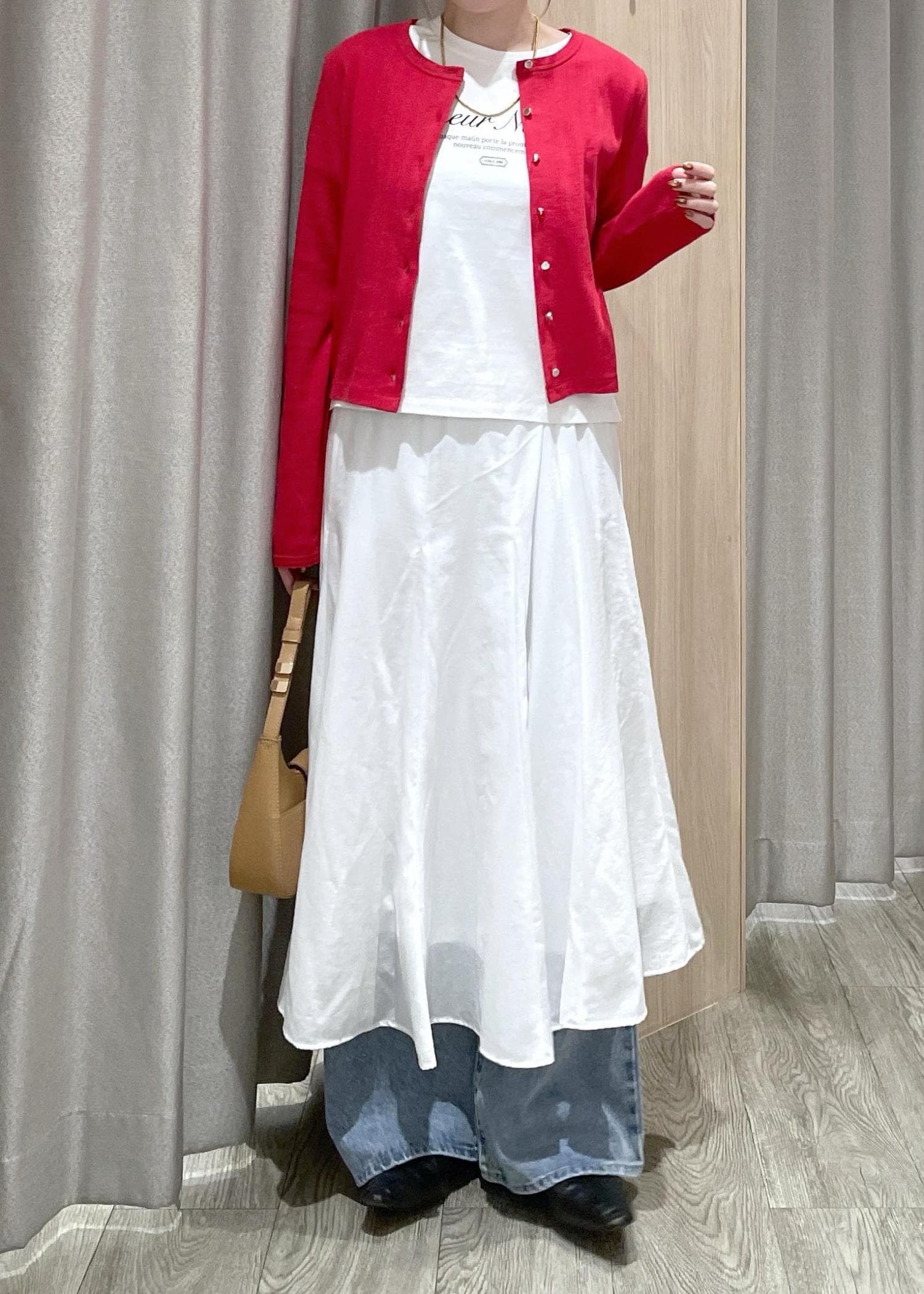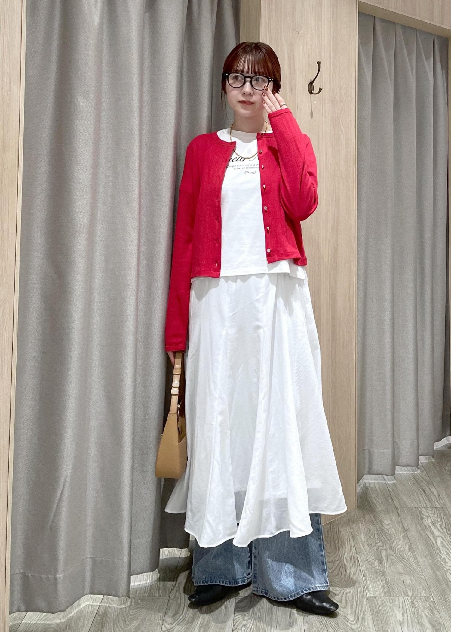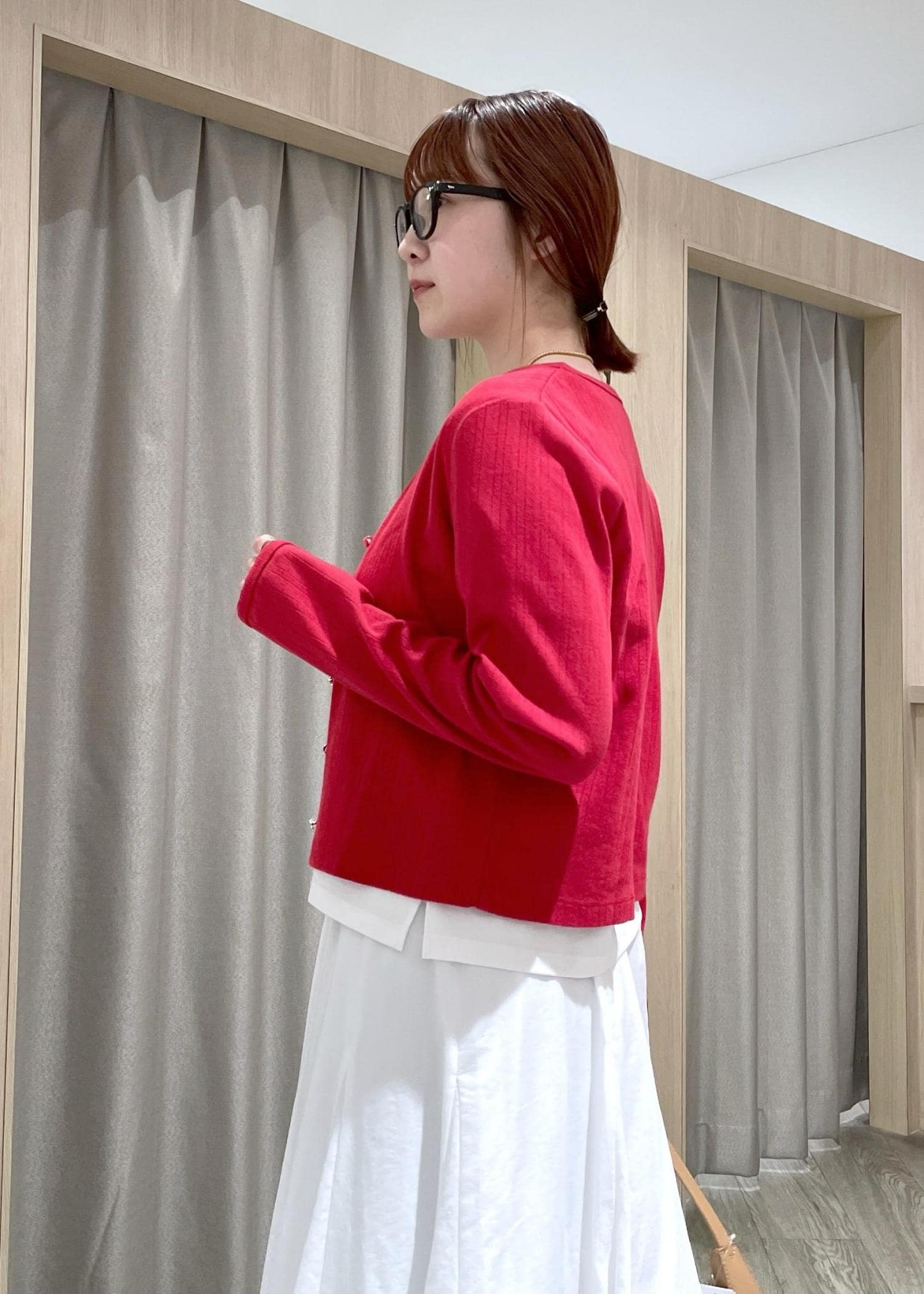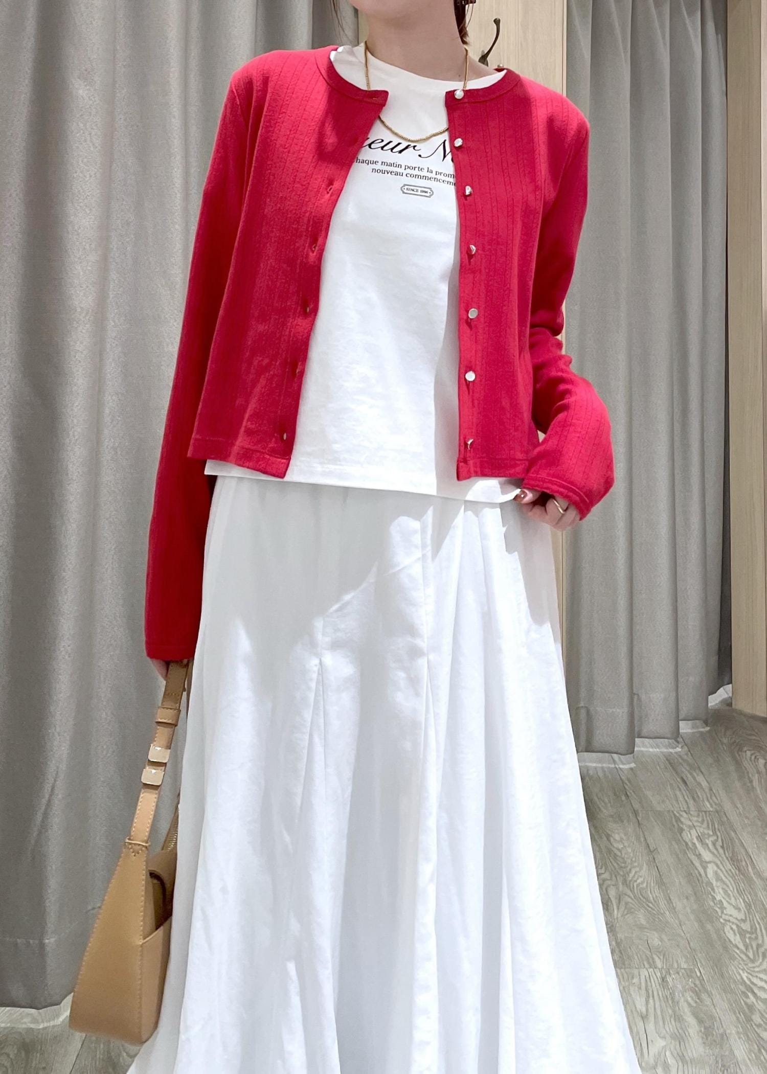 赤のカーディガンをポイントに、