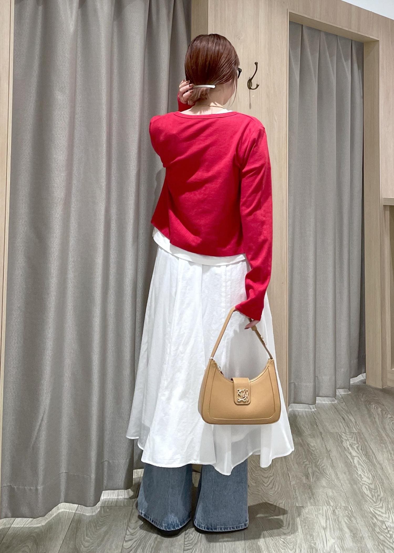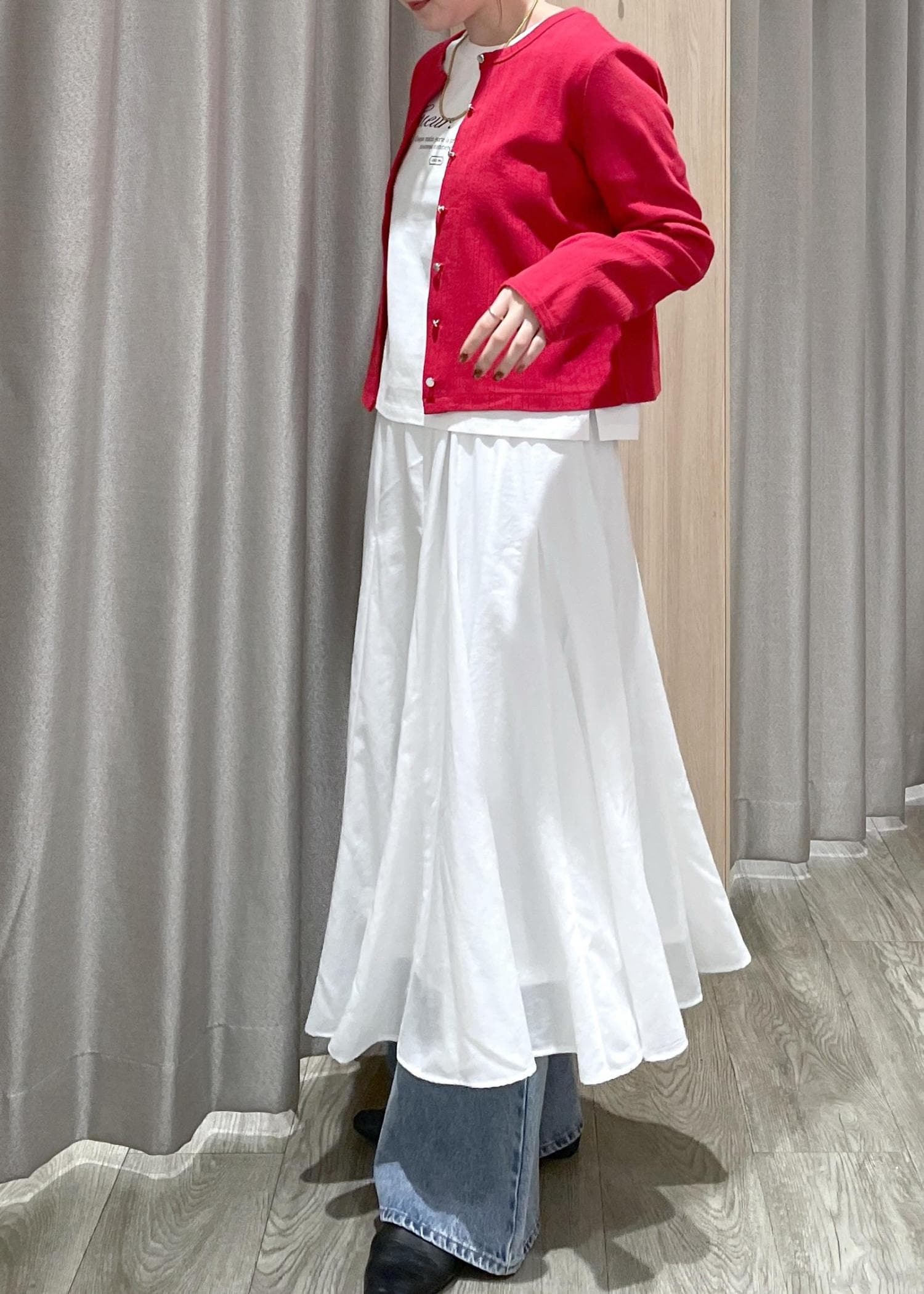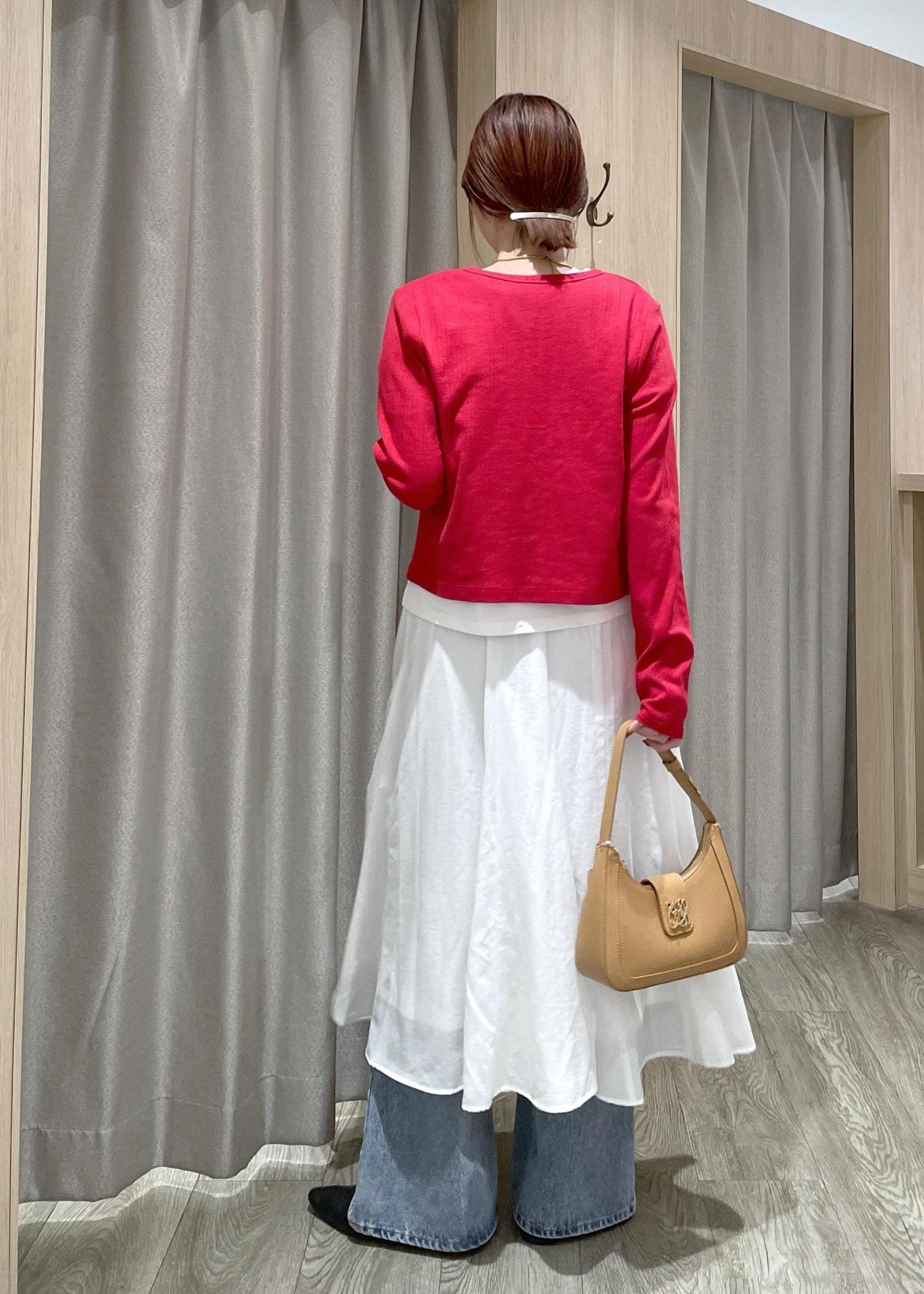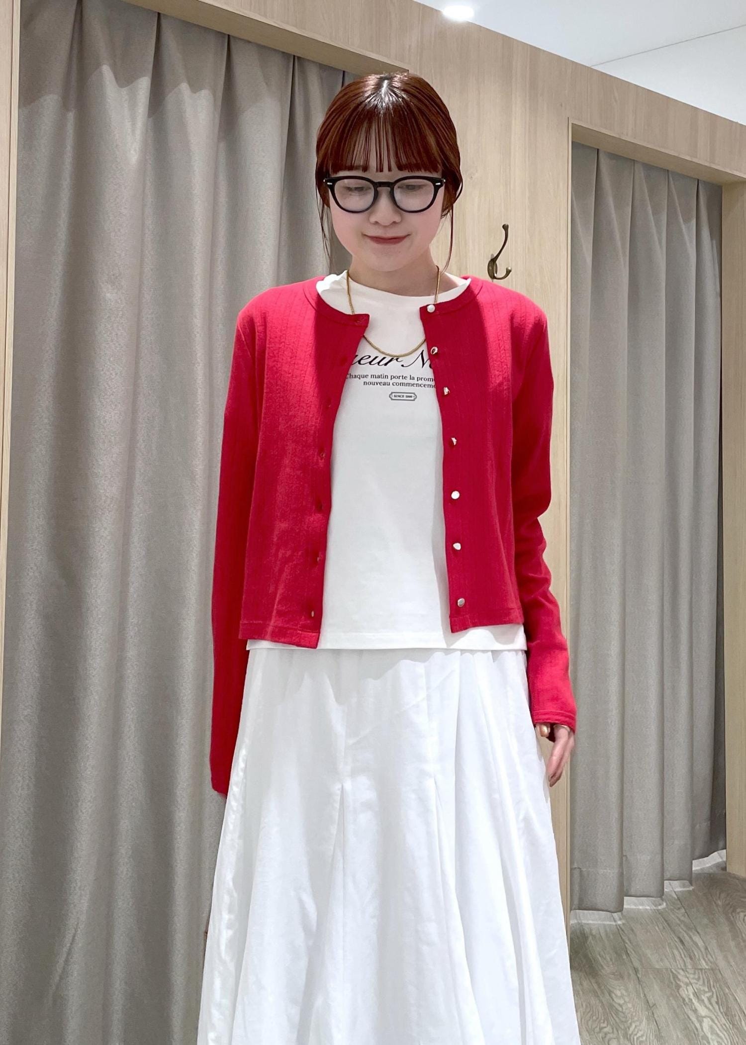 赤のカーディガンをポイントに、