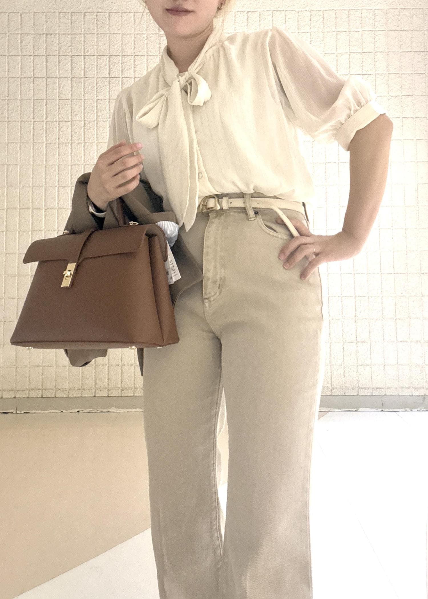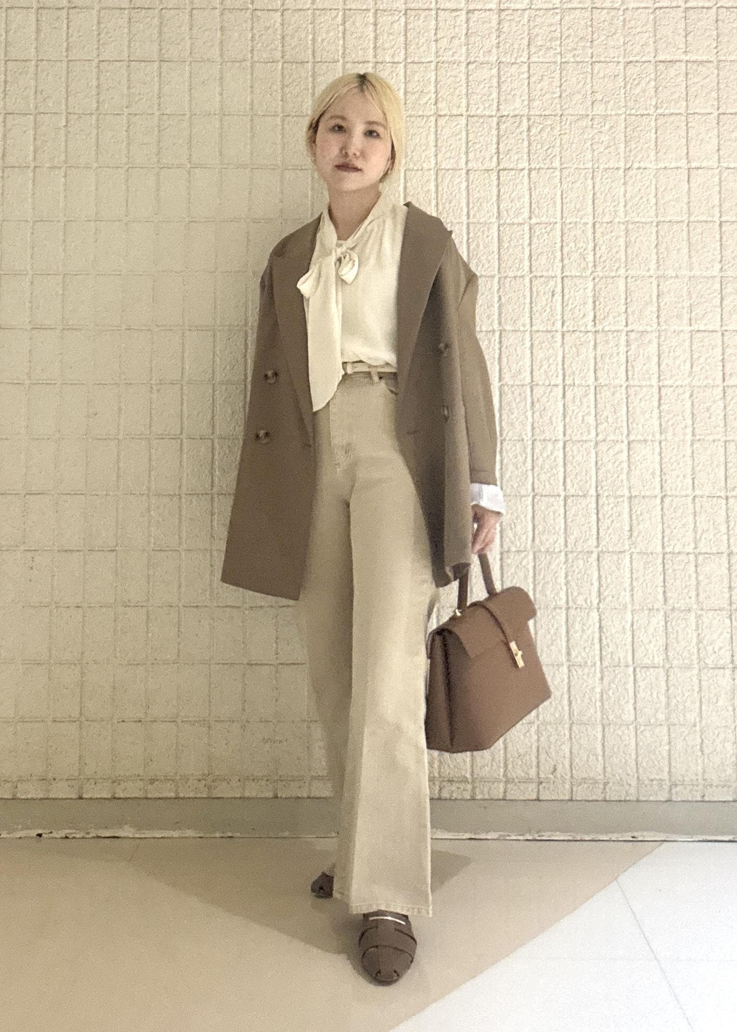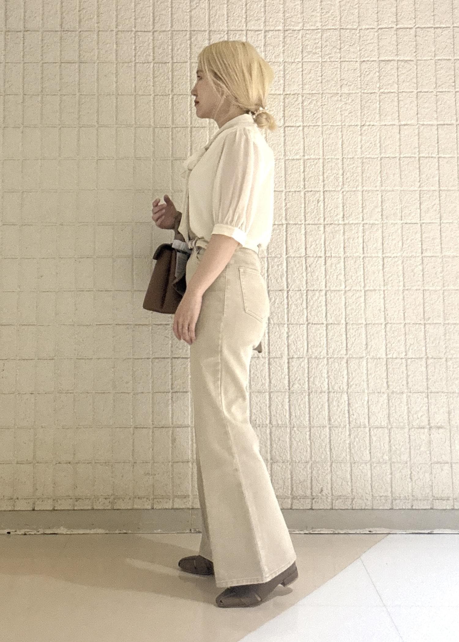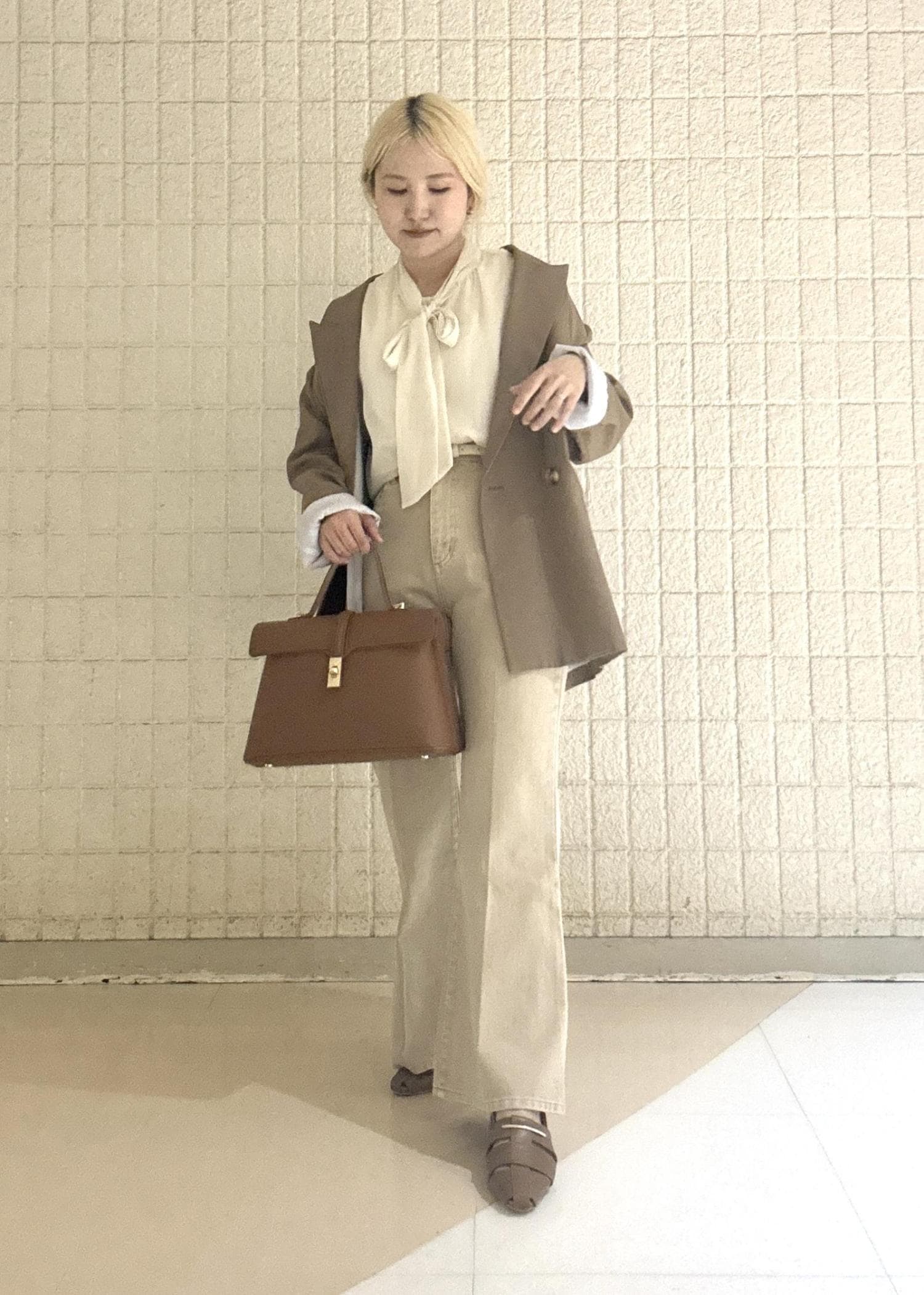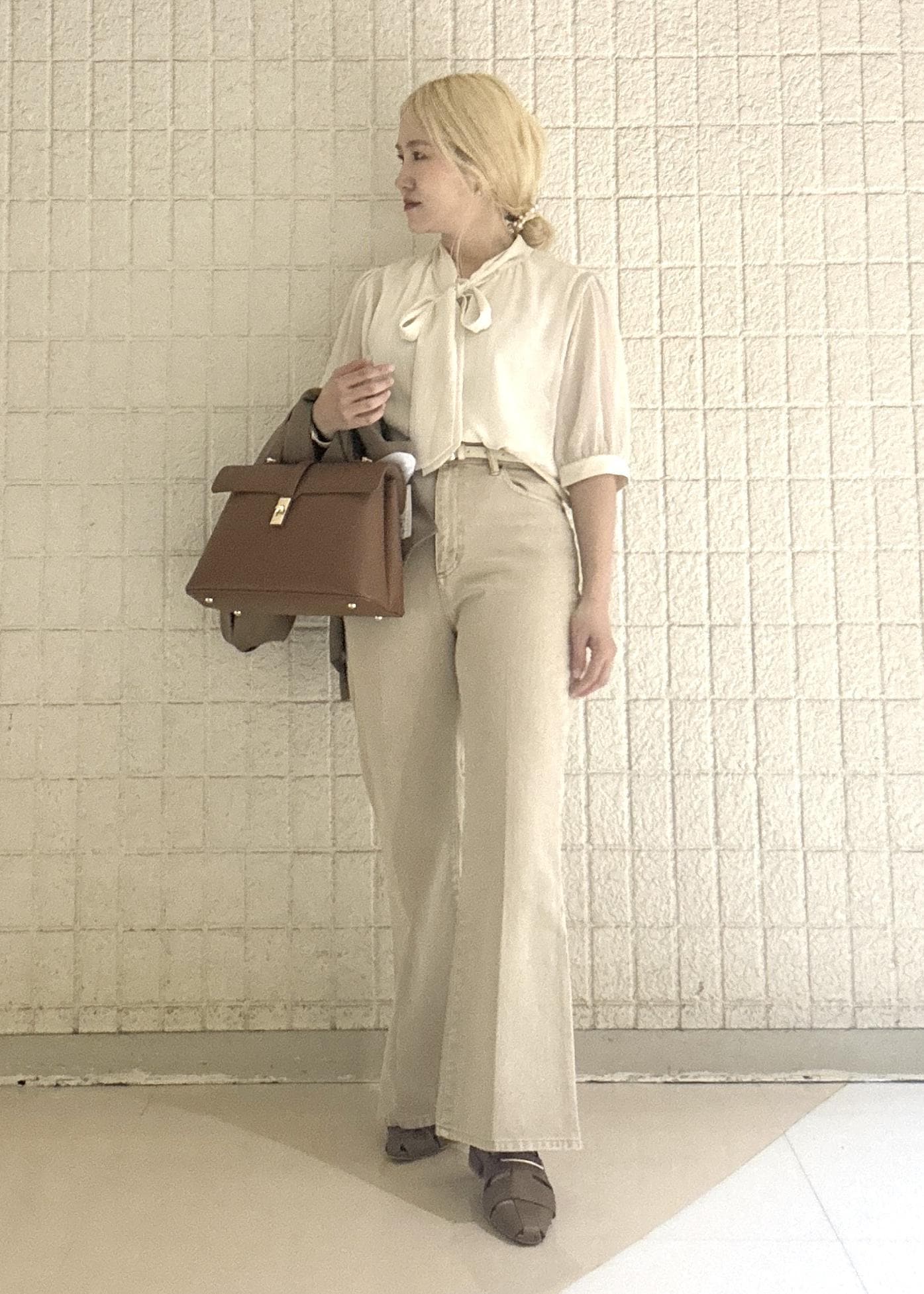 リボンが特徴的なブラウスを甘めな印象を抑えたコーデで組んでみました。