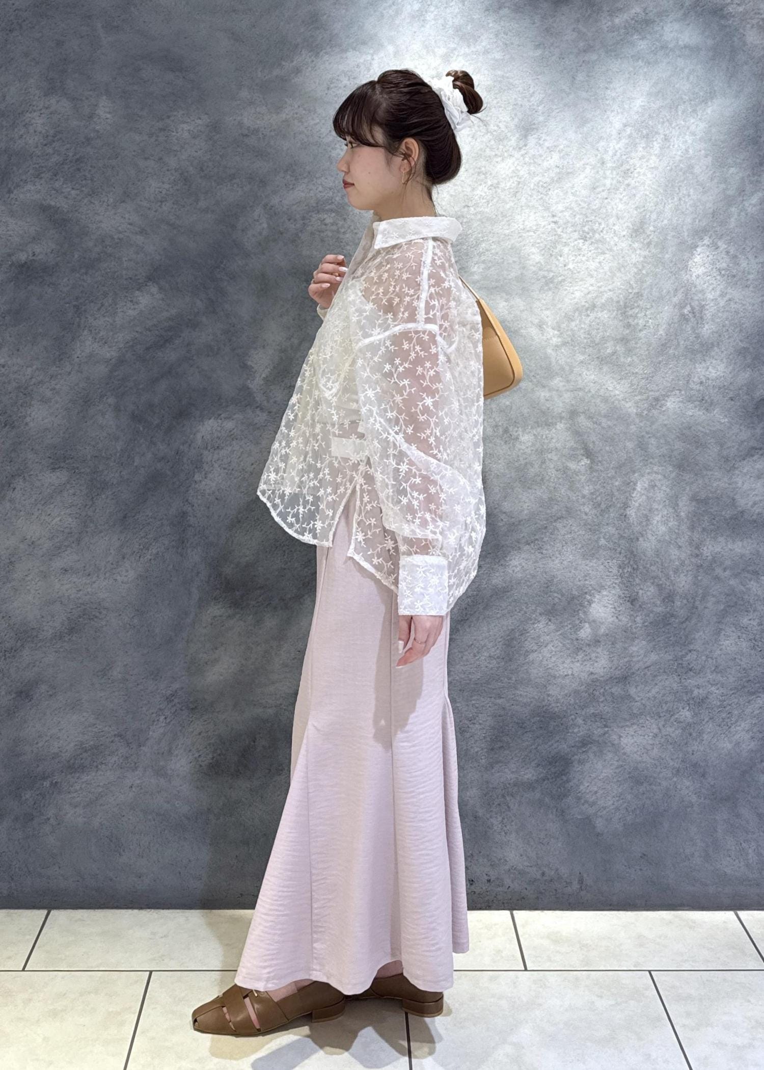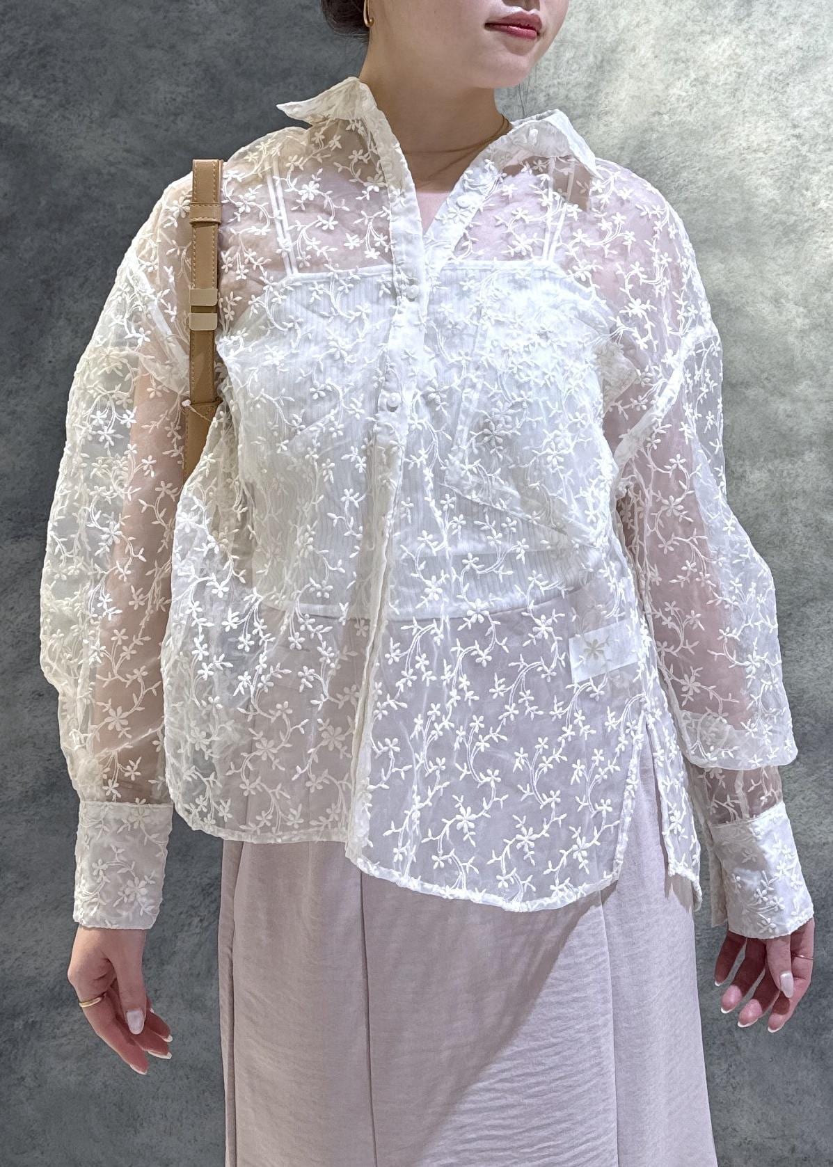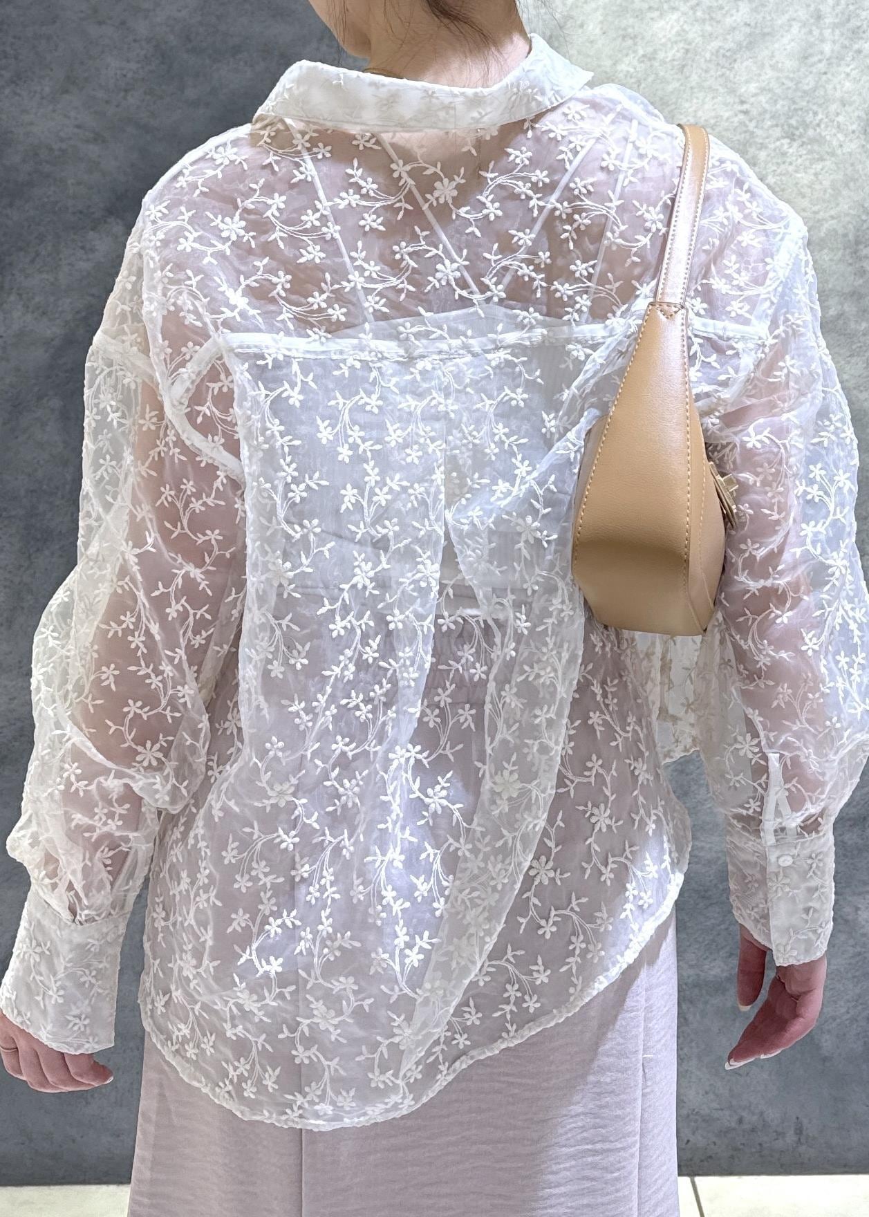 シアー花柄刺繍シャツをポイントに、甘めお出かけコーデ!