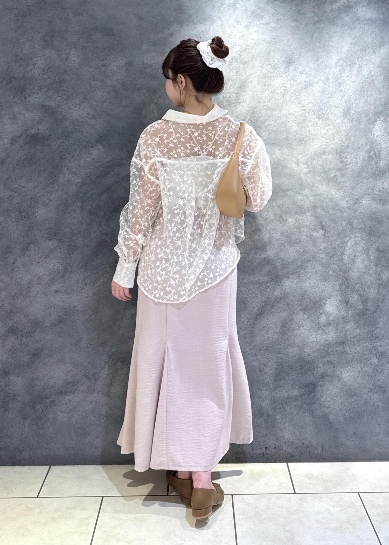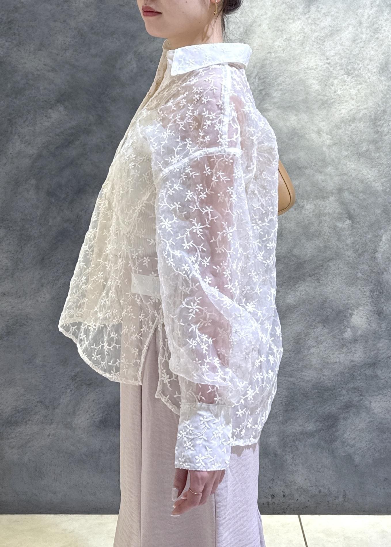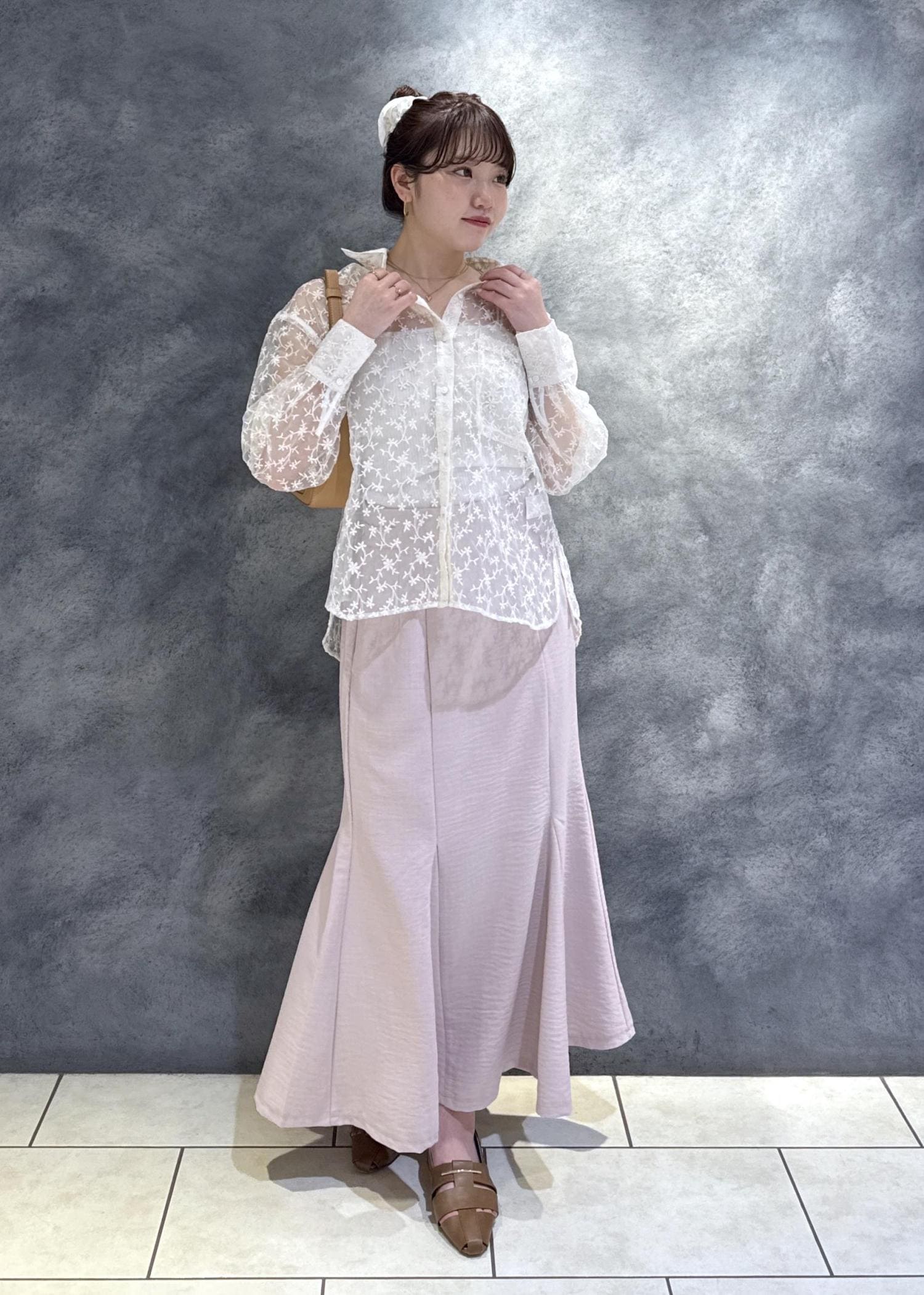シアー花柄刺繍シャツをポイントに、甘めお出かけコーデ!