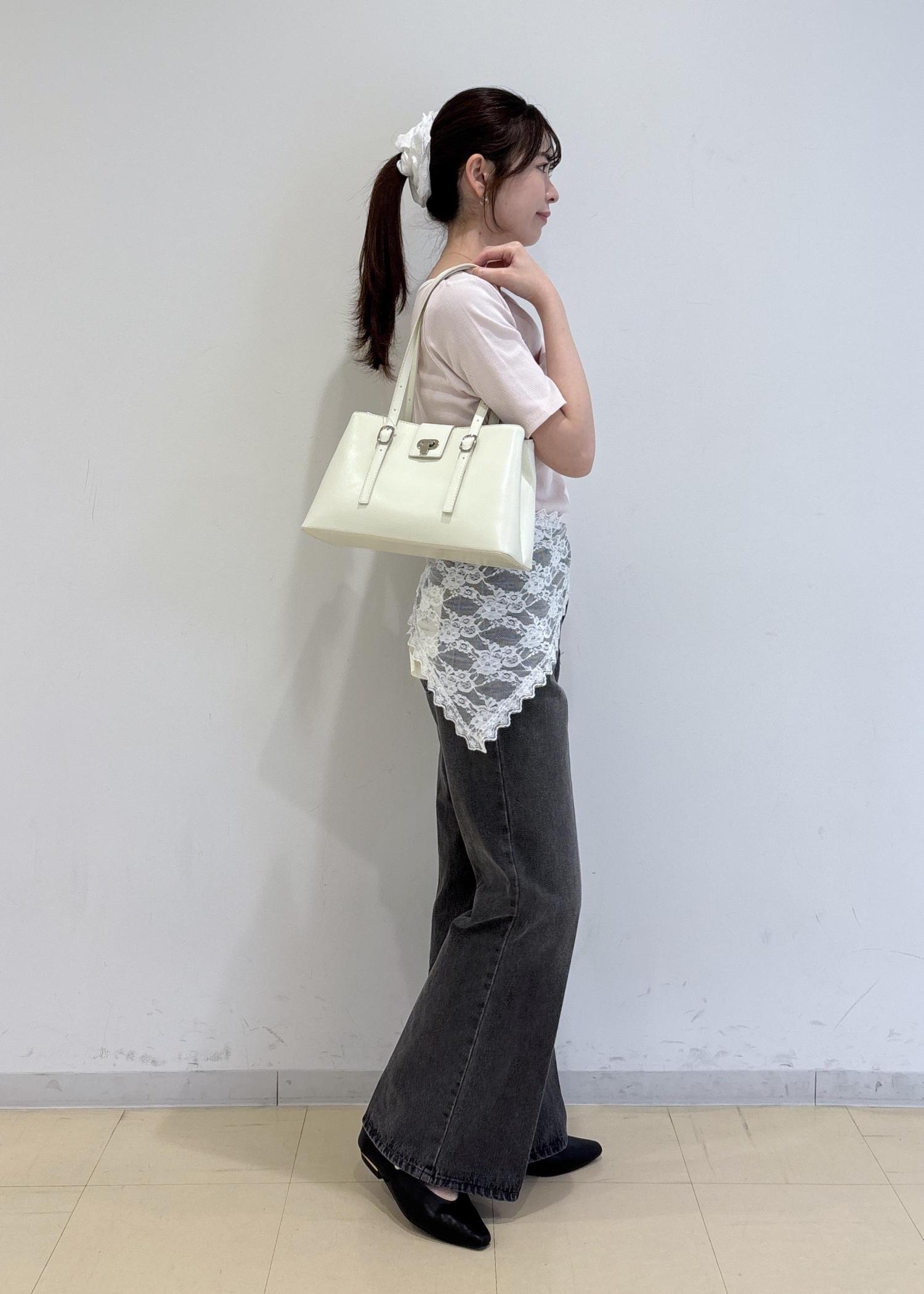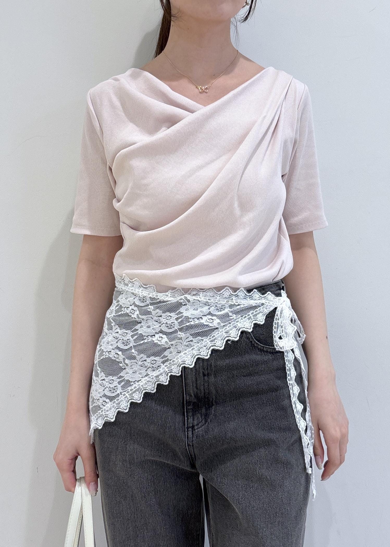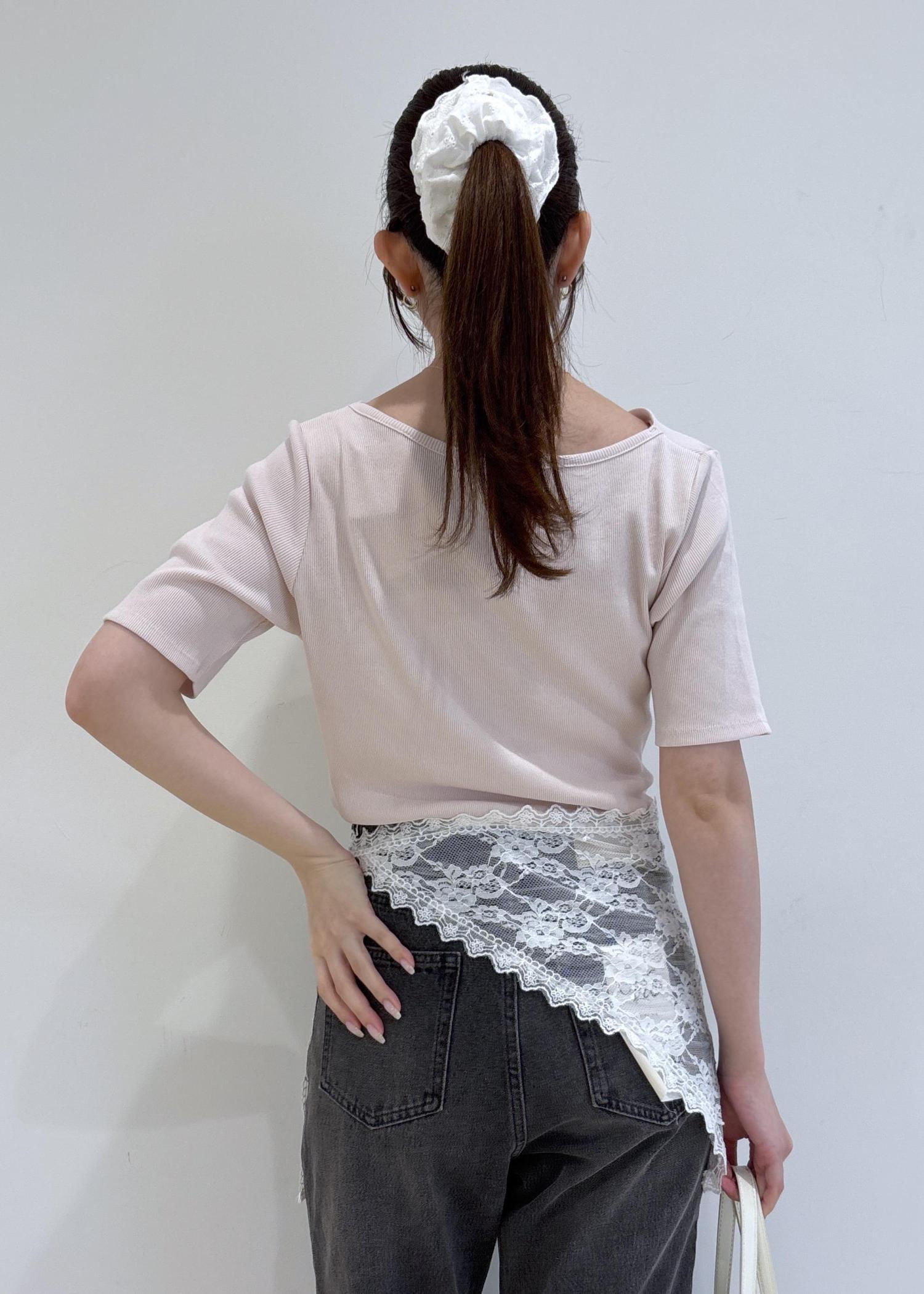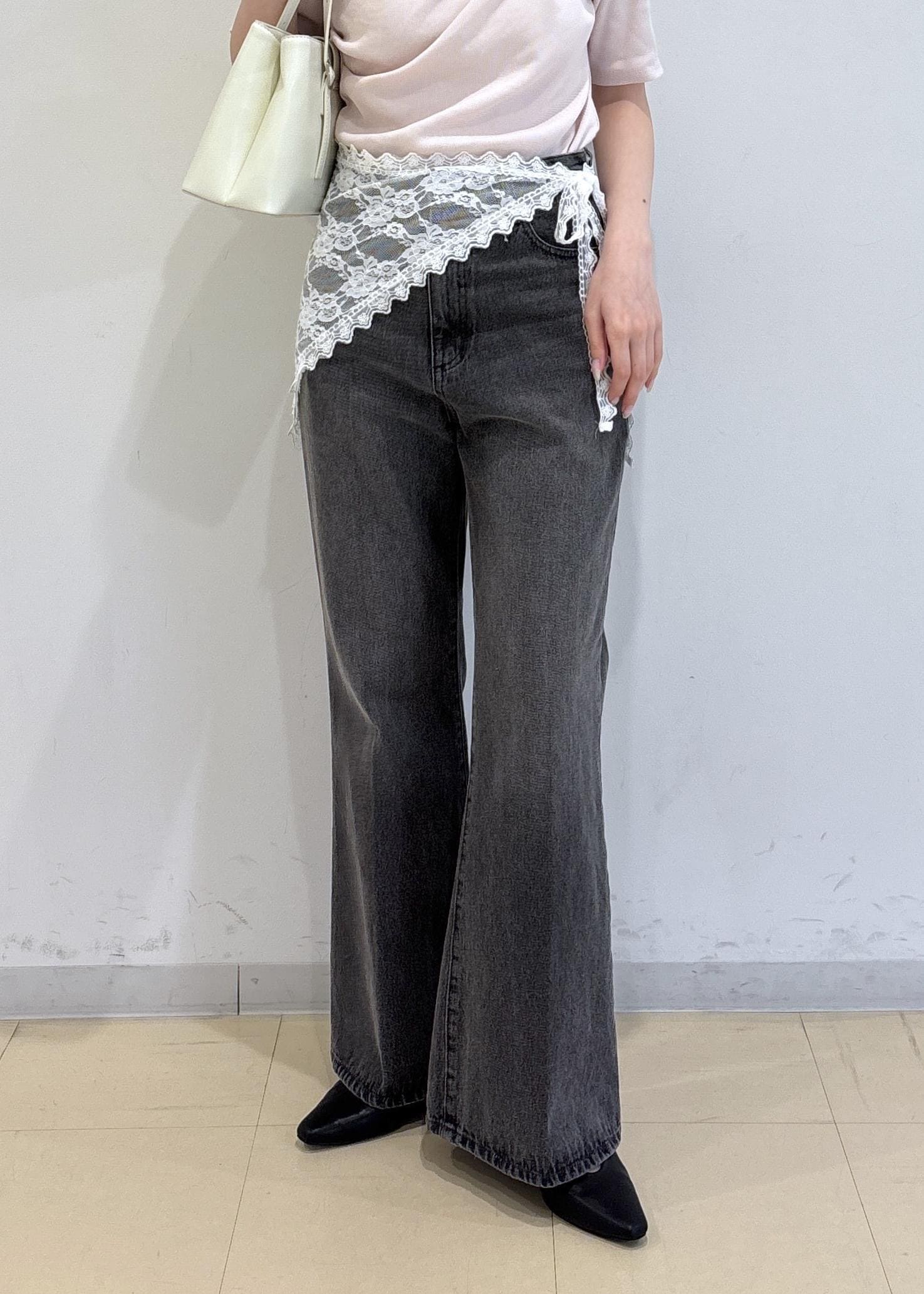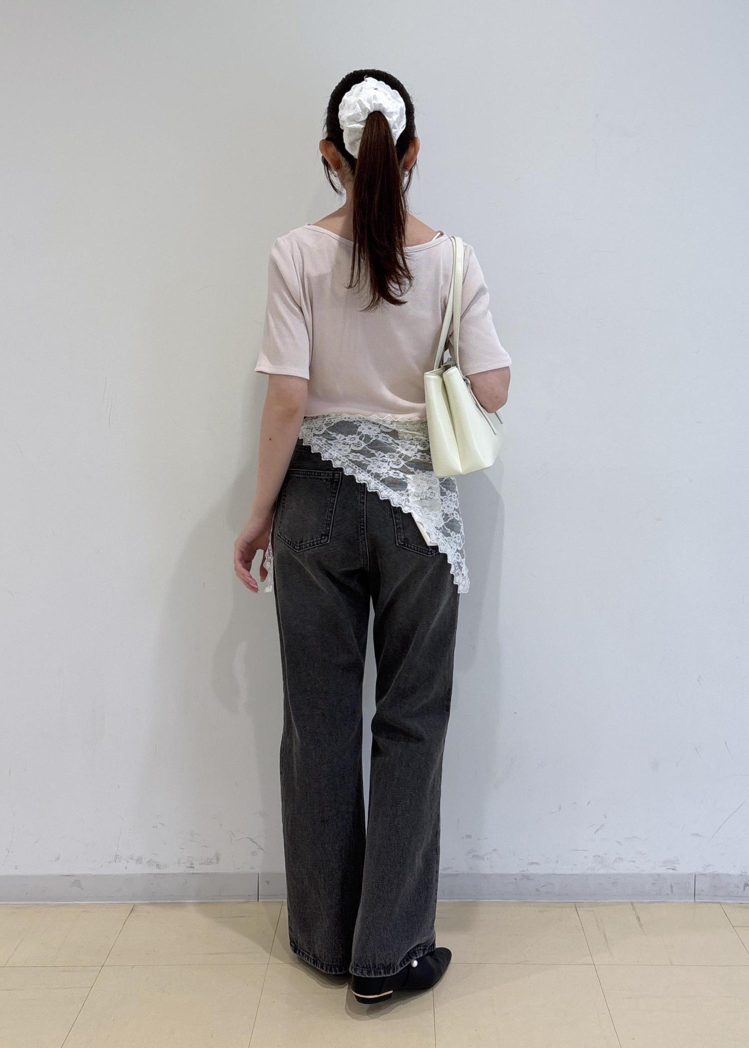 ピンクのトップスにブラックのデニムを合わせることで甘すぎない雰囲気になります。腰にレーススカーフを巻いてトレンド感をプラスしました!