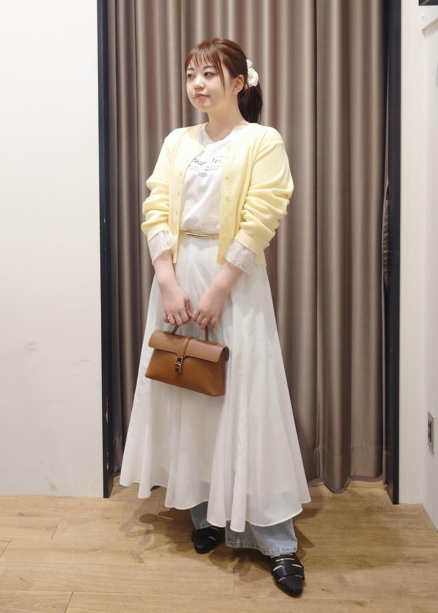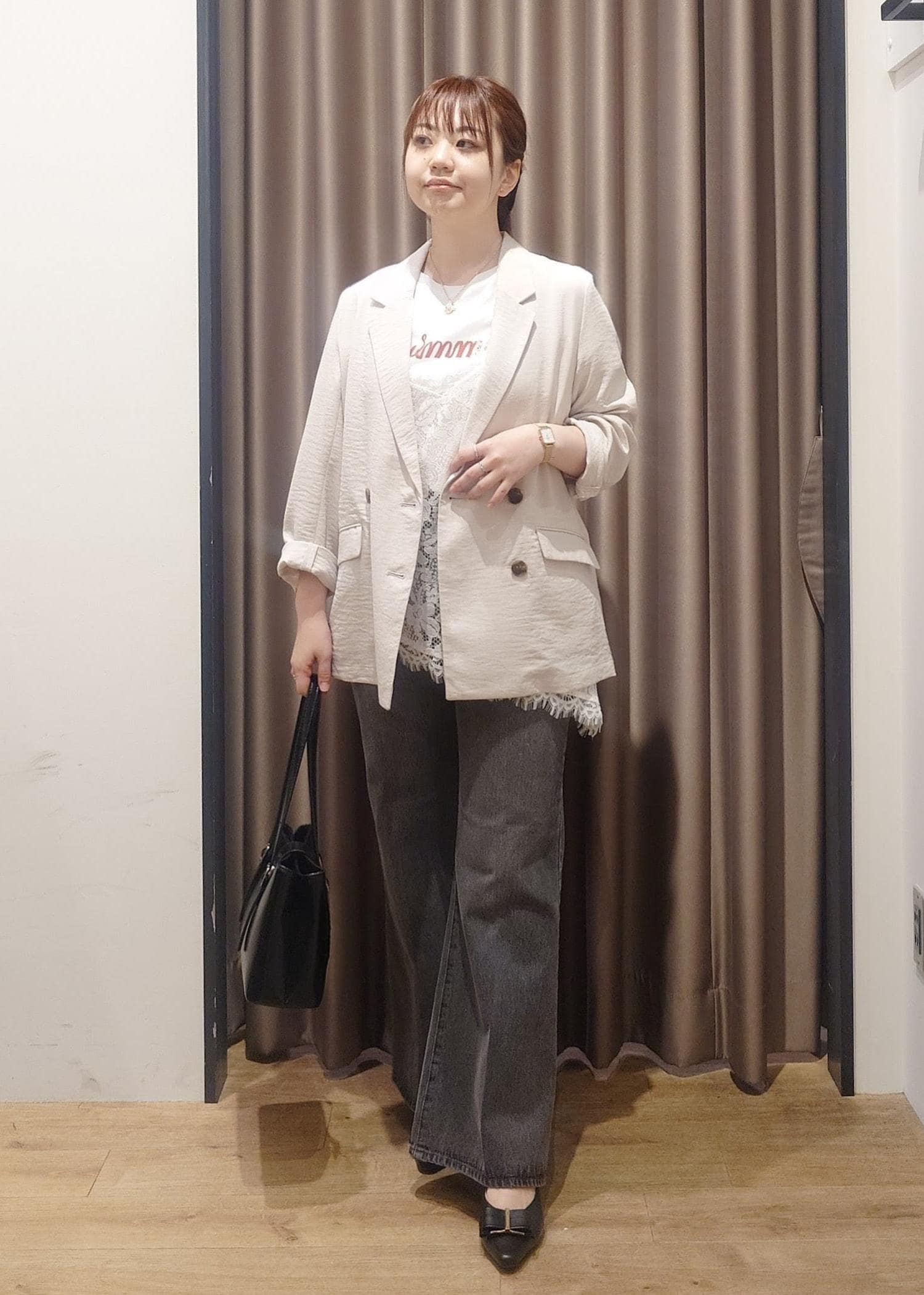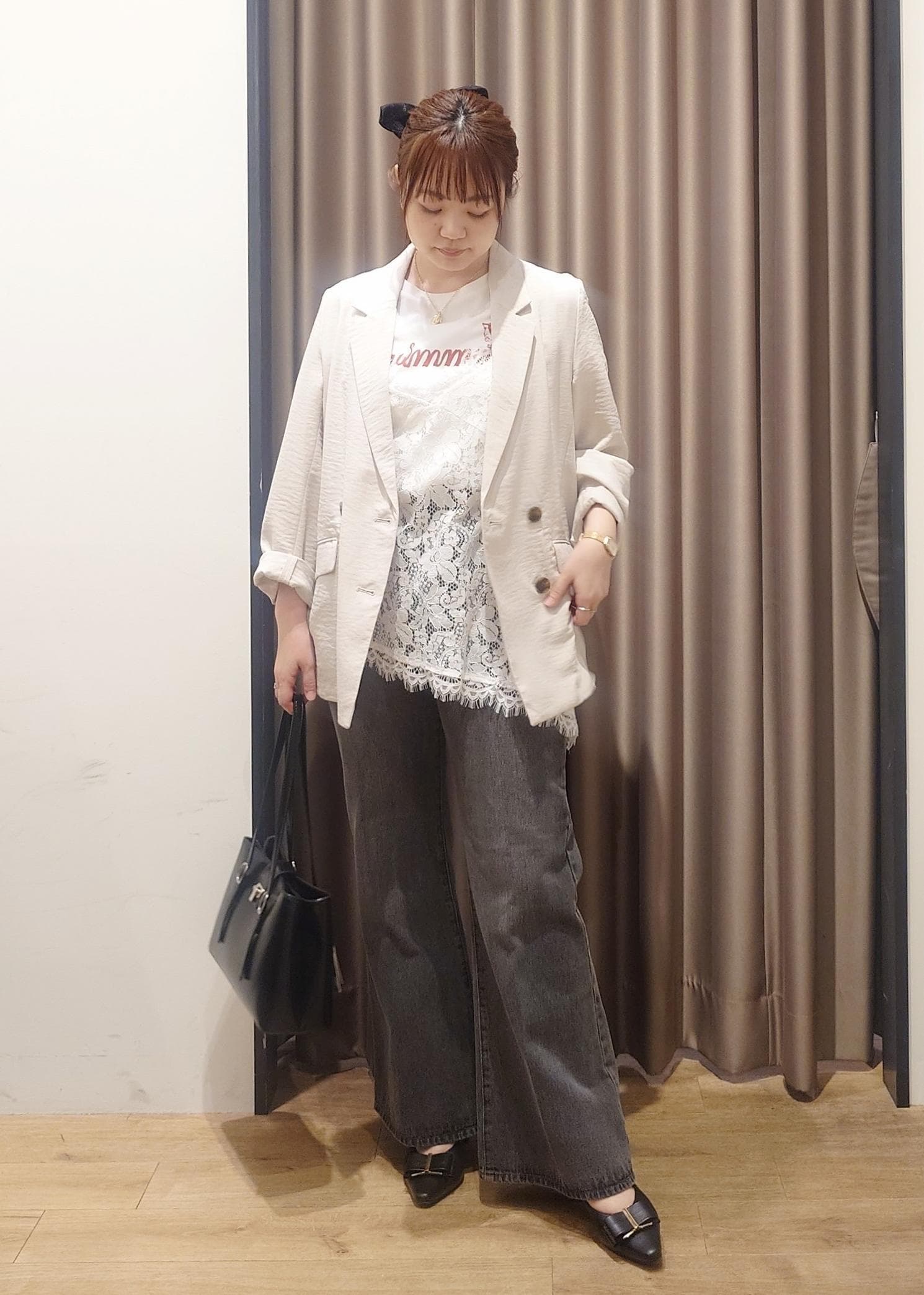 身幅はややゆったりめですが、レースなのでかさばらずにレイヤードスタイルをつくれます。 -
