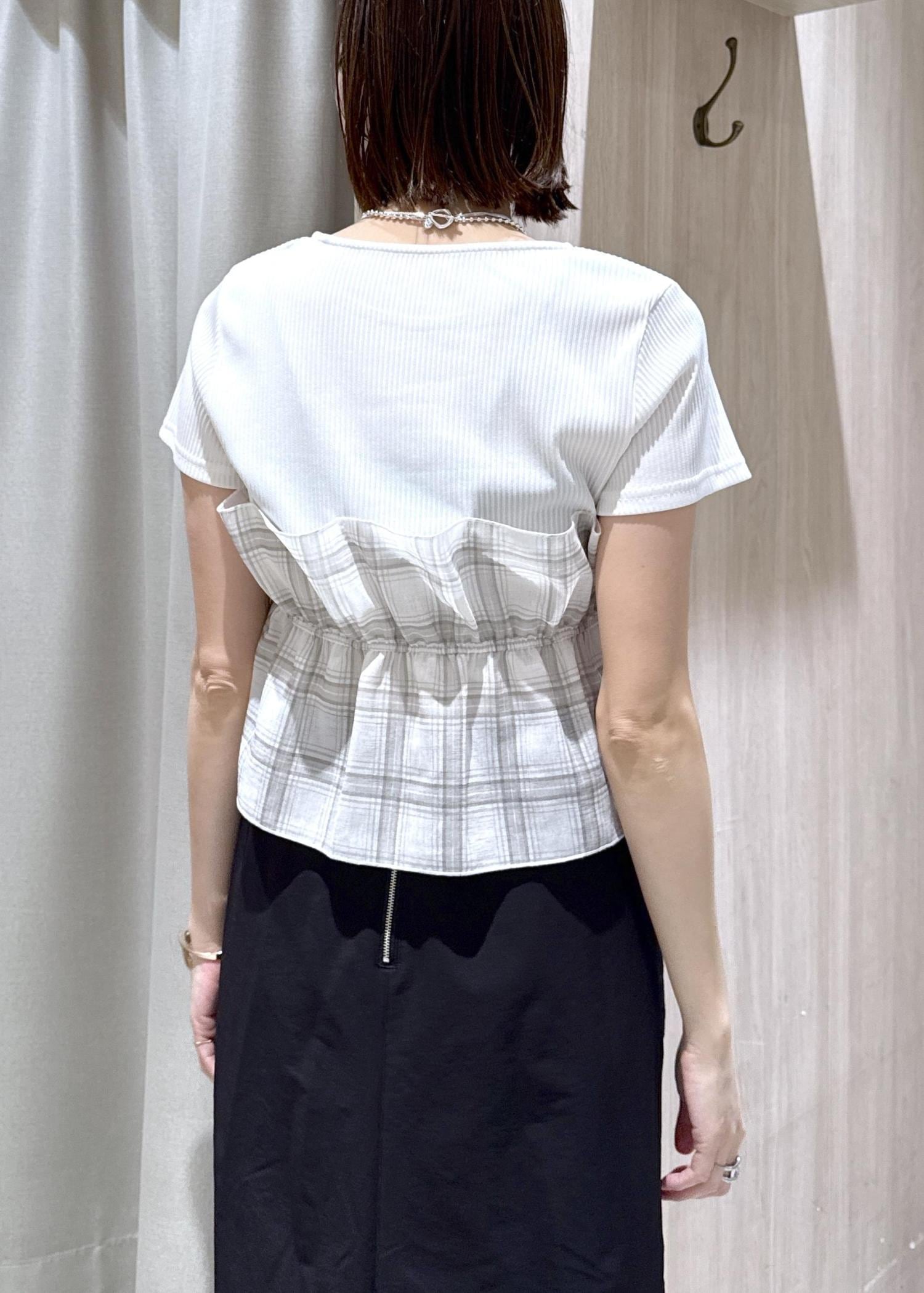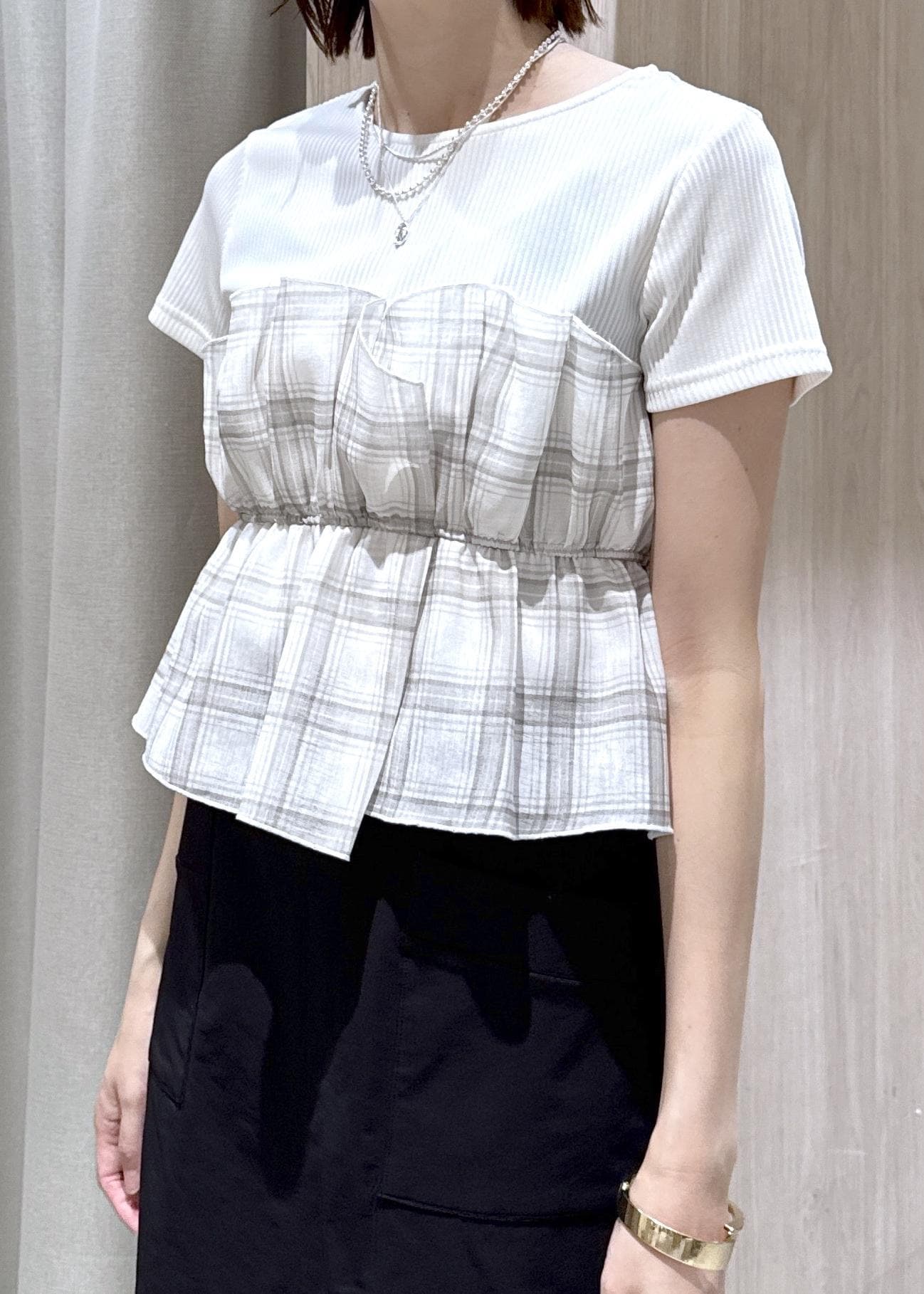 サラッとしたカットソー素材にシアー素材のビスチェがドッキングしてあるのでこれ一枚で着映えるトップスです!