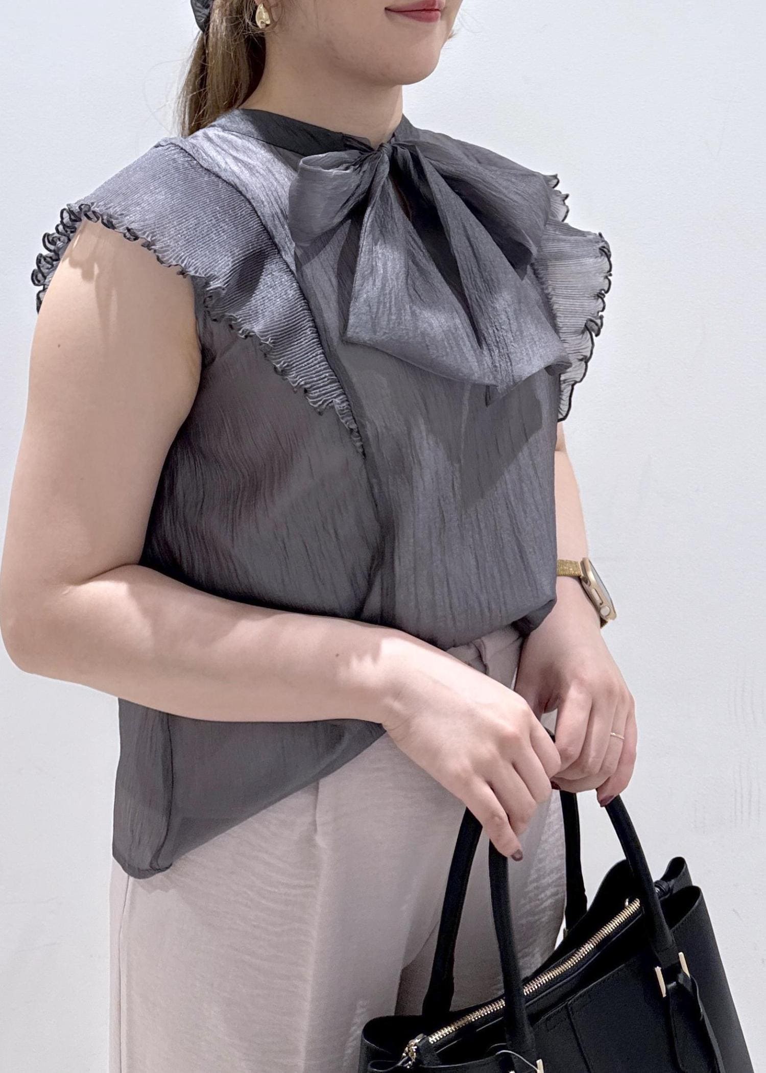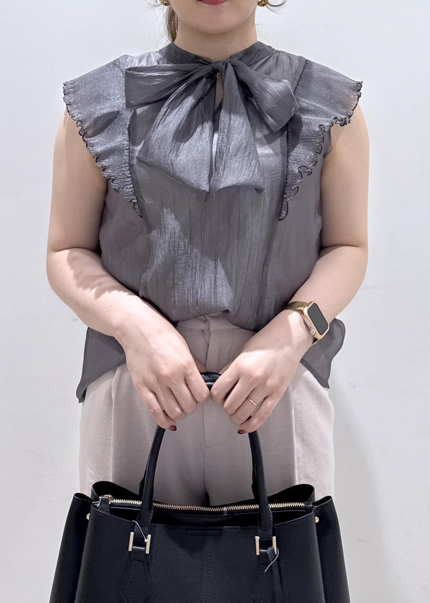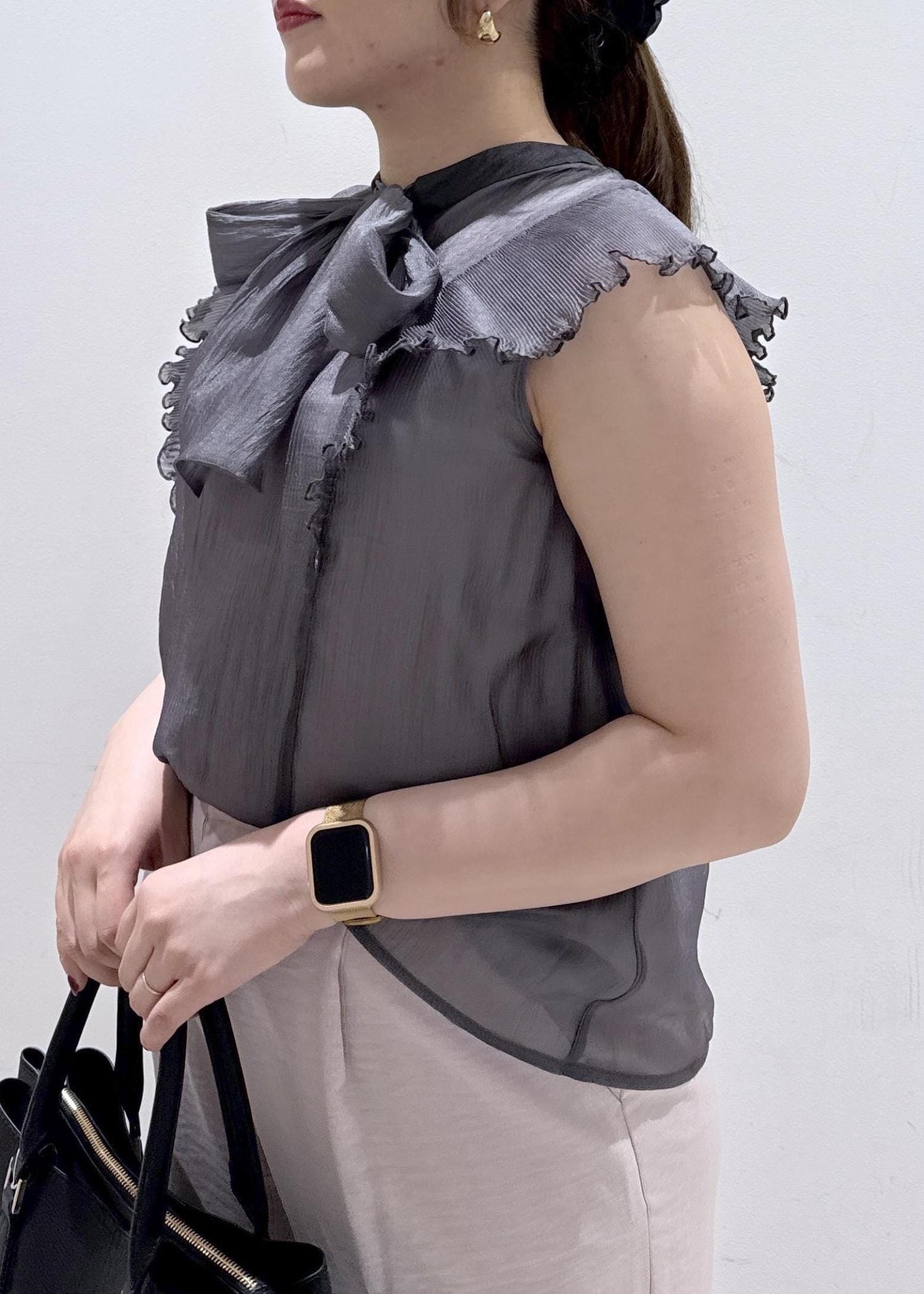 VISプリーツフリルシアーボウタイブラウス/2WAY・イージーケアチャコール / F¥5,929レビュー前後2wayのボウタイブラウス⭐︎お袖がプリーツのデザインで程よく二の腕をカバーしてくれます。身長157cmで腰丈ぐらいの長さなのでインしてもしなくてもどちらでも使えます。裏地付きなので透け感はないので安心して着れますよ♪