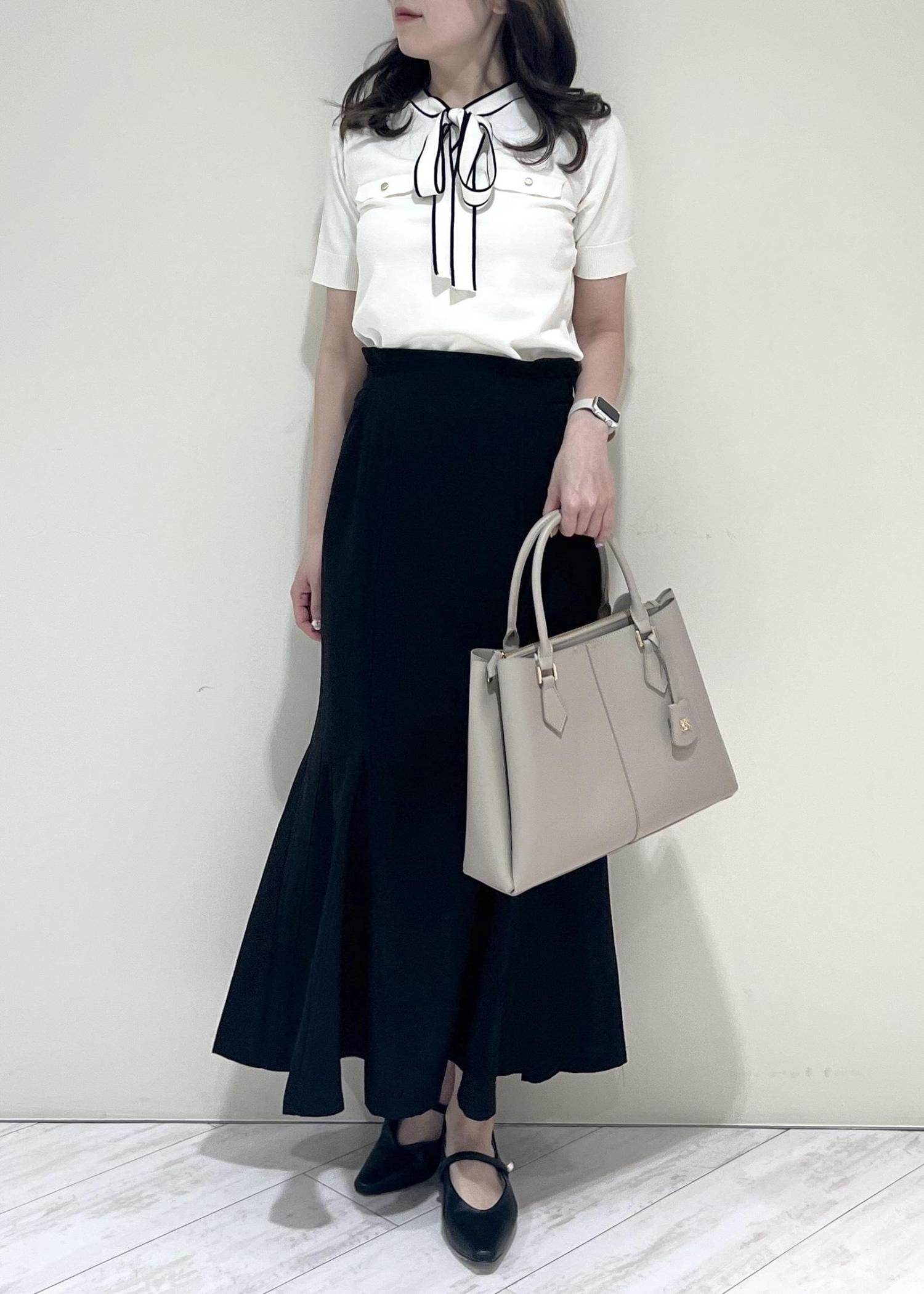 VISリボン付き半袖ニットプルオーバー/イージーケアキナリ系 / F¥5,489レビュー程よくゆとりのあるサイズ感です!着丈は腰にかかるくらいで、長すぎず短すぎず◎どんなボトムにも合わせやすい着丈でした。