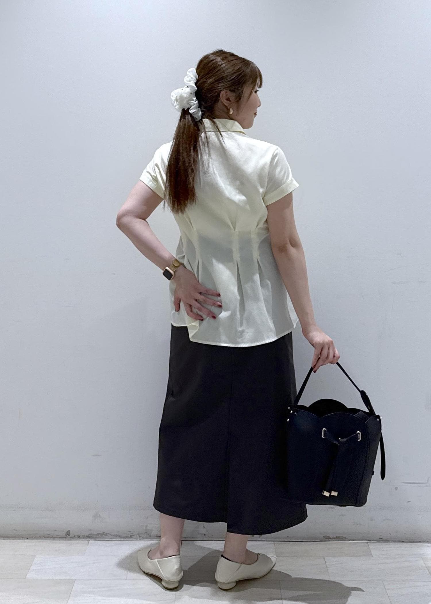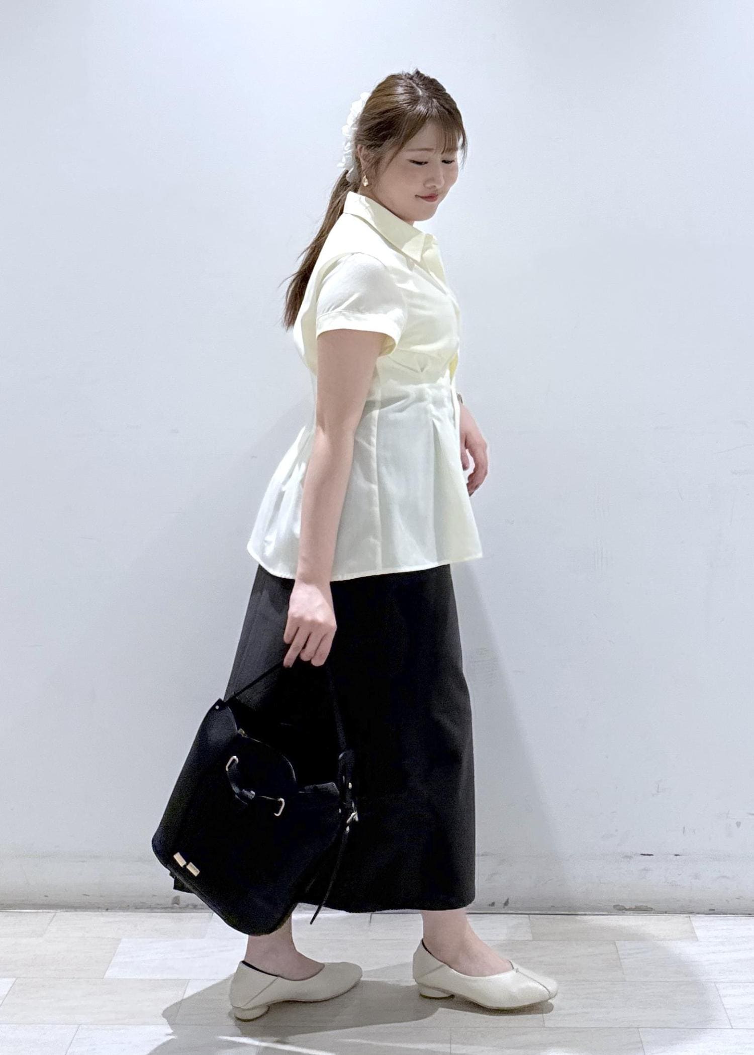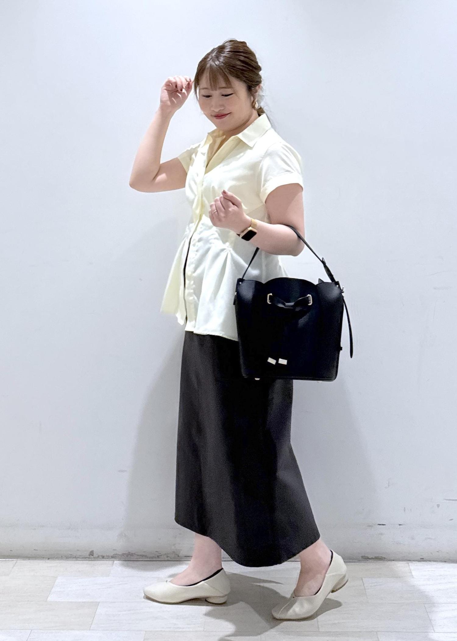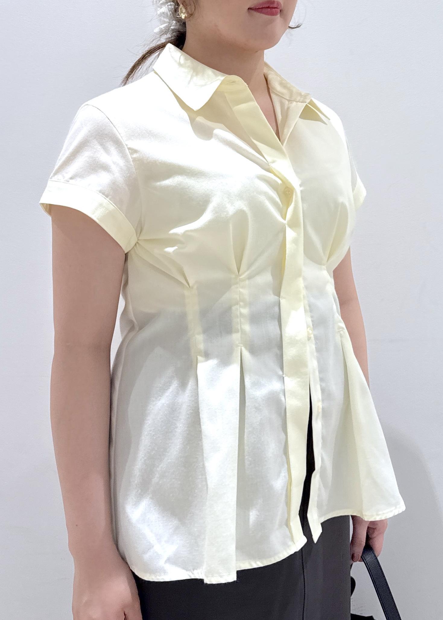 今回は新作で入荷しました、色味が綺麗なペプラムシャツにチャコールグレーのIラインスカートと合わせて綺麗めカジュアルなコーディネートにしてみました。ボトムスの色が黒でも良いのですが、黒だと少し色合いが強くなってしまうのでチャコールグレーと合わせることで黄色の色が引き立ち緩和されるのでオススメなコーデです!今の時期からこれからの夏まで長く着れますよ♪