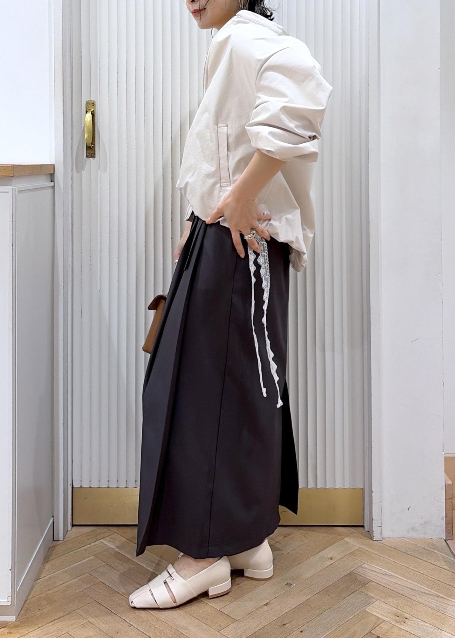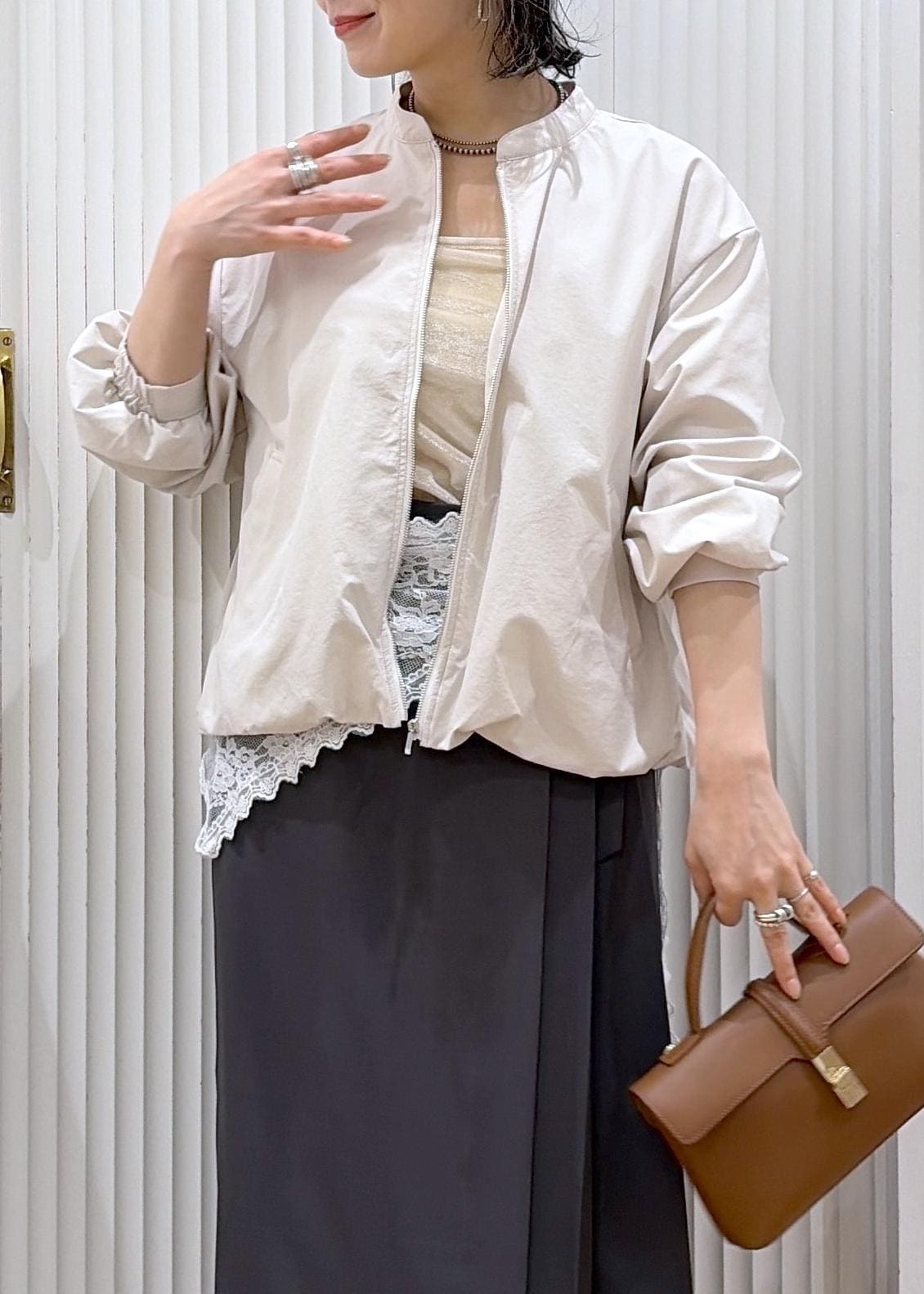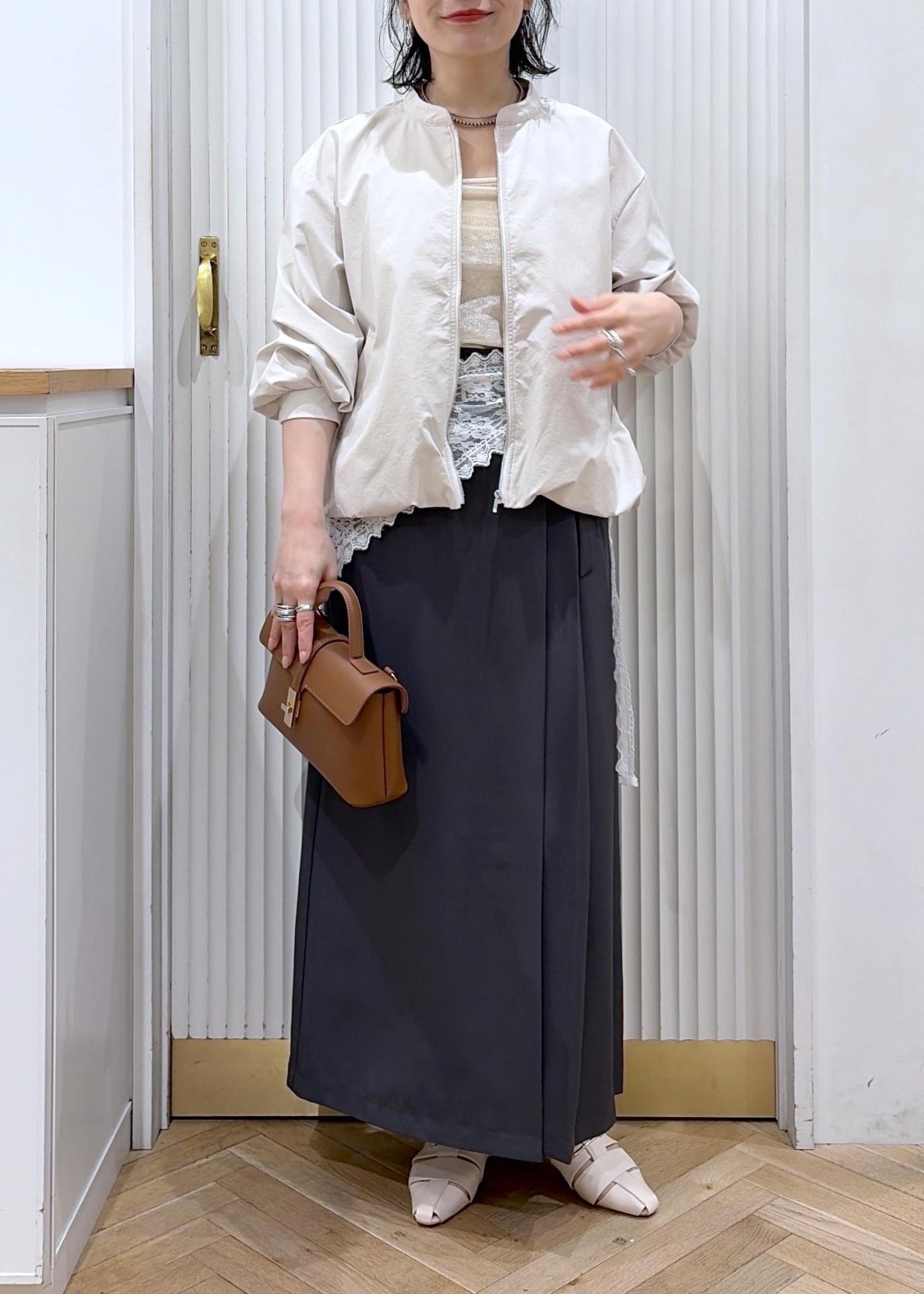 やわらかなベージュのブルゾンに、繊細なレースを覗かせた奥行きのあるバランス。ダークトーンのスカートで全体を引き締めつつ、足元は明るく抜け感をプラス。コンパクトなバッグで品よくまとめた、抜きすぎない洗練スタイル。