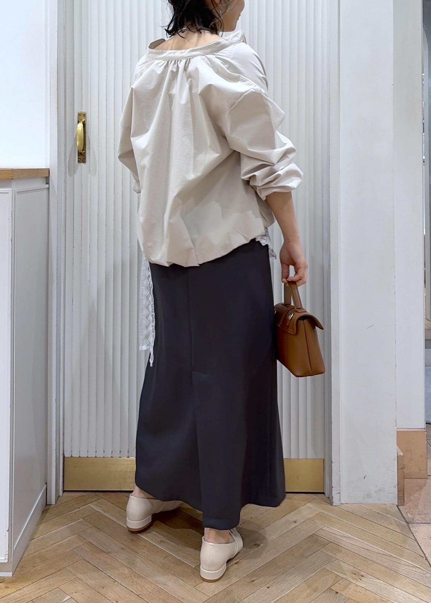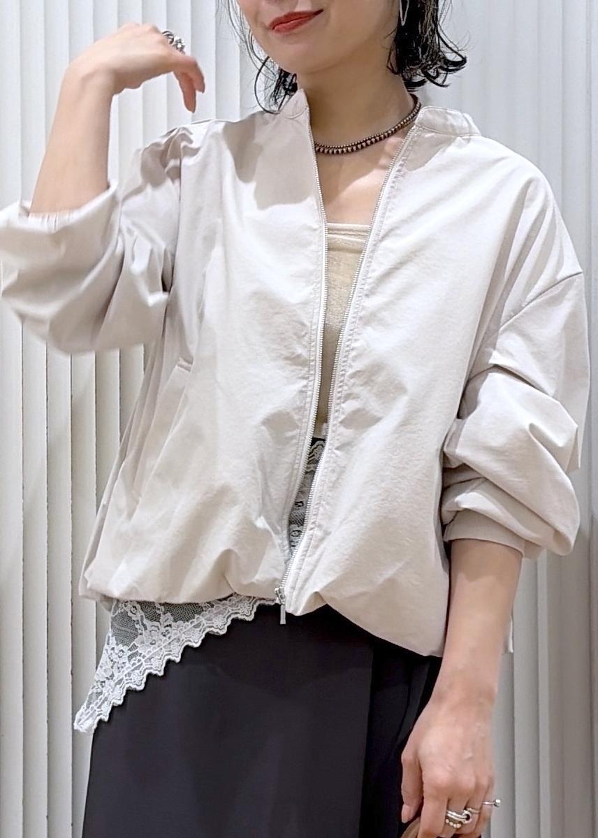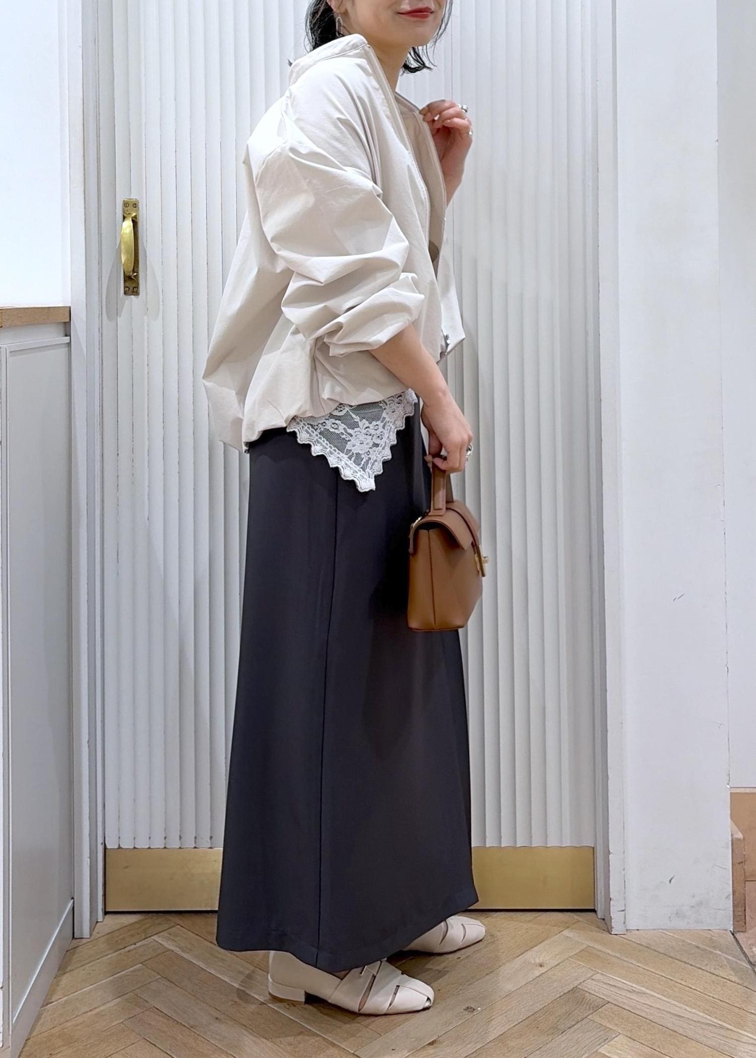 やわらかなベージュのブルゾンに、繊細なレースを覗かせた奥行きのあるバランス。ダークトーンのスカートで全体を引き締めつつ、足元は明るく抜け感をプラス。コンパクトなバッグで品よくまとめた、抜きすぎない洗練スタイル。