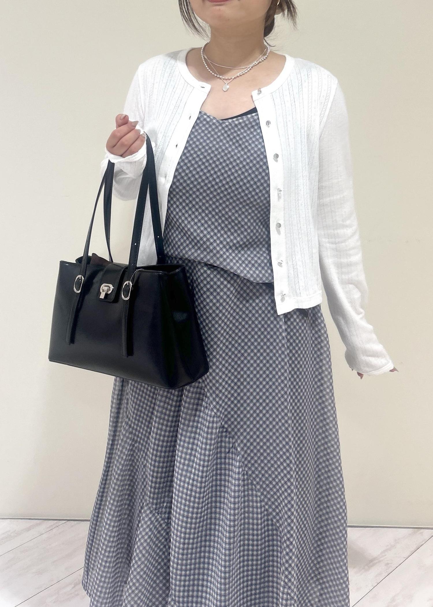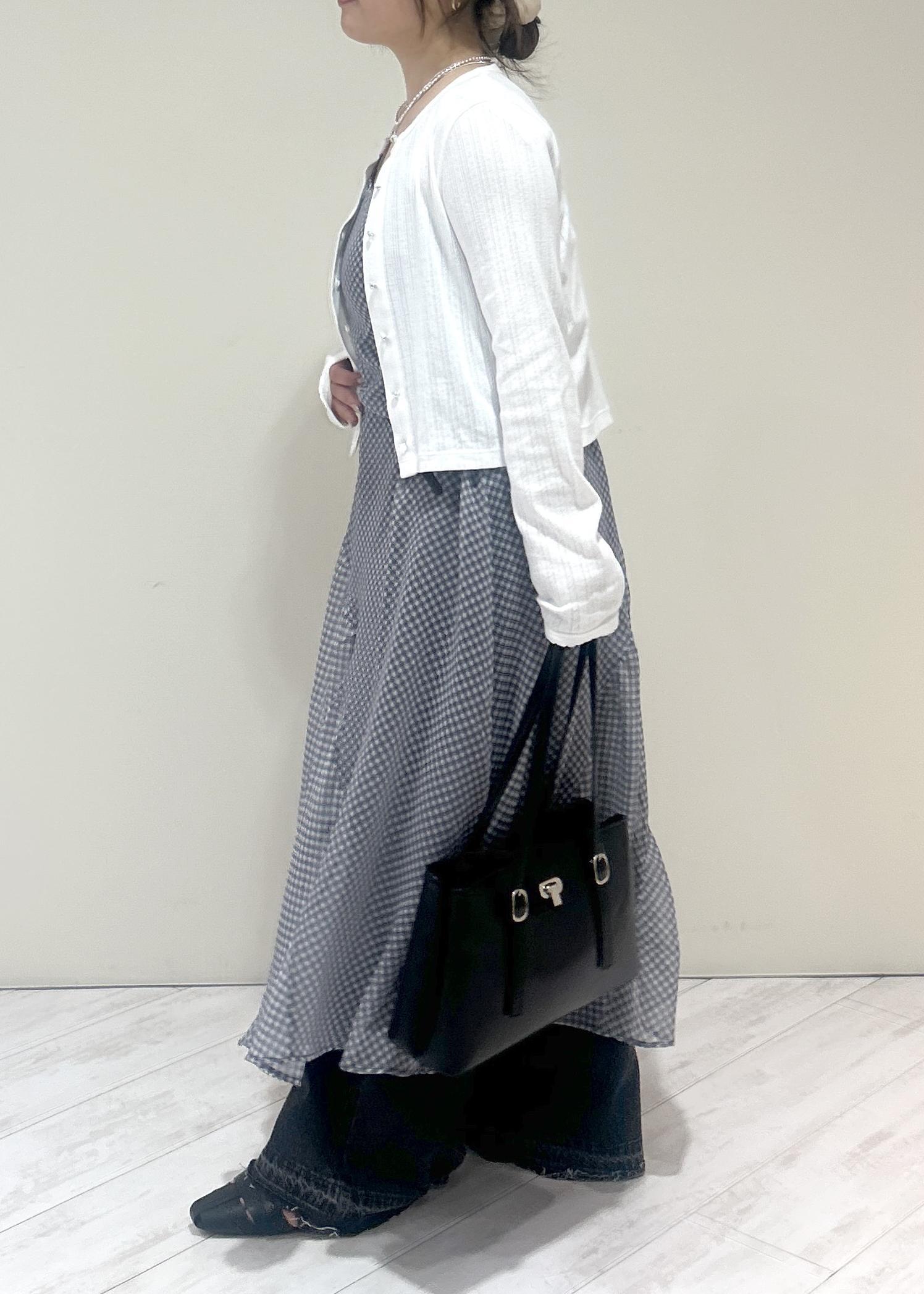 ワンピースは、小さめのチェック柄パターンなのでどんな系統にも馴染みます