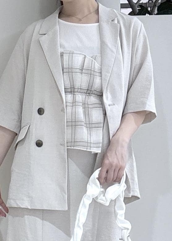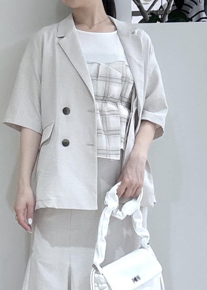 VIS美easyリネンライクハーフスリーブダブルジャケット/イージーケア・接触冷感・セットアップ対応キナリ / S¥7,909レビュー158cmSサイズ着用。ヒップが隠れるくらいの着丈です。袖周りも余裕があるので、半袖に羽織ってももこつき気になりませんでした!