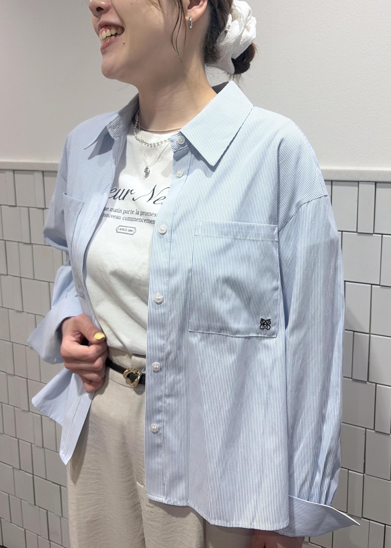写真はインをしてしまっていますが、アウトスタイルでもバランスが綺麗に見える着丈なので、ボトムによって変えていただくのがおすすめです。