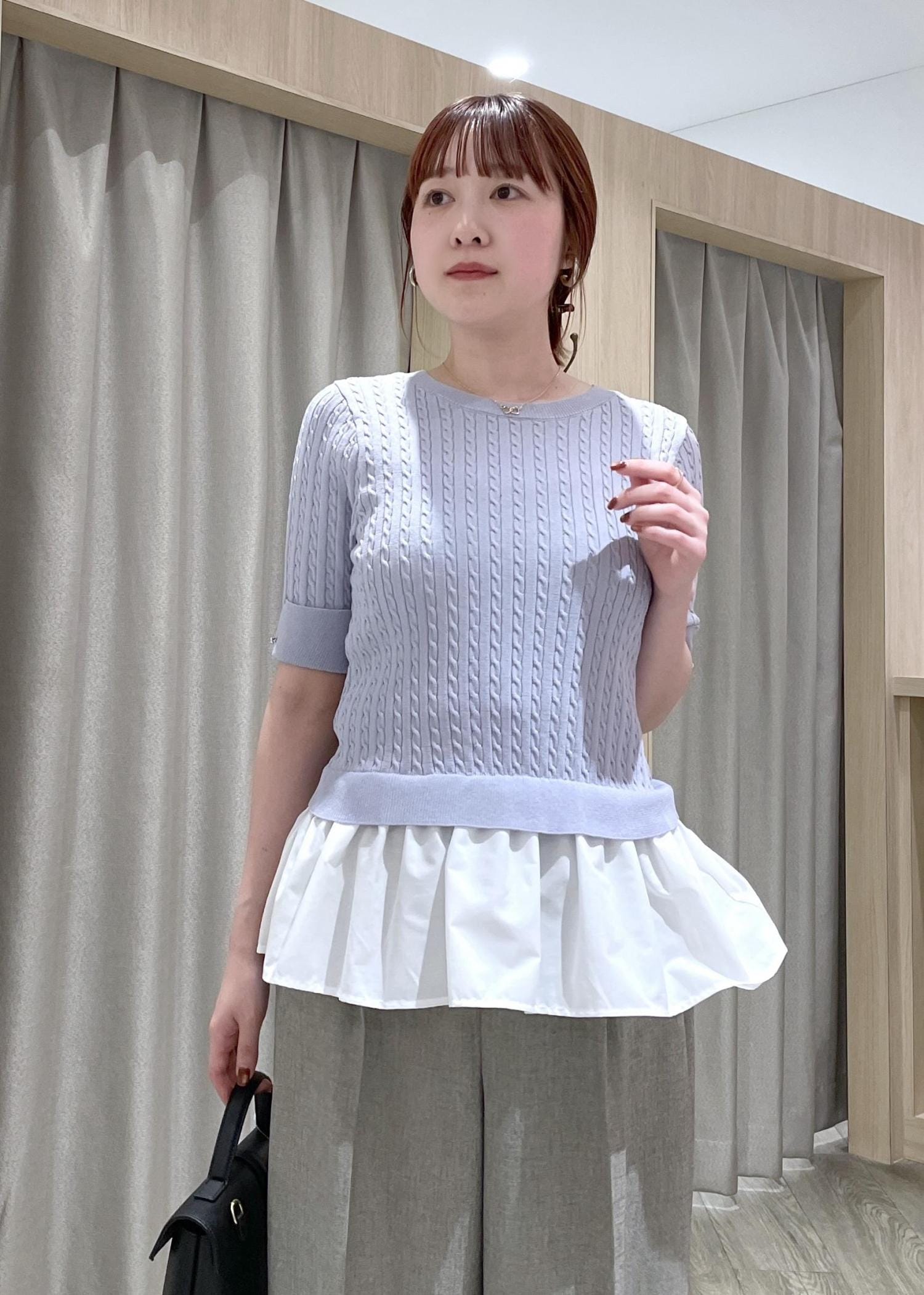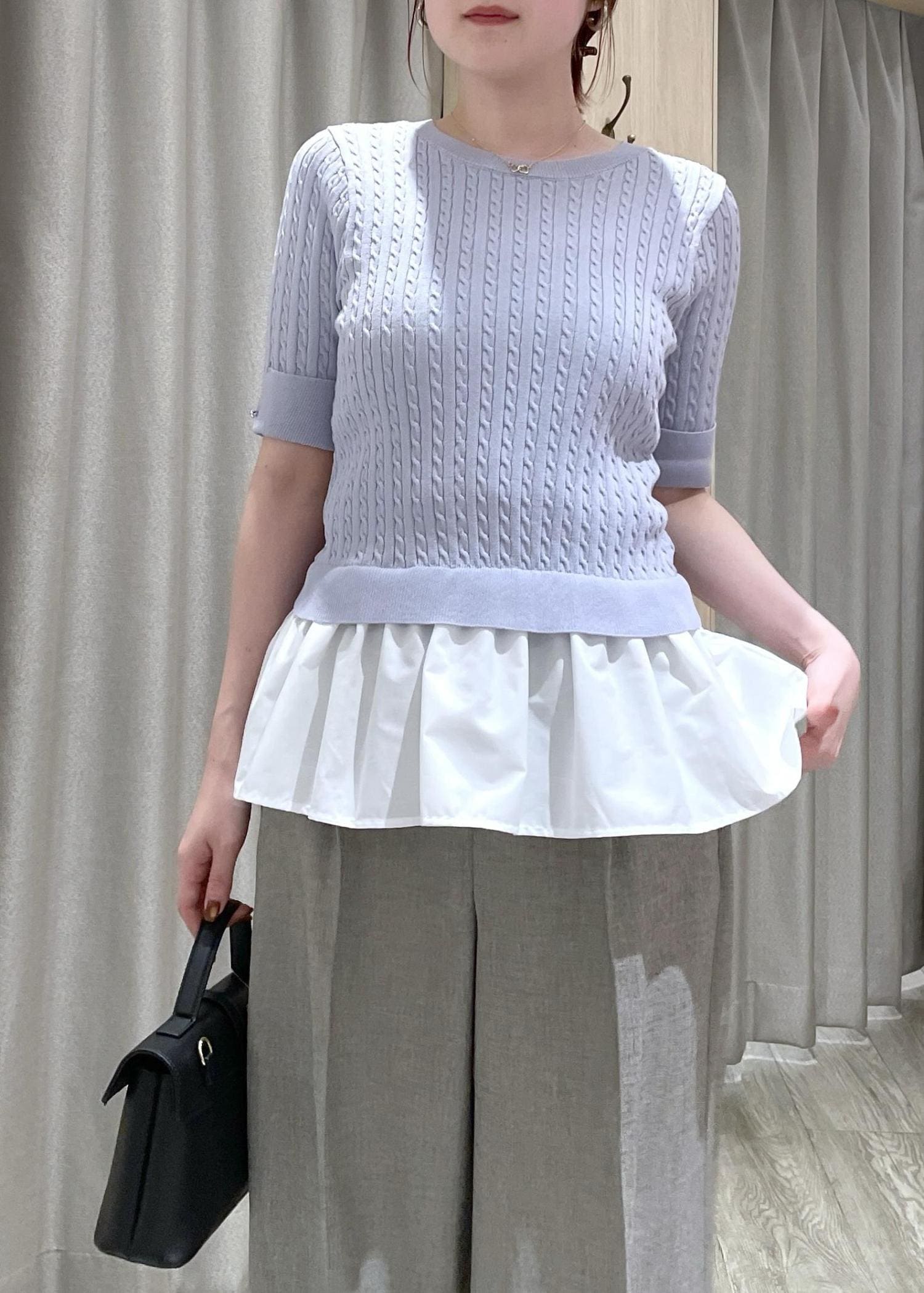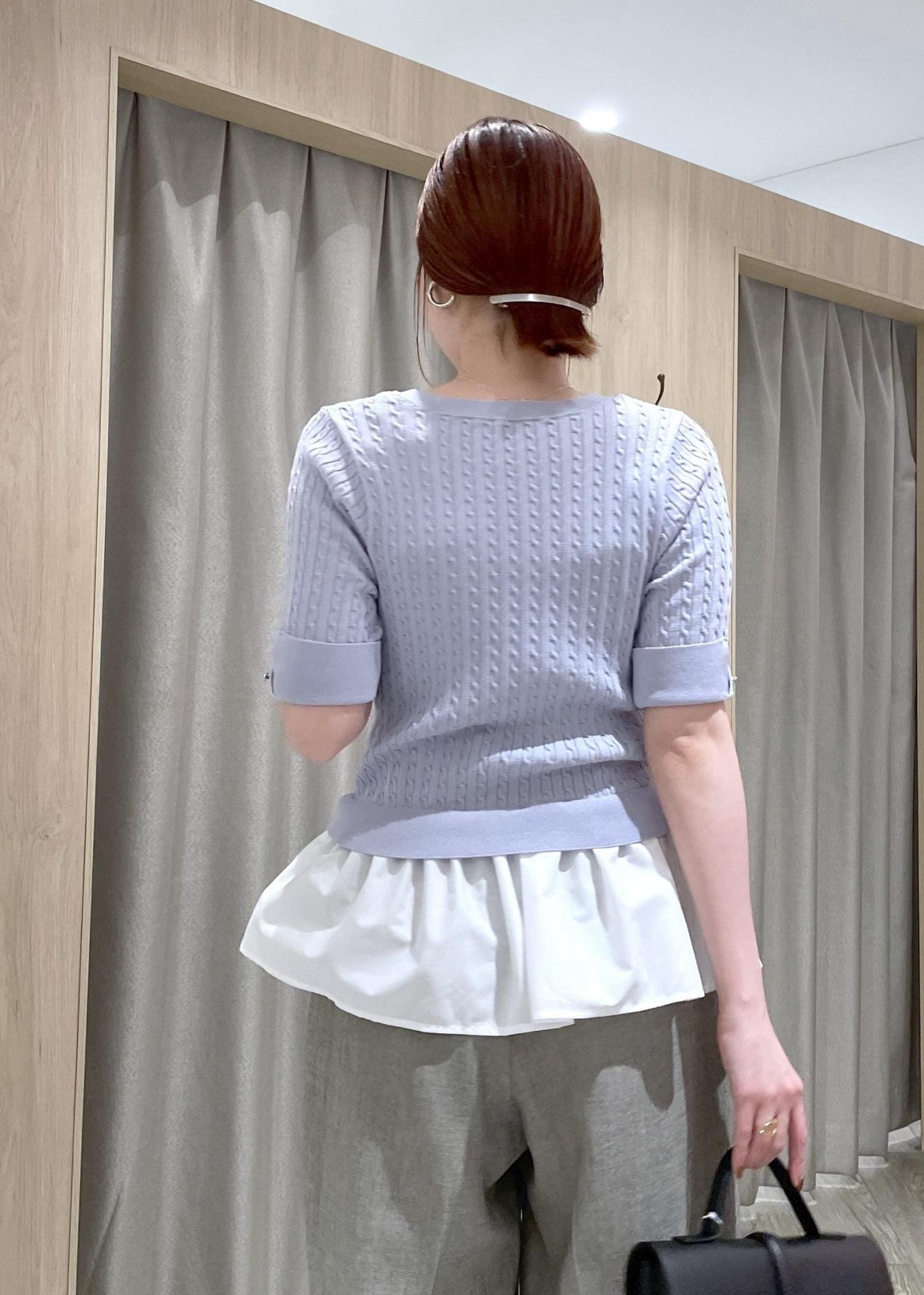 VISレイヤードケーブルハーフスリーブニットサックス / F¥5,929レビュー1枚で着映えが叶うドッキングトップス♡ニット部分はややフィット感がありますが、ボディラインを拾うほどでは無く◎ヒップにかかる着丈で体型カバーも叶います。