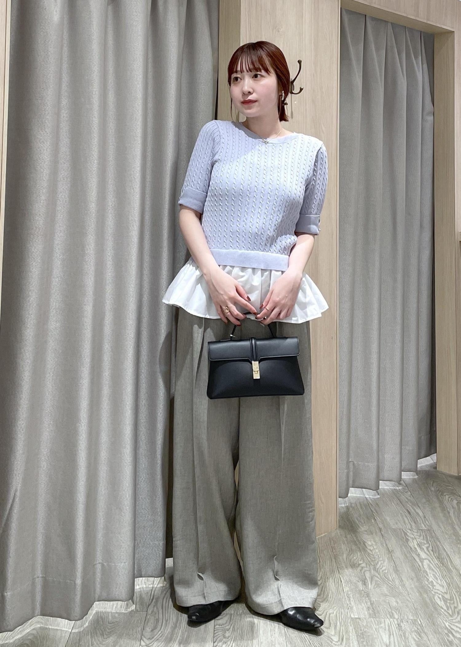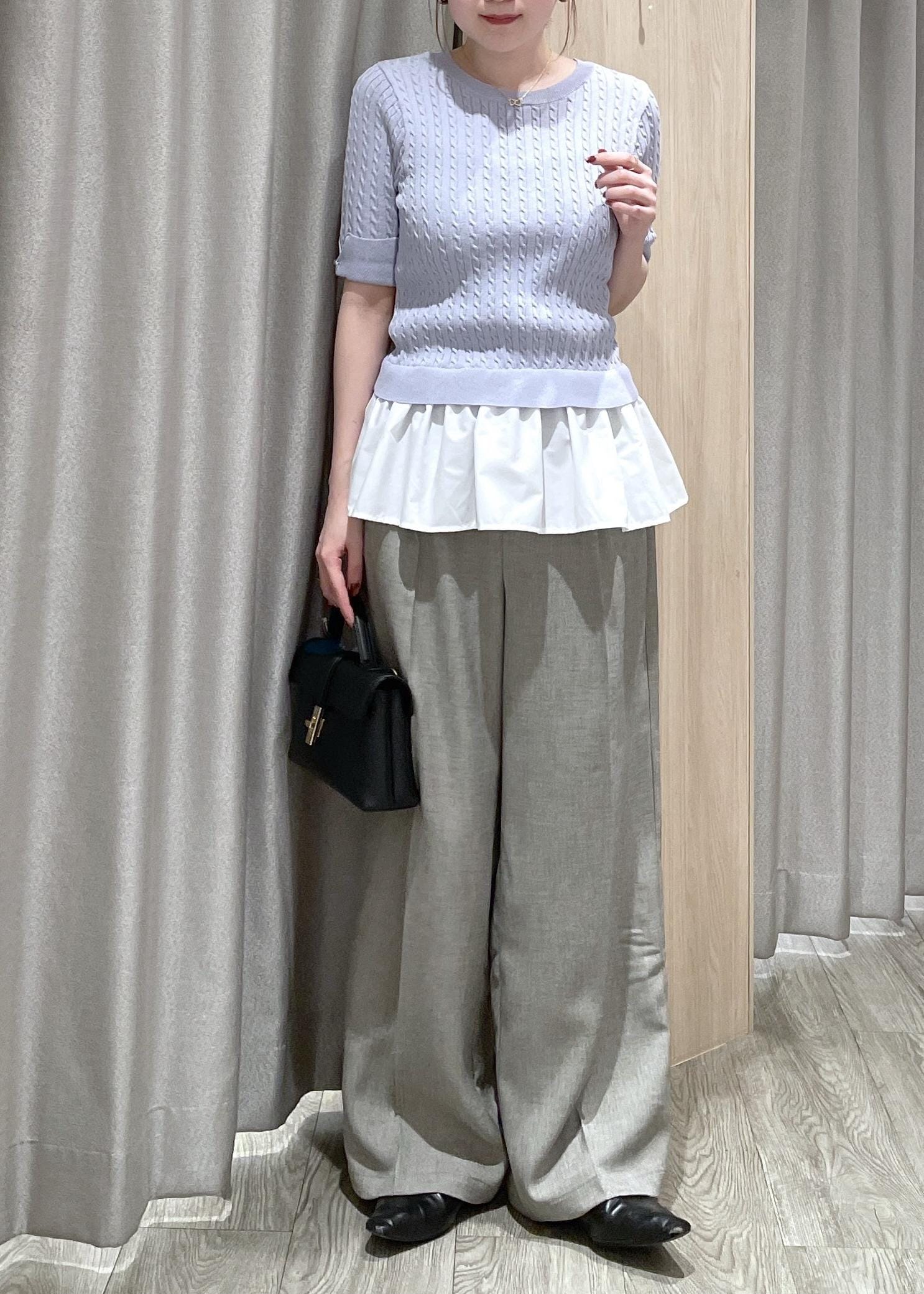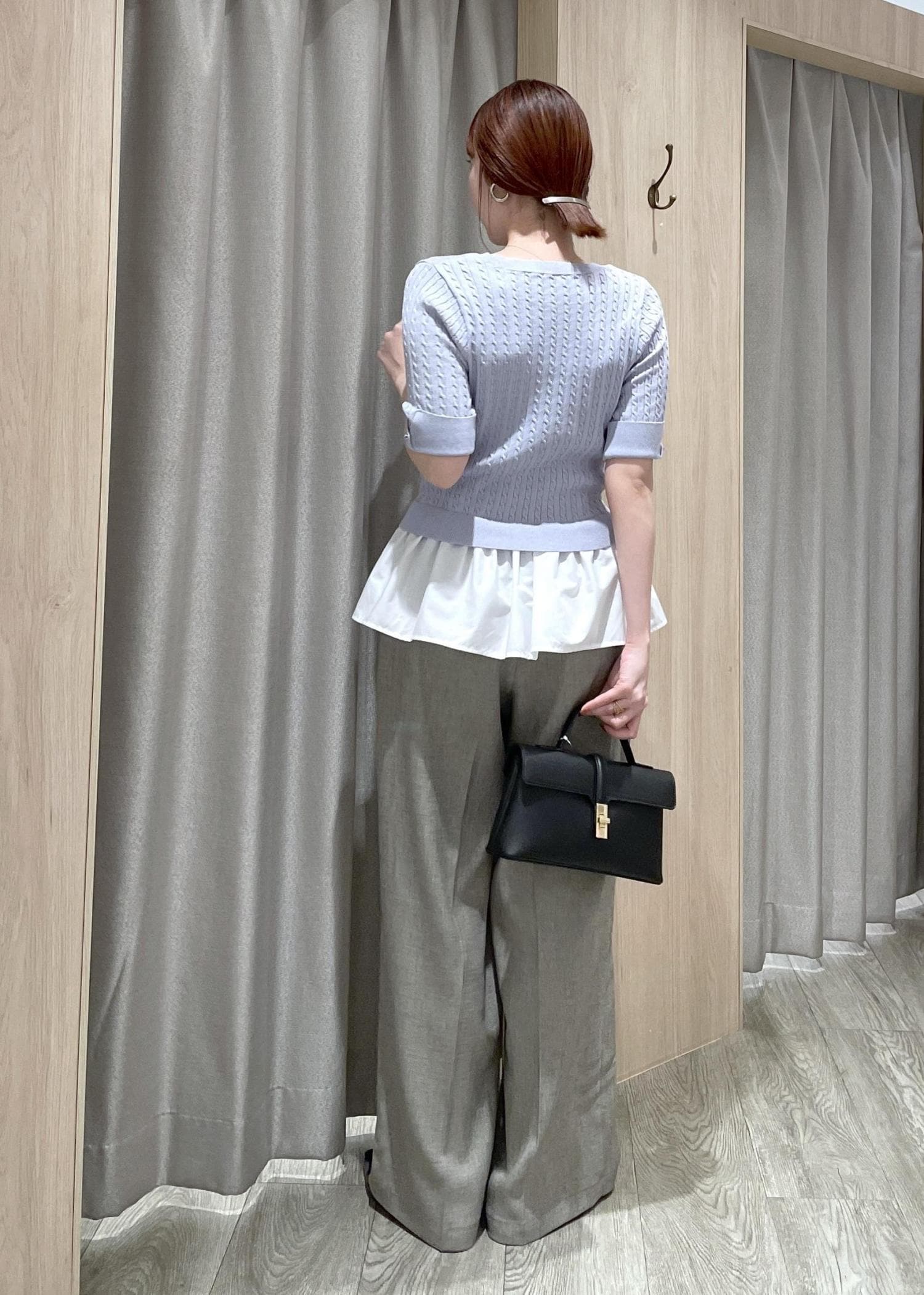 VISレイヤードケーブルハーフスリーブニットサックス / F¥5,929レビュー1枚で着映えが叶うドッキングトップス♡ニット部分はややフィット感がありますが、ボディラインを拾うほどでは無く◎ヒップにかかる着丈で体型カバーも叶います。