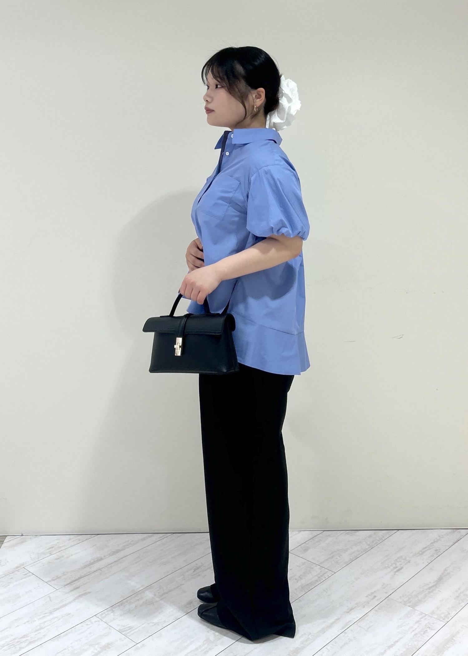 シャツ×パンツ といったシンプルな組み合わせですが、大ぶりなシュシュを取り入れて少し甘さもプラスしました♡