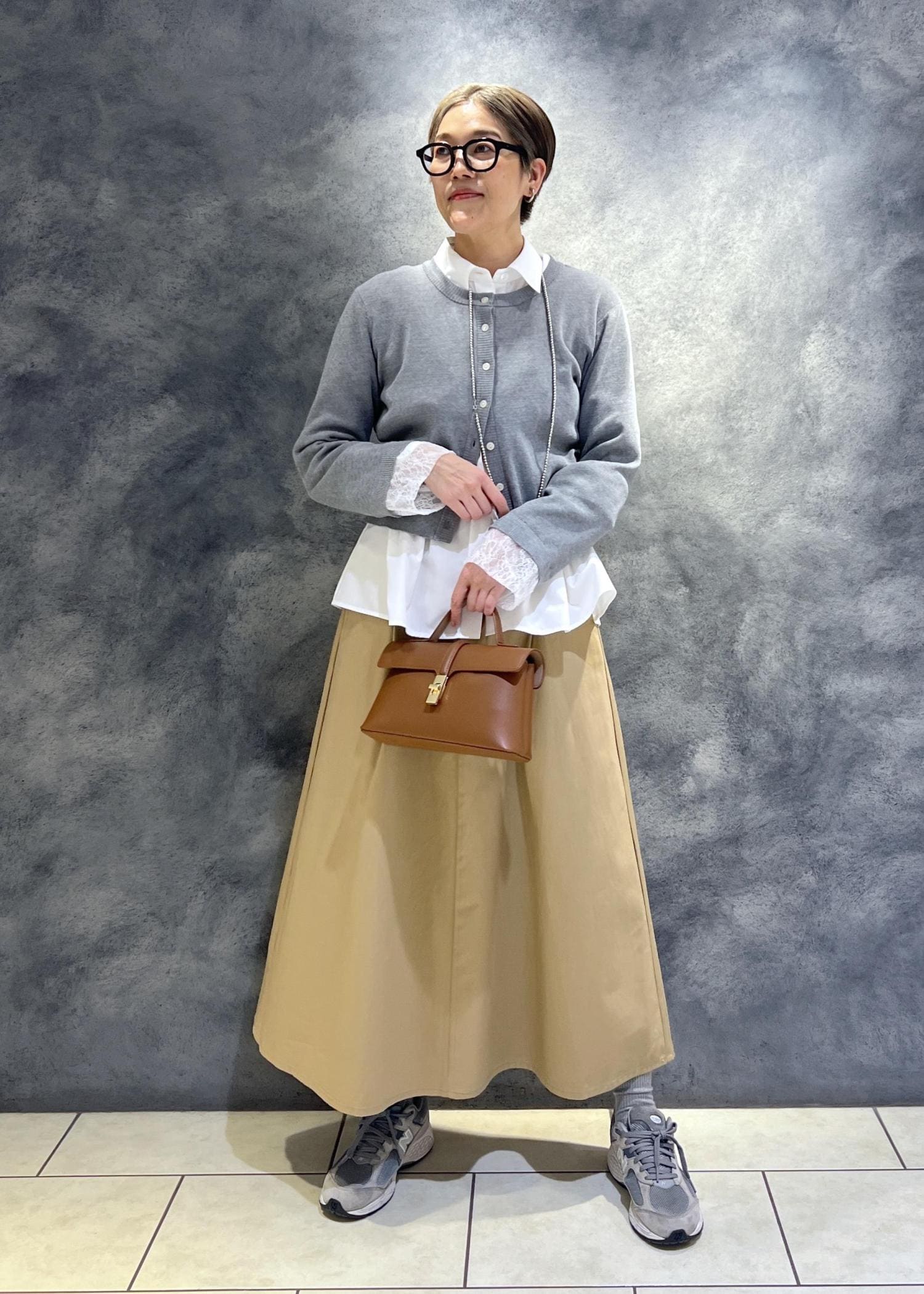 春なので清潔感のあるシャツのレイヤードスタイリングとコーディネートしましたが気分はスニーカー。
