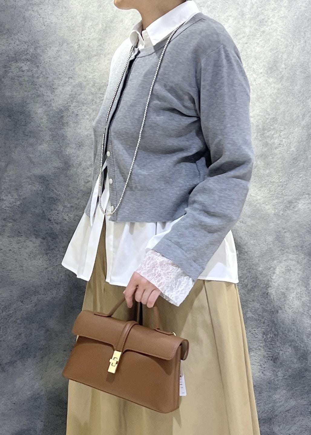 定番グレーですがよく見るとニット素材は細かいラメが入っており、