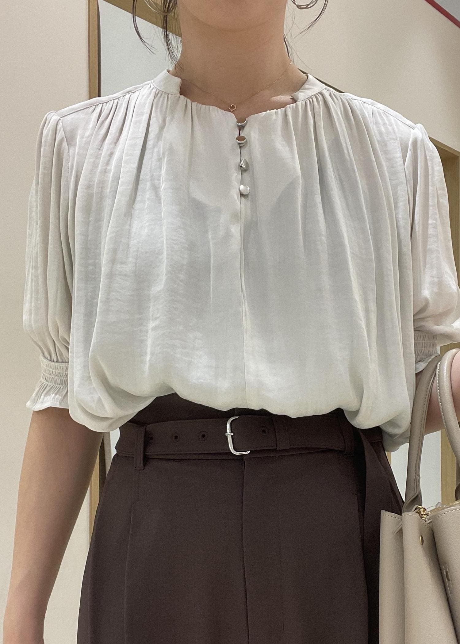 VISエアリーサテンハーフスリーブブラウス/イージーケアキナリ / F¥5,489レビュー光沢感ある素材でサラッとしています!