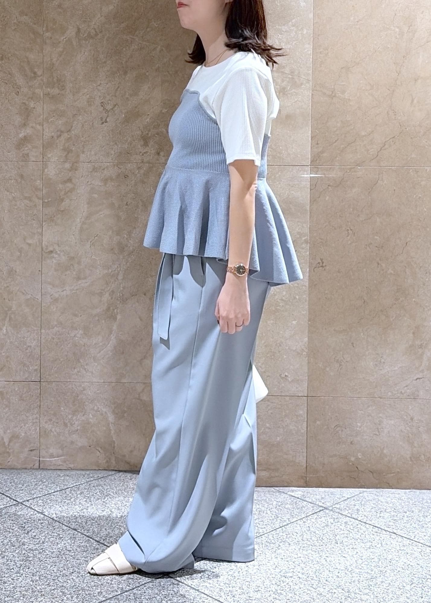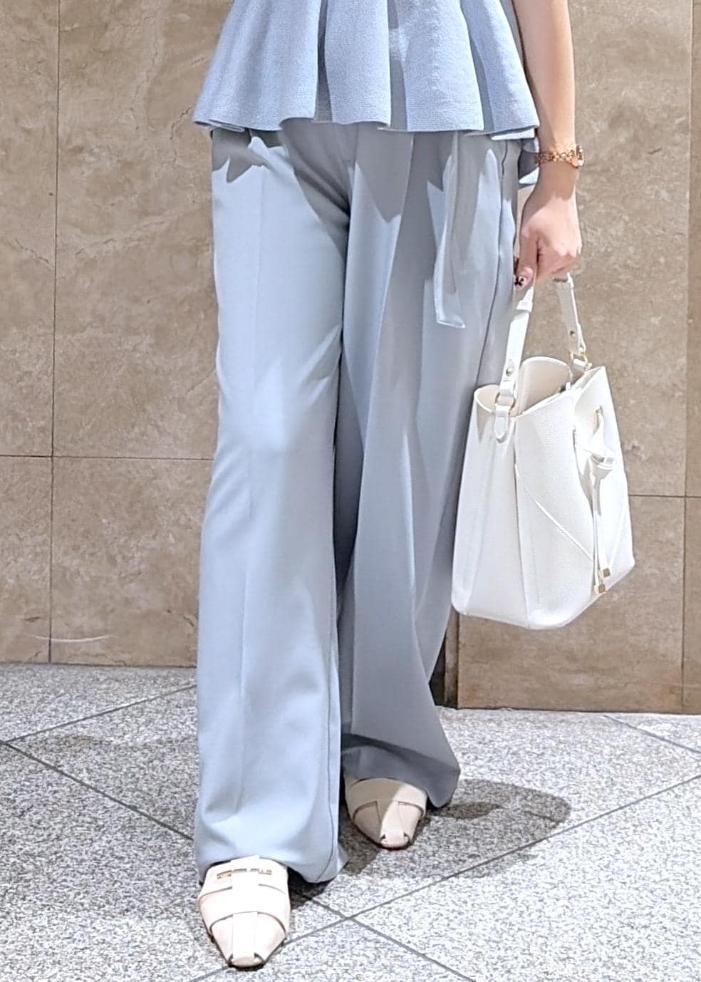 予約VISベルトディティールタックワイドパンツ/イージーケア・接触冷感サックス / S¥6,589レビュー身長149cmでSサイズを着用し、少し地面に着くぐらいの丈感でした。低身長さんだとヒールを履くのがオススメです◎