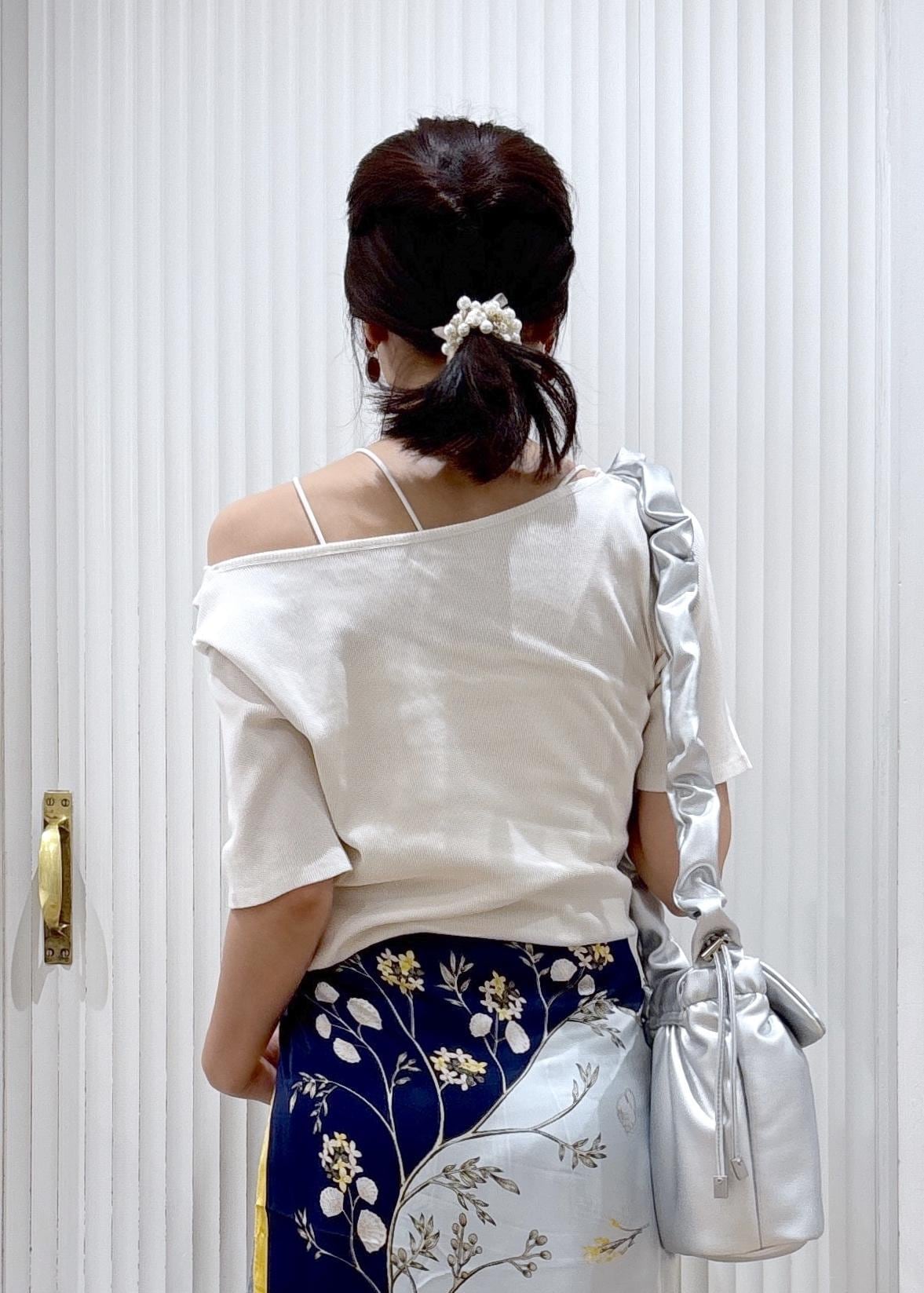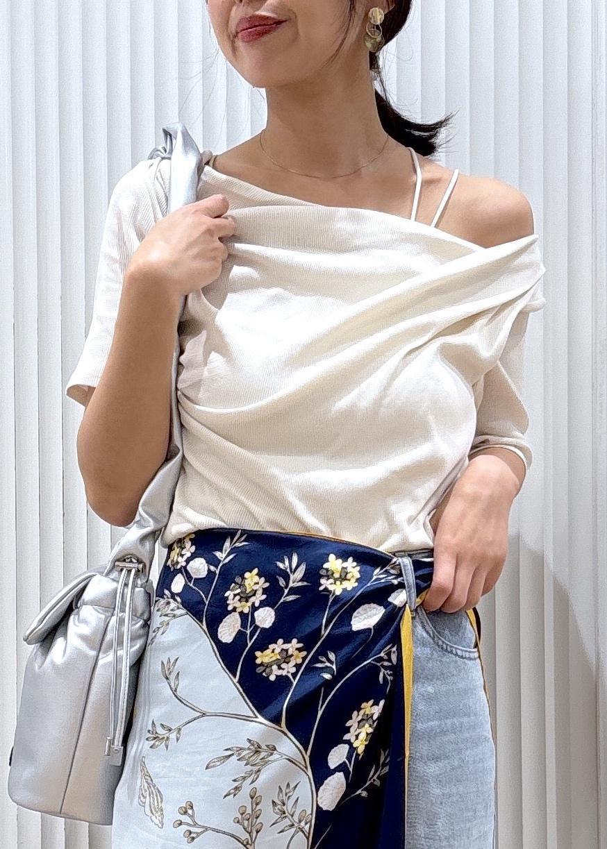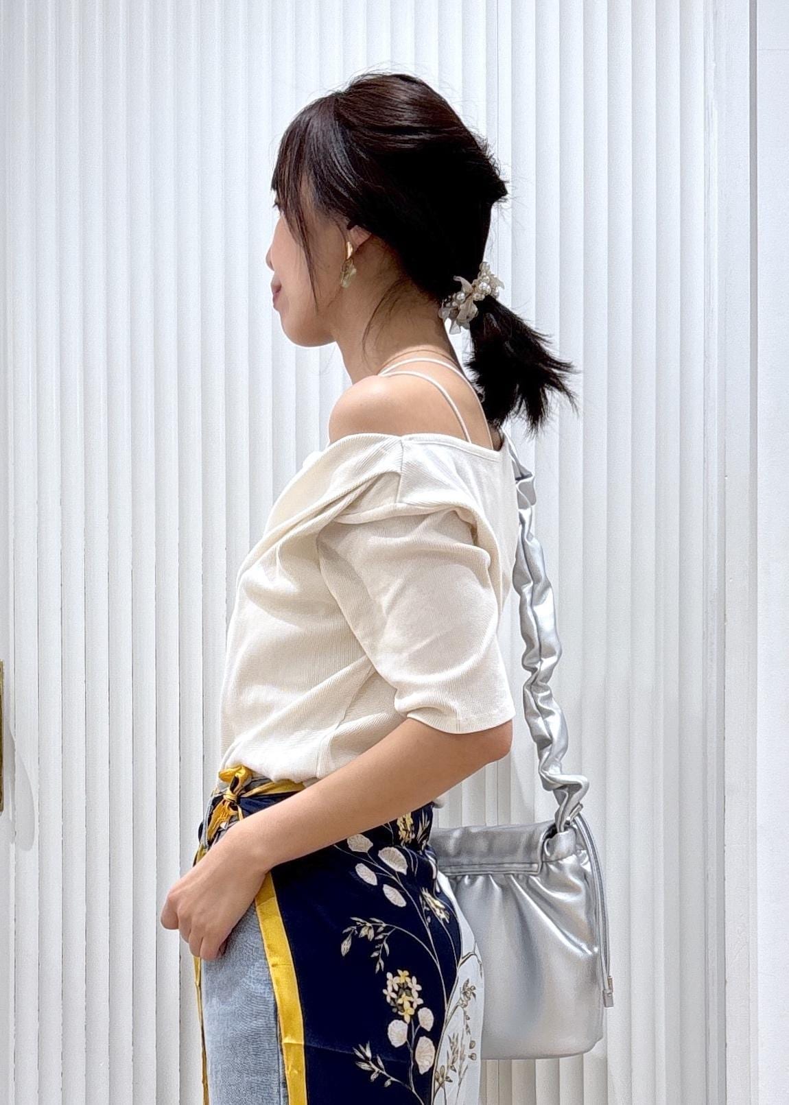肩周りですが片側を落としてワンショルにしたり、もちろんそのまま落とさずにドレープとして着ても綺麗なシルエットなので色々な着方を楽しめます。 -