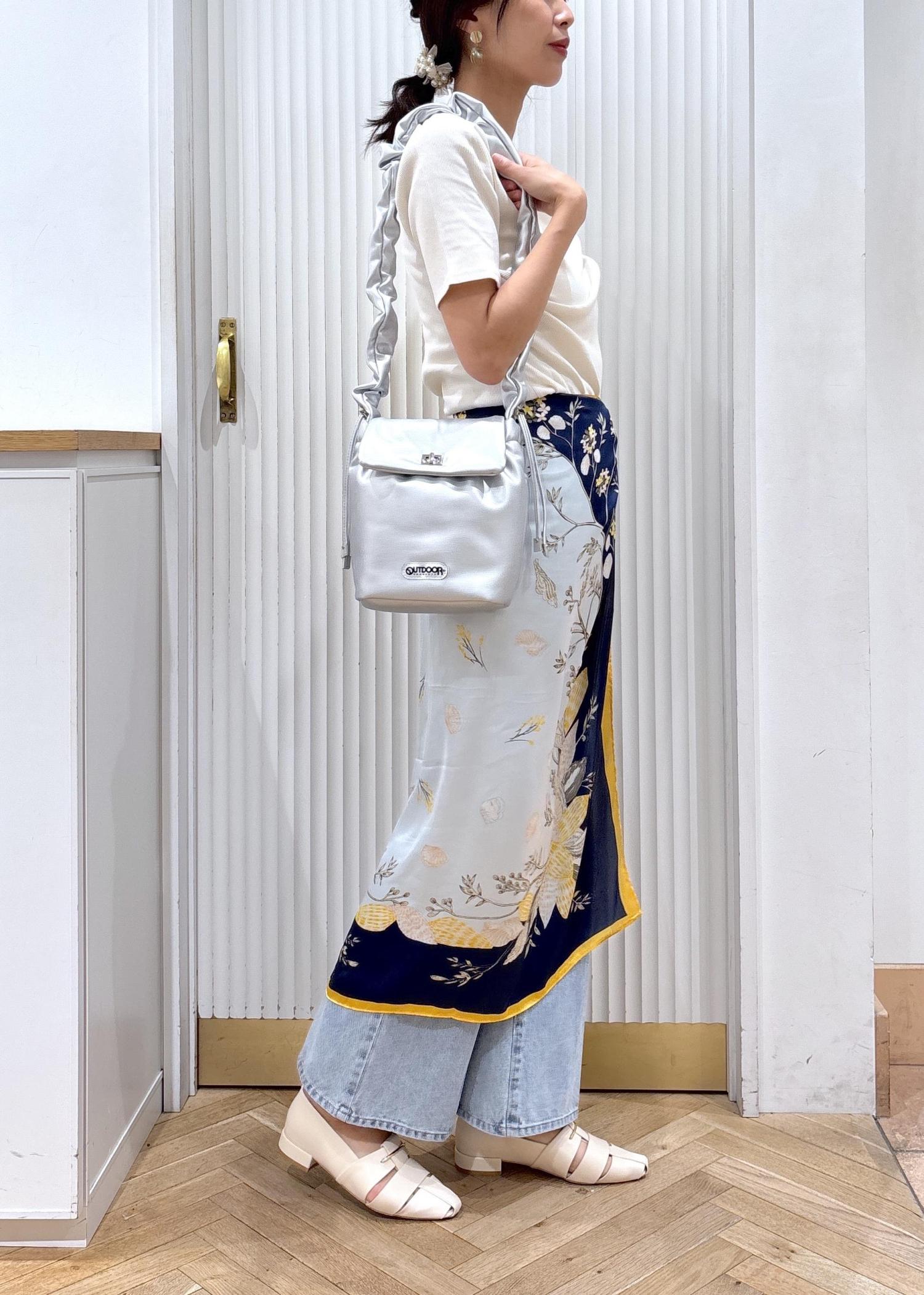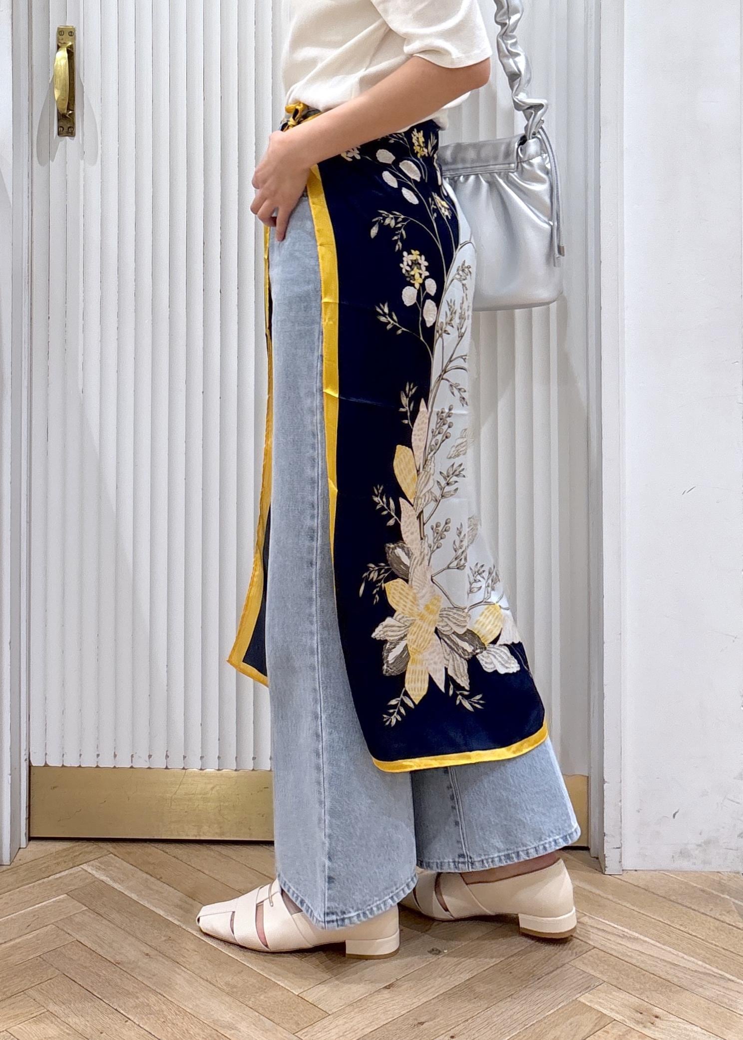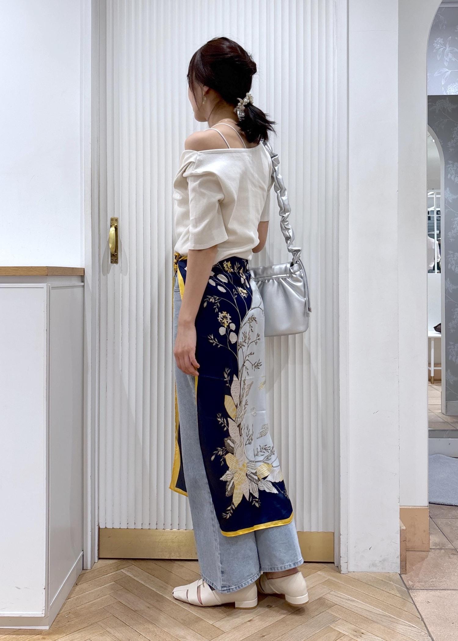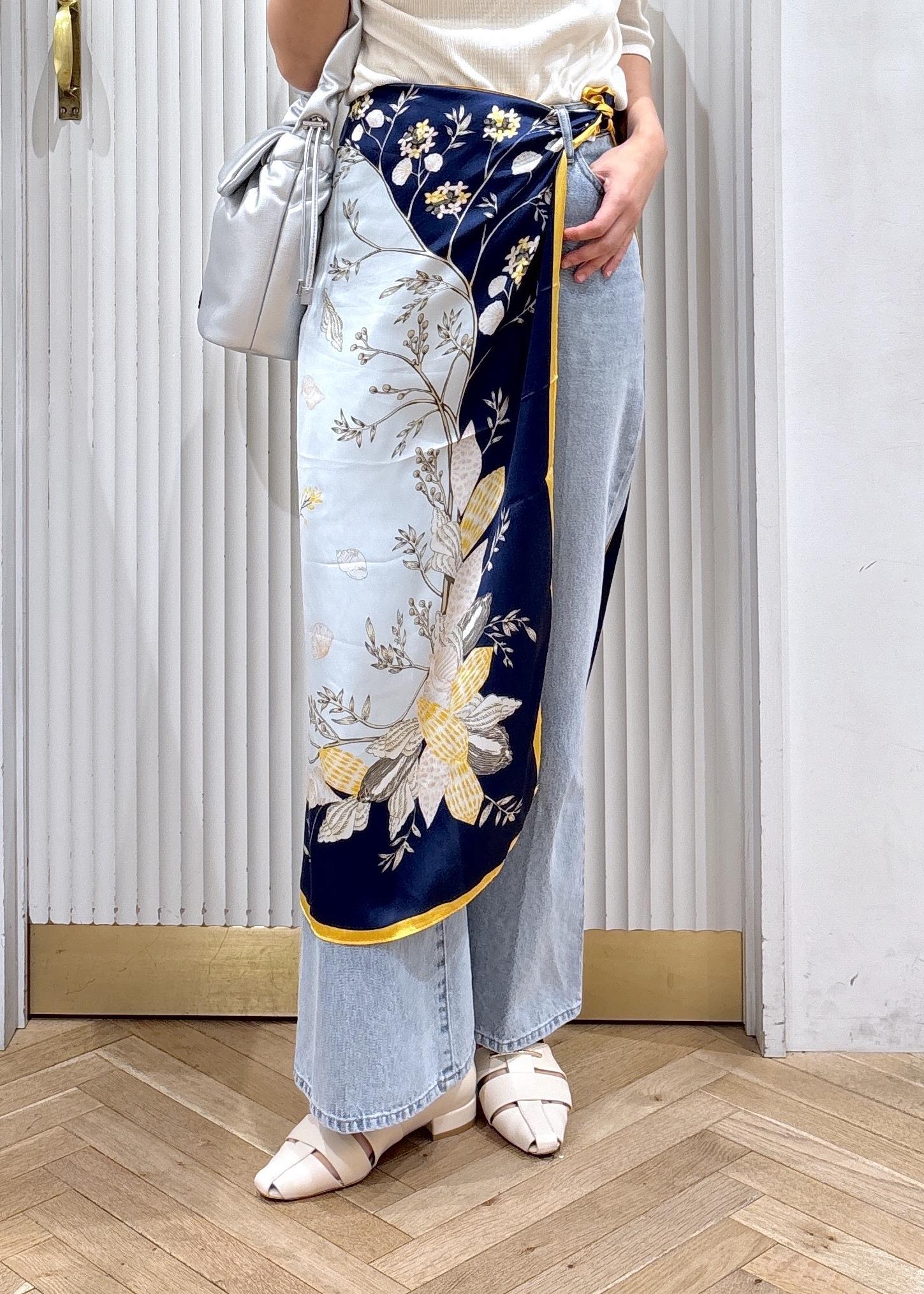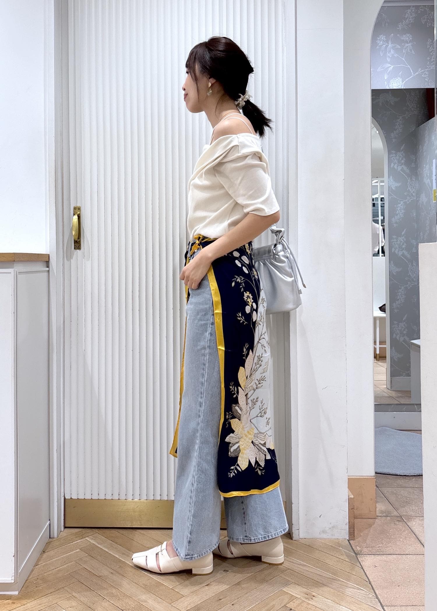 オフショル風のやわらかトップスに、デニムのラフさをプラスしつつ、華やかなスカーフを主役にしたコーデ。シンプルな配色の中にネイビー×ゴールドの柄が映えて、ぐっと上品な印象に。小物も淡いトーンでまとめて、女性らしい抜け感と洗練さを両立しています。
