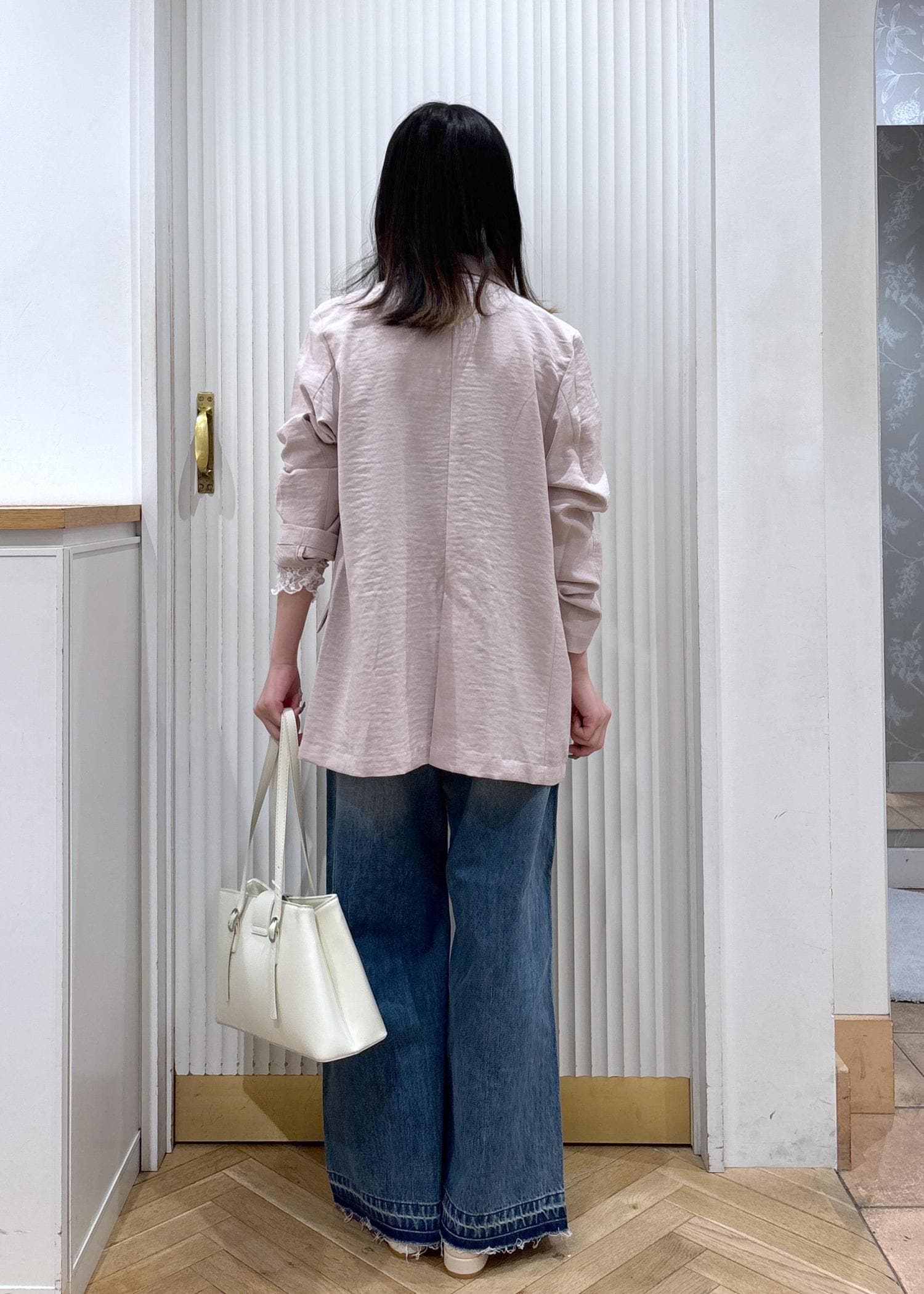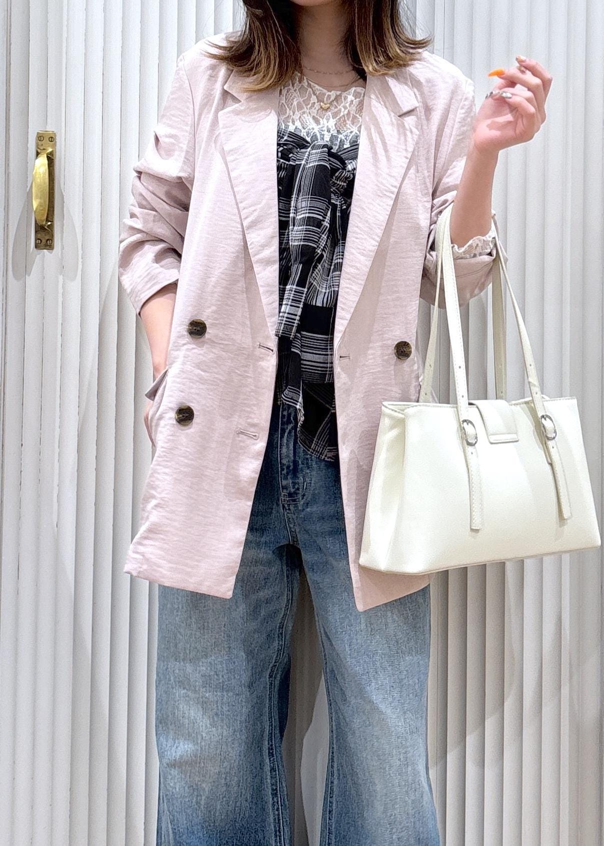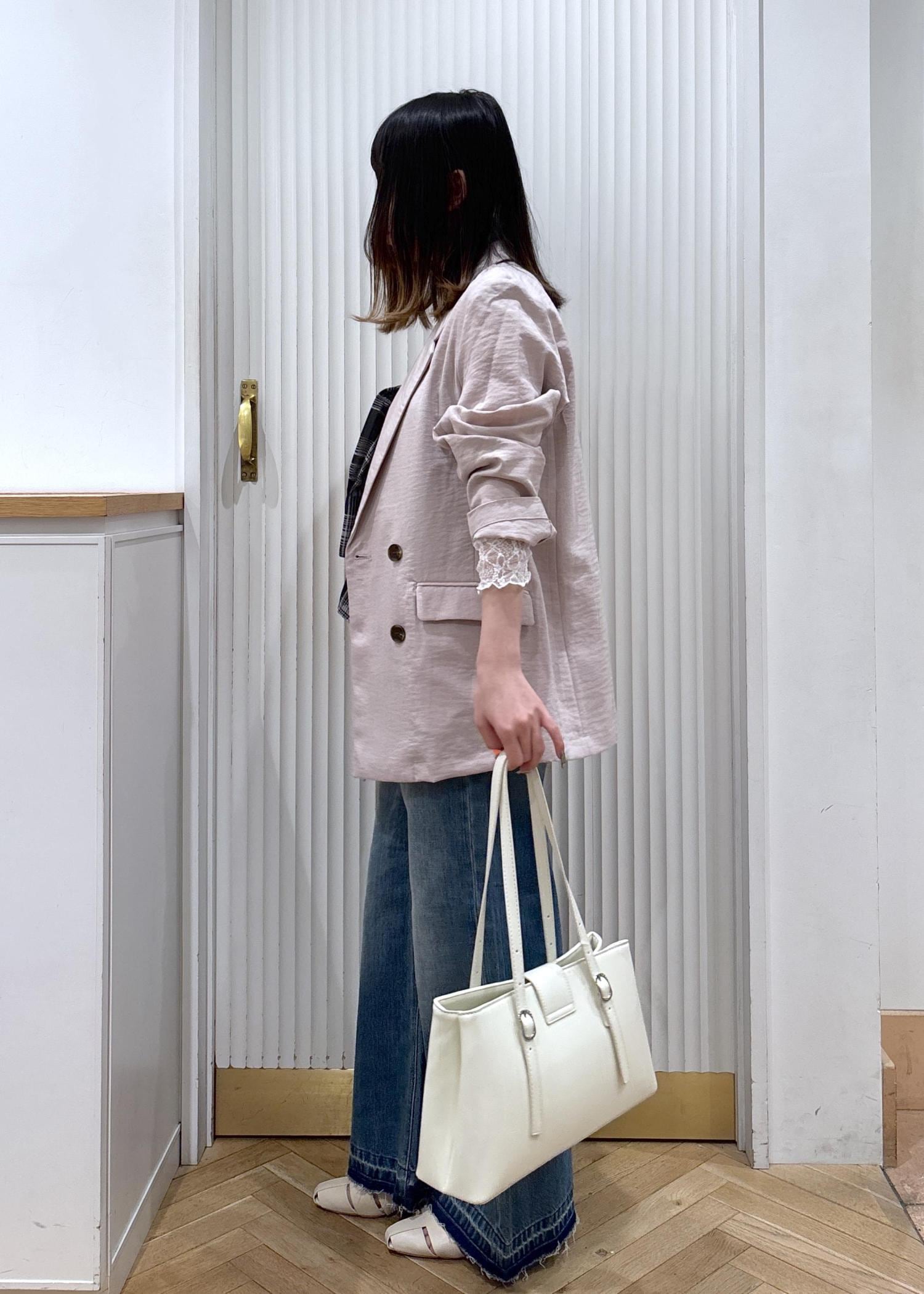 やわらかいピンクのジャケットで女性らしさをプラスしつつ、ワイドデニムで程よくカジュアルダウン。インナーのビスチェ風に巻いたブラウスがコーデのアクセントになってシンプルすぎないバランスになります!ホワイト小物で抜け感を出して、春っぽい軽やかな印象に仕上げたスタイリングです!
